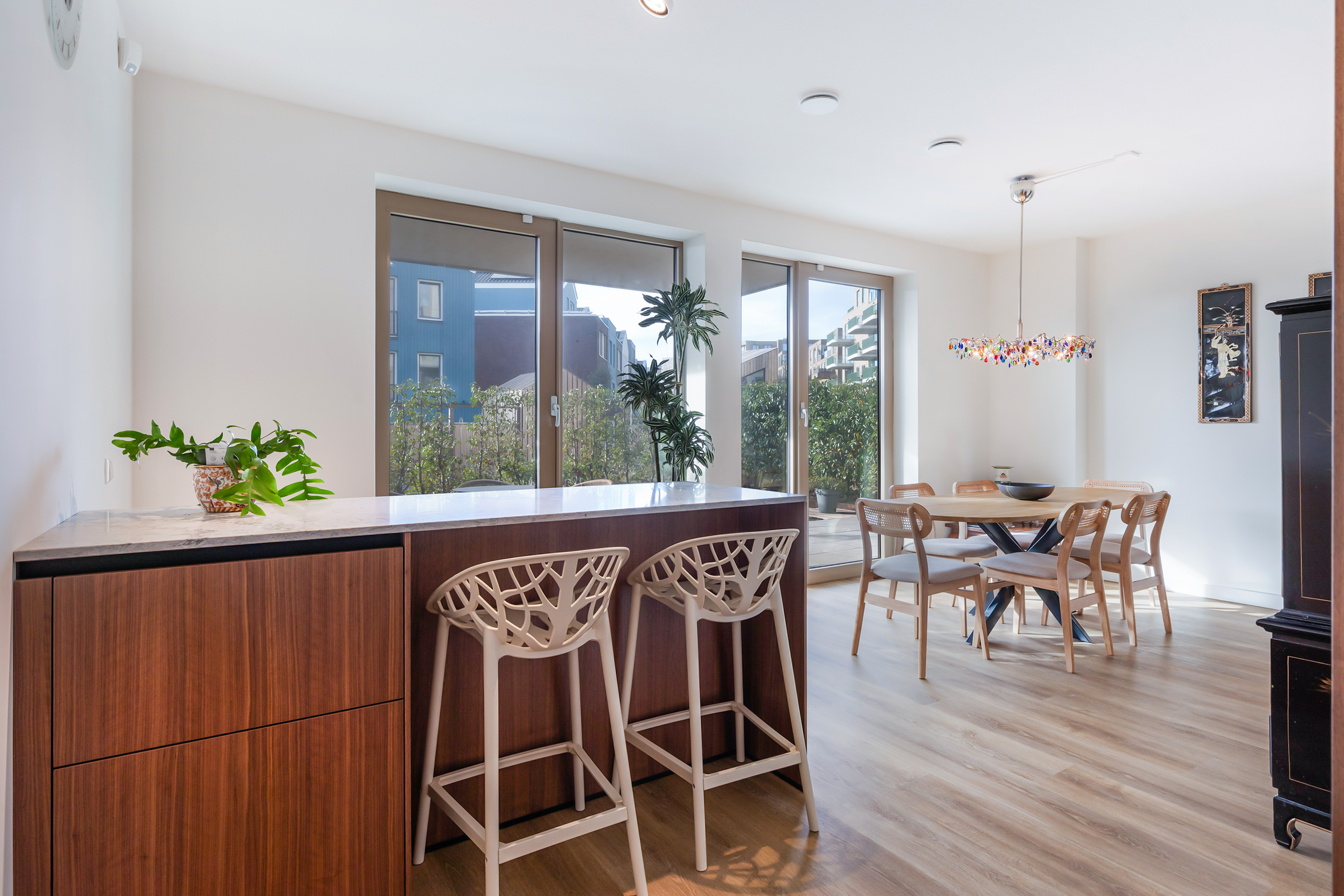 In the dining area stands a matching kitchen island with storage and a bar for two stools. This space lends itself perfectly to long dinners, relaxed evenings with guests, or a quiet breakfast overlooking the garden. The generous dimensions easily accommodate a large dining table.