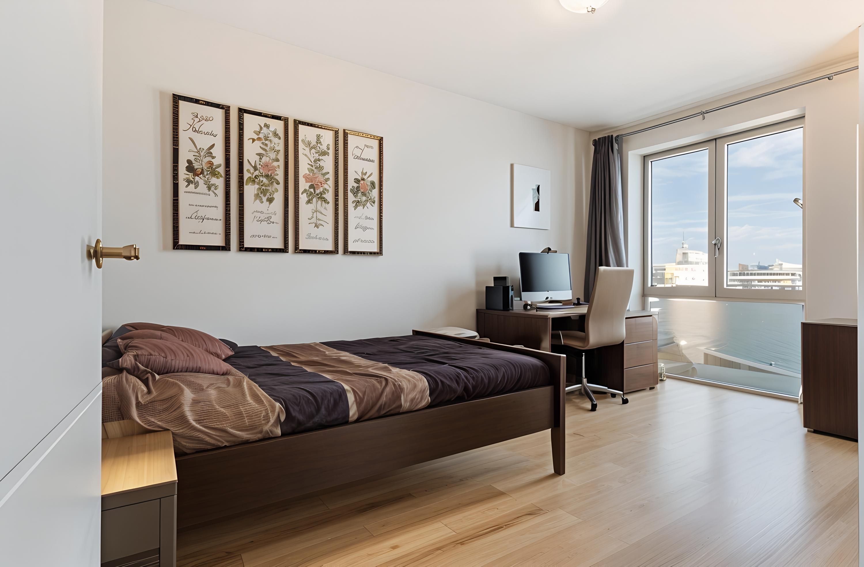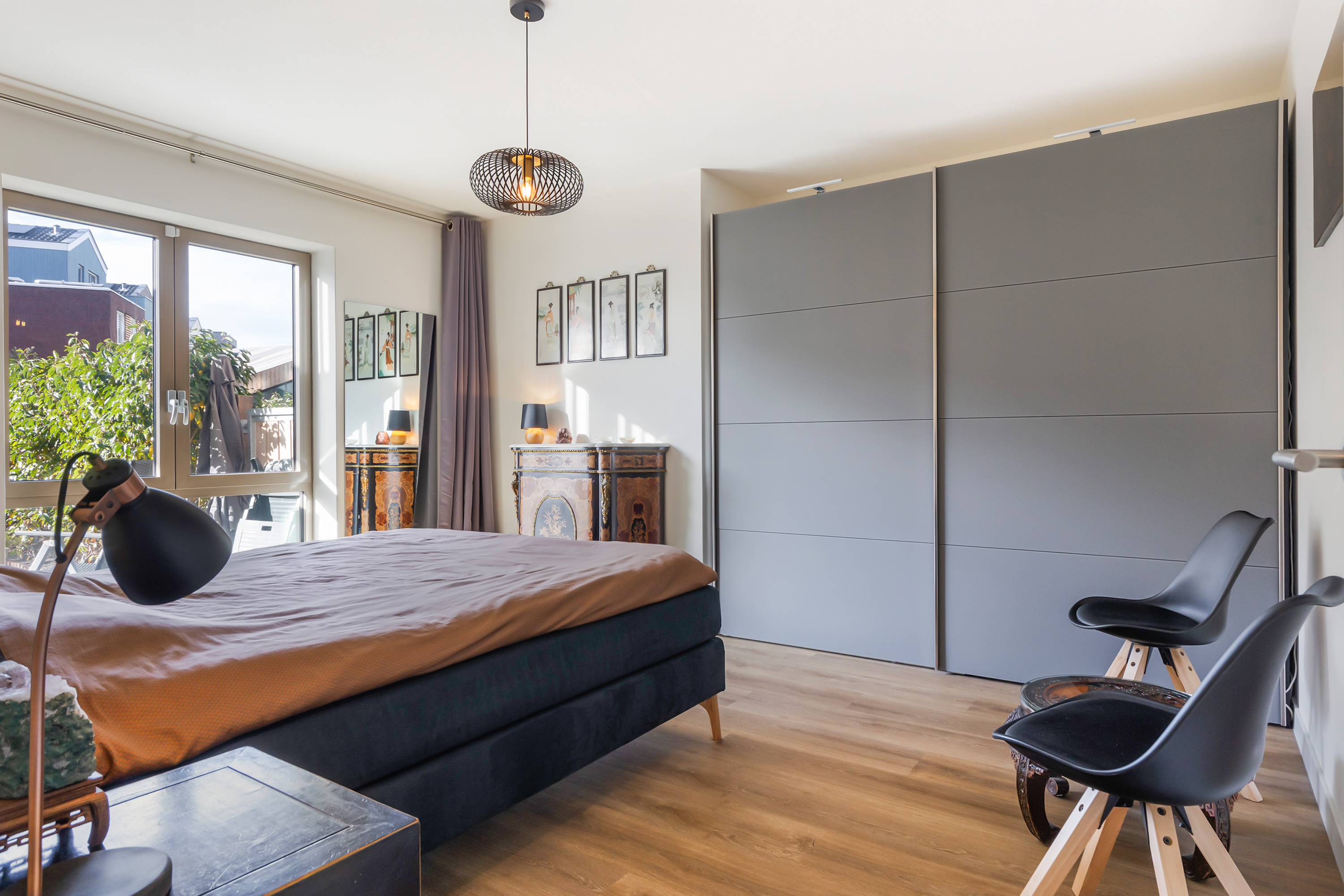 The living room, with its bay window and French balconies, is oriented towards the harbour and the sea. Thanks to the corner position and large glazed surfaces, you enjoy panoramic views that shift with the light throughout the day. The room offers excellent possibilities for a generous lounge arrangement, such as a large corner sofa paired with inviting armchairs facing the bay window. The view itself becomes a living artwork, continuously enhancing the atmosphere.