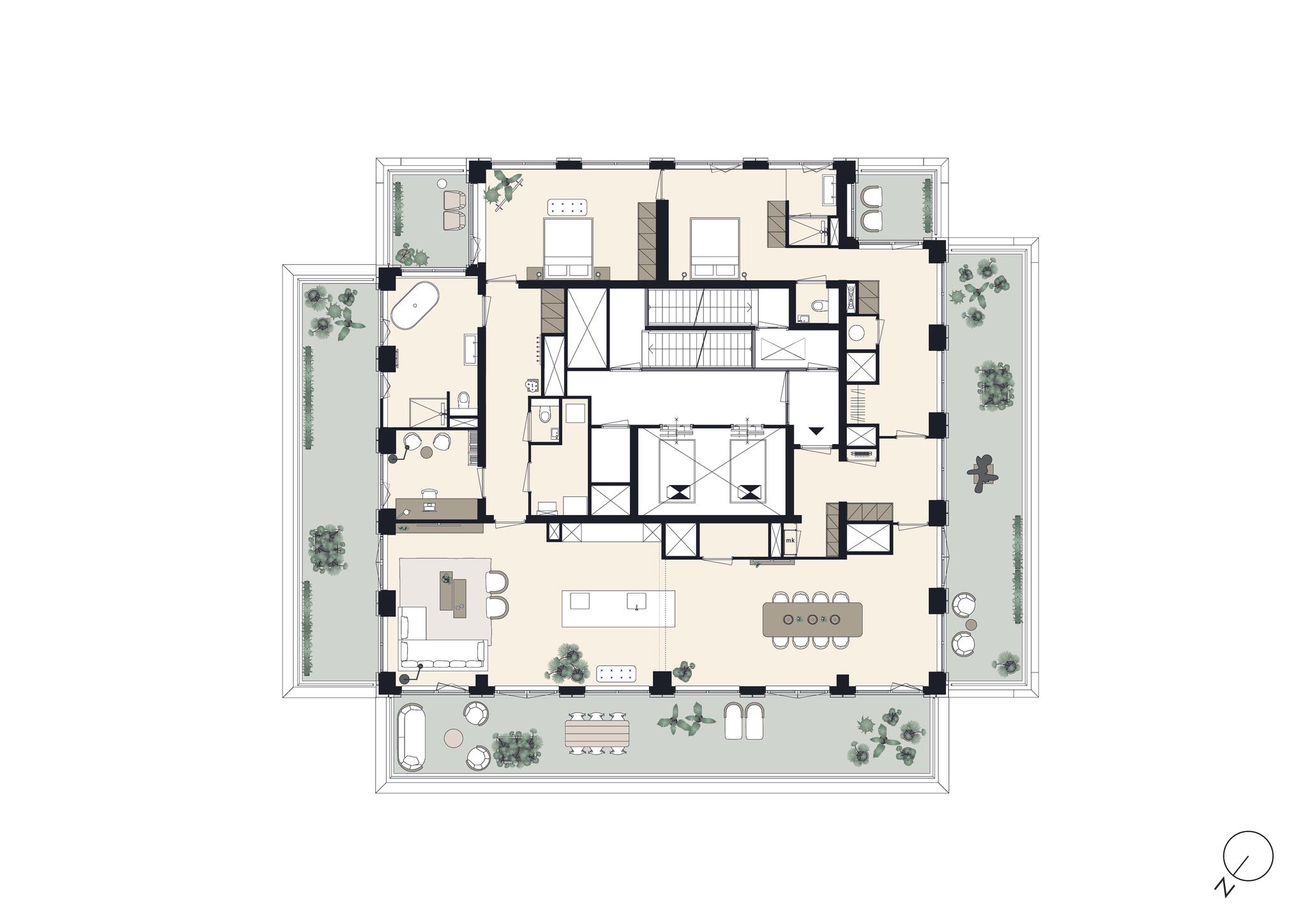 This penthouse in Tower East of KJ The Hague spans the entire 28th floor, offering you 360-degree views. With a generous living area of 203 m² and rooftop terraces totalling approximately 130 m², you’ll enjoy unparalleled space and privacy. There are two separate ‘wings’ with bedrooms and private bathrooms — perfect for family or guests. The front of the residence, facing the park, features a spacious living area designed for relaxing, cooking, and entertaining.