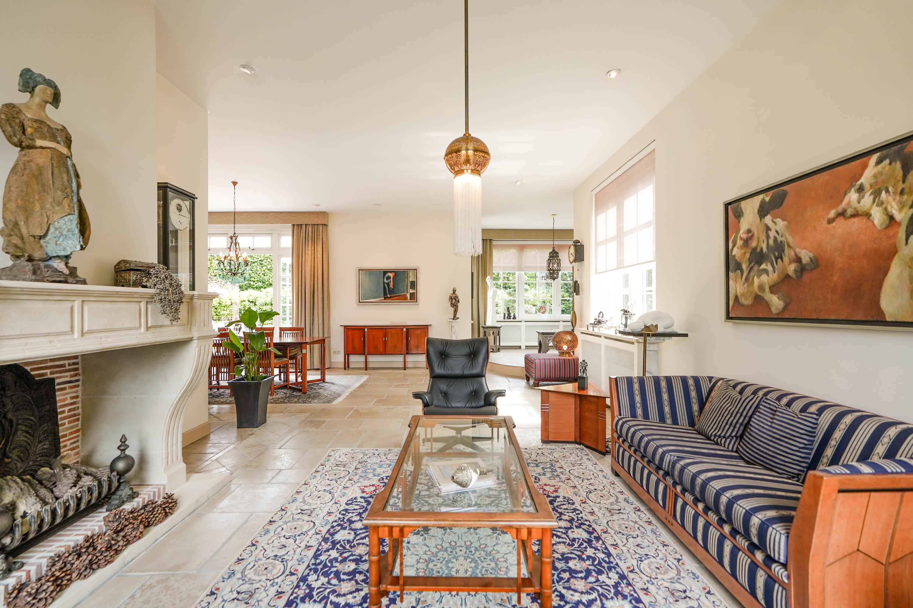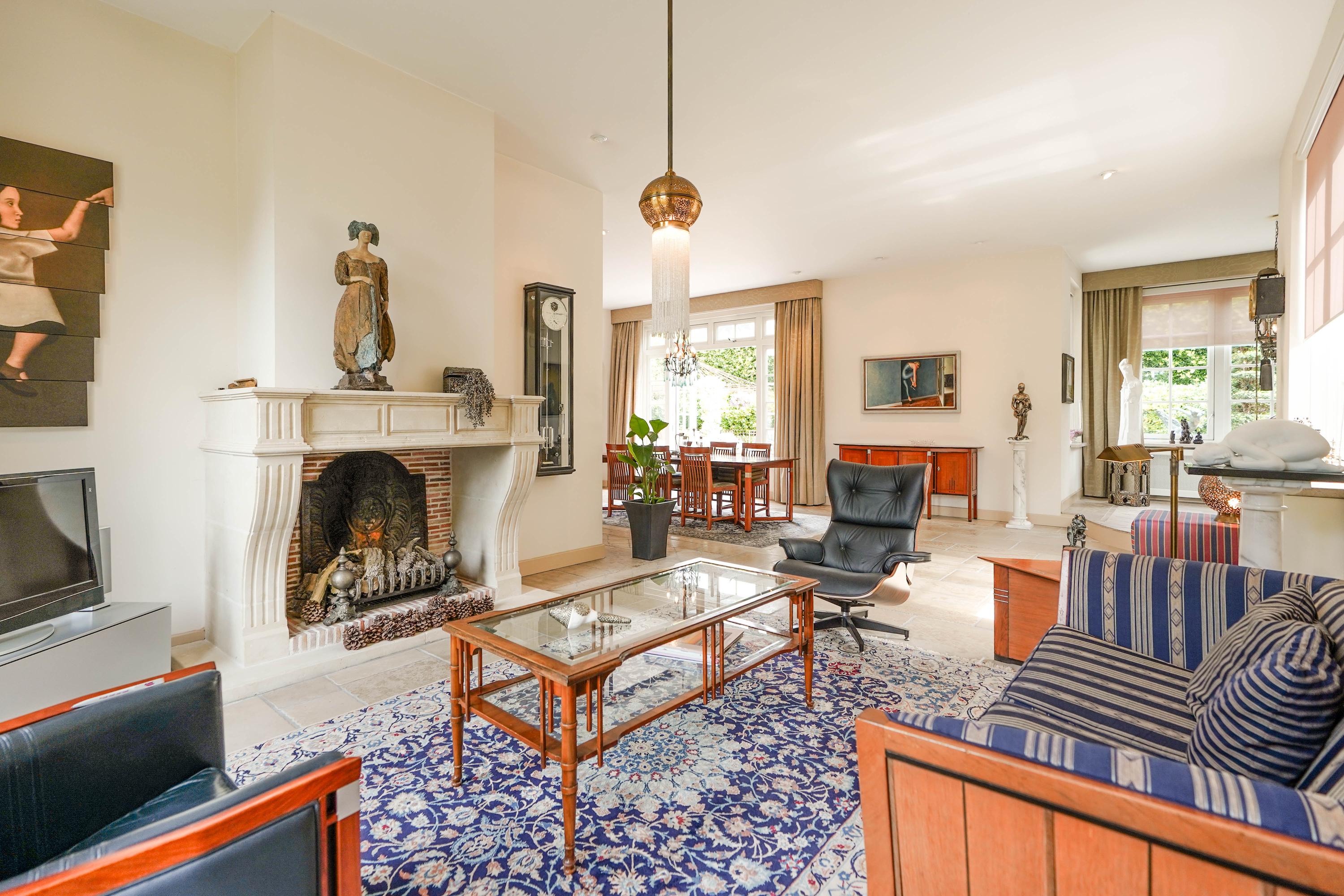 De L-vormige living heeft een plafondhoogte van 3,10 meter. De serre met verhoogd podium voegt een sfeervolle, extra dimensie toe. Een dubbele pui geeft toegang tot de tuin. De ramen op de zuid- en westkant zijn voorzien van zonwerende rolgordijnen. In het plafond zijn 15 inbouwspots aangebracht. De monumentale, Franse open haard werkt op gas.