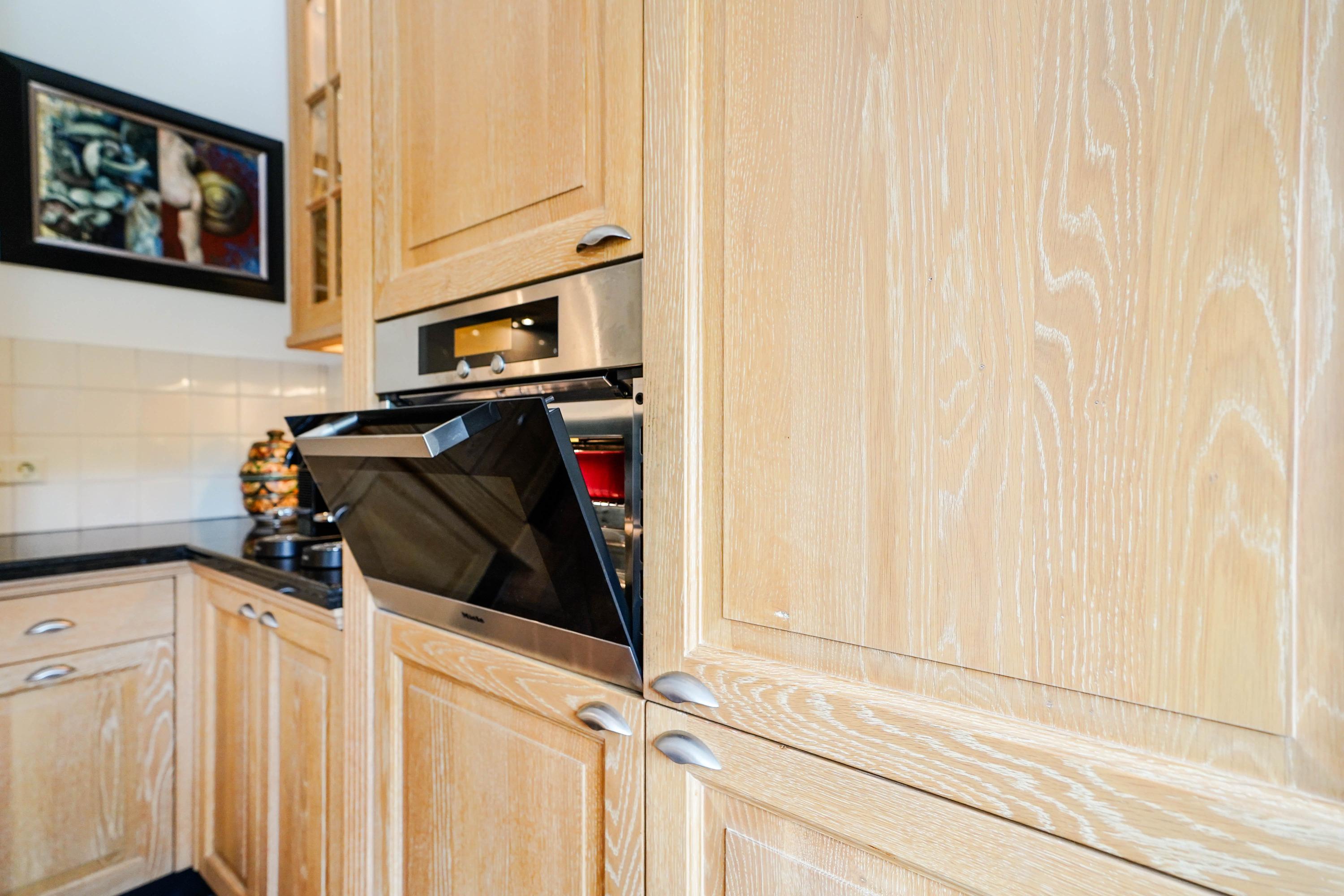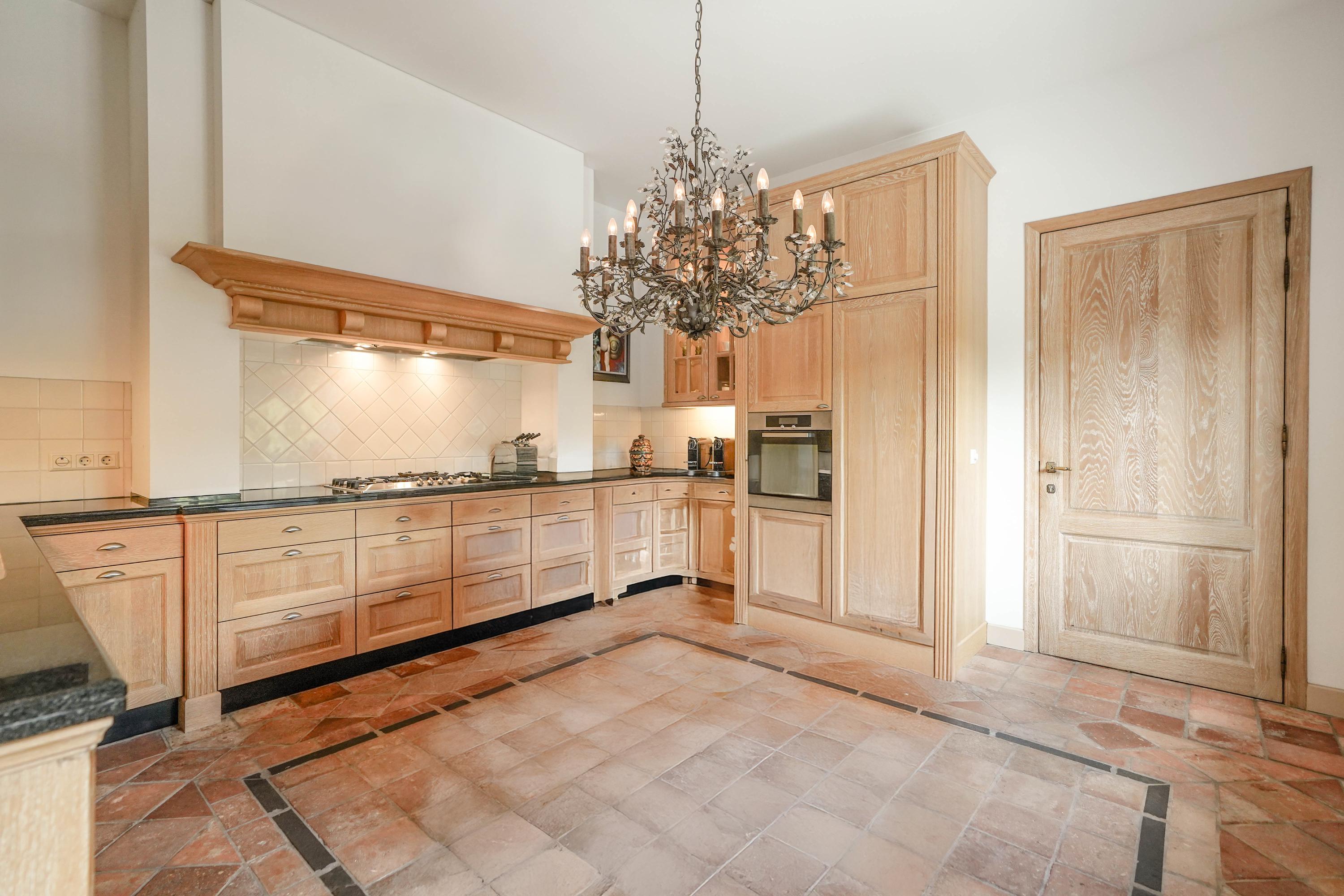 De keuken aan de tuinkant is via een vrije inloop vanaf de woonkamer te betreden en voorzien van Miele apparatuur en een Quooker voor heet water. De ambachtelijk vormgegeven schouw, de cannelures in de kolommen, de gepolijste, hardstenen aanrechtbladen en de antieke, Franse plavuizen geven de keuken een landelijke allure.