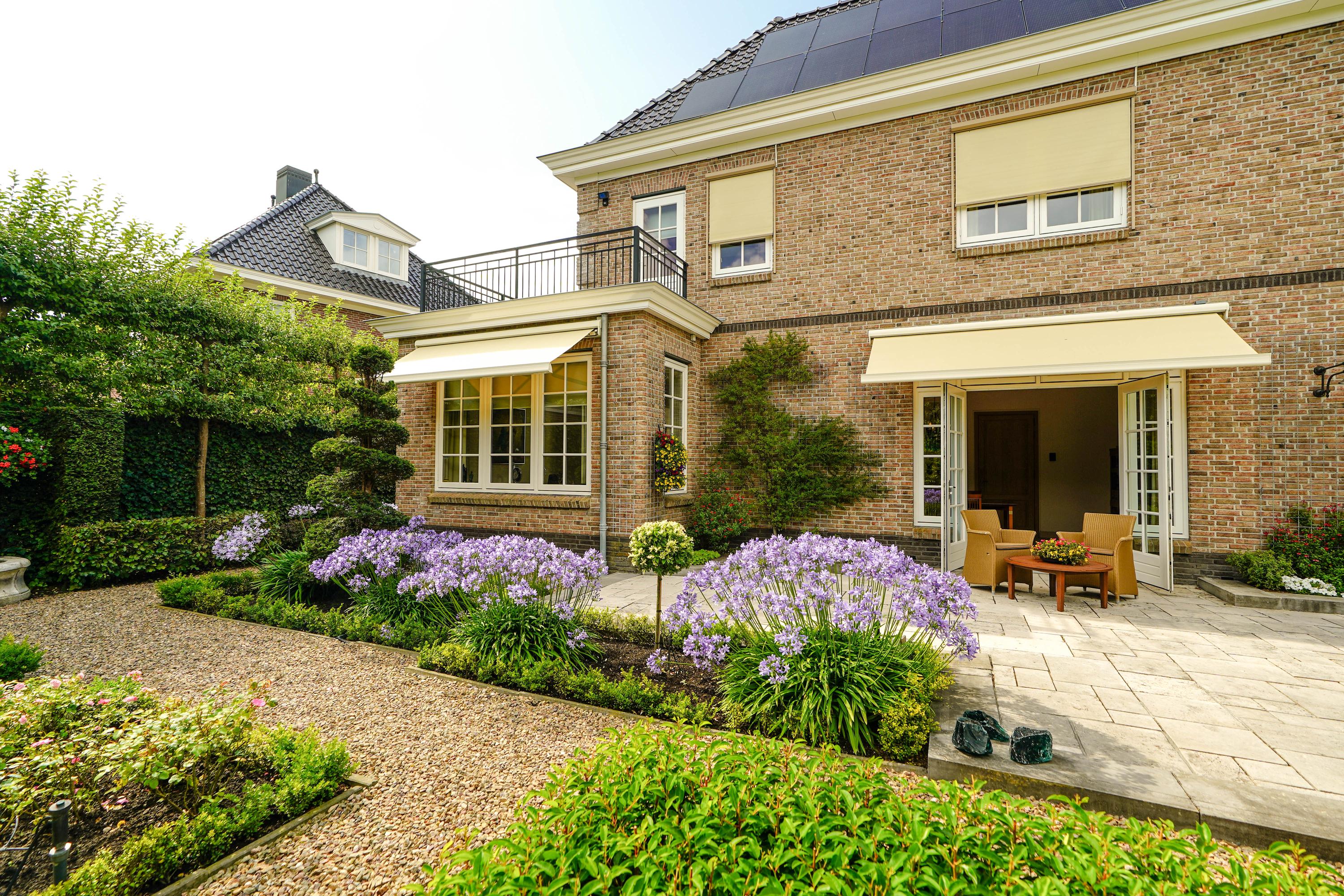 - Elektrisch op afstand bediende zonneschermen bij vrijwel alle ramen aan de tuinkant