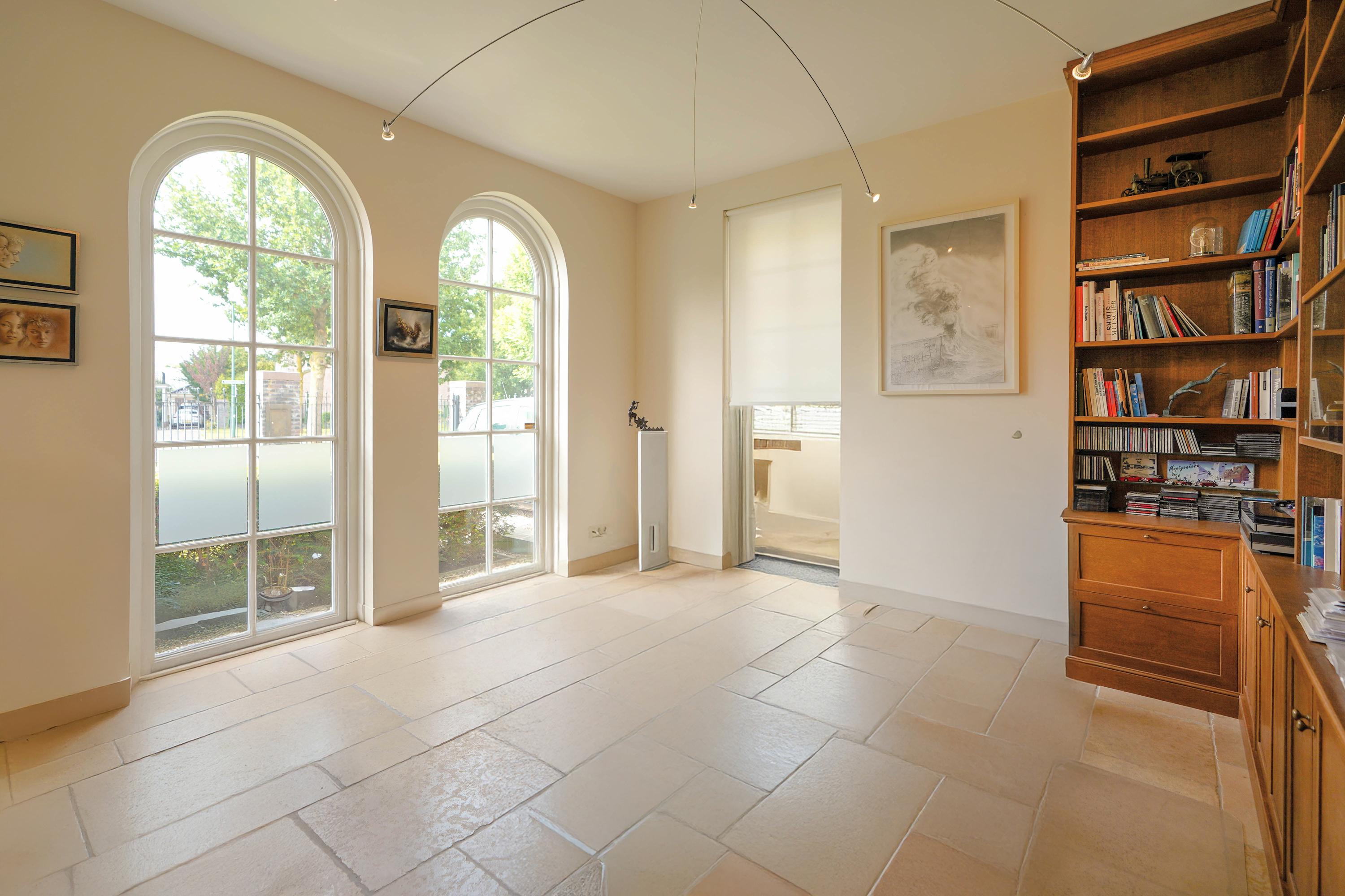 De werkkamer heeft twee ramen aan de straatkant en een zijraam aan de oprit. Zakelijke relaties kunnen gescheiden van het privé woongedeelte ontvangen worden.