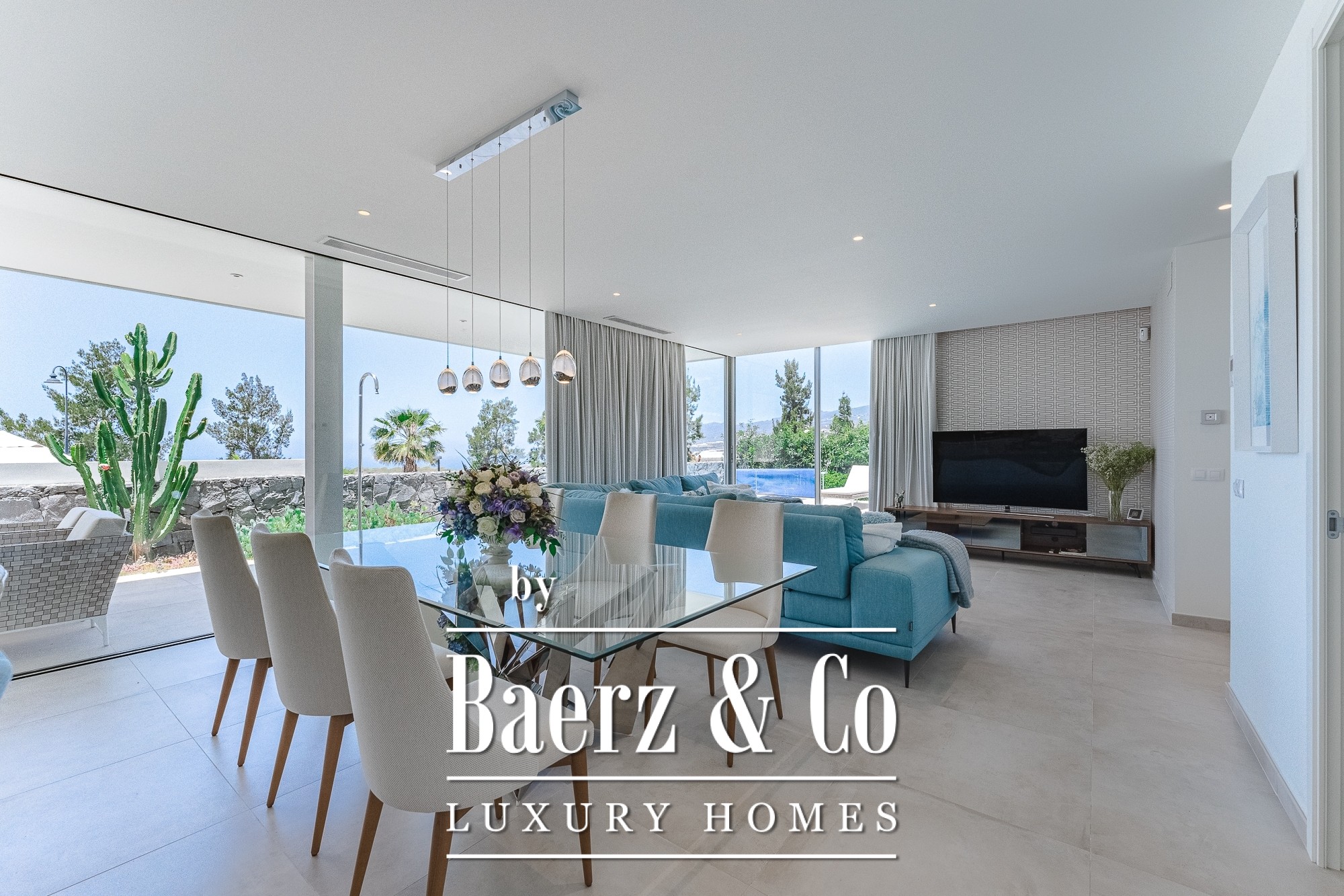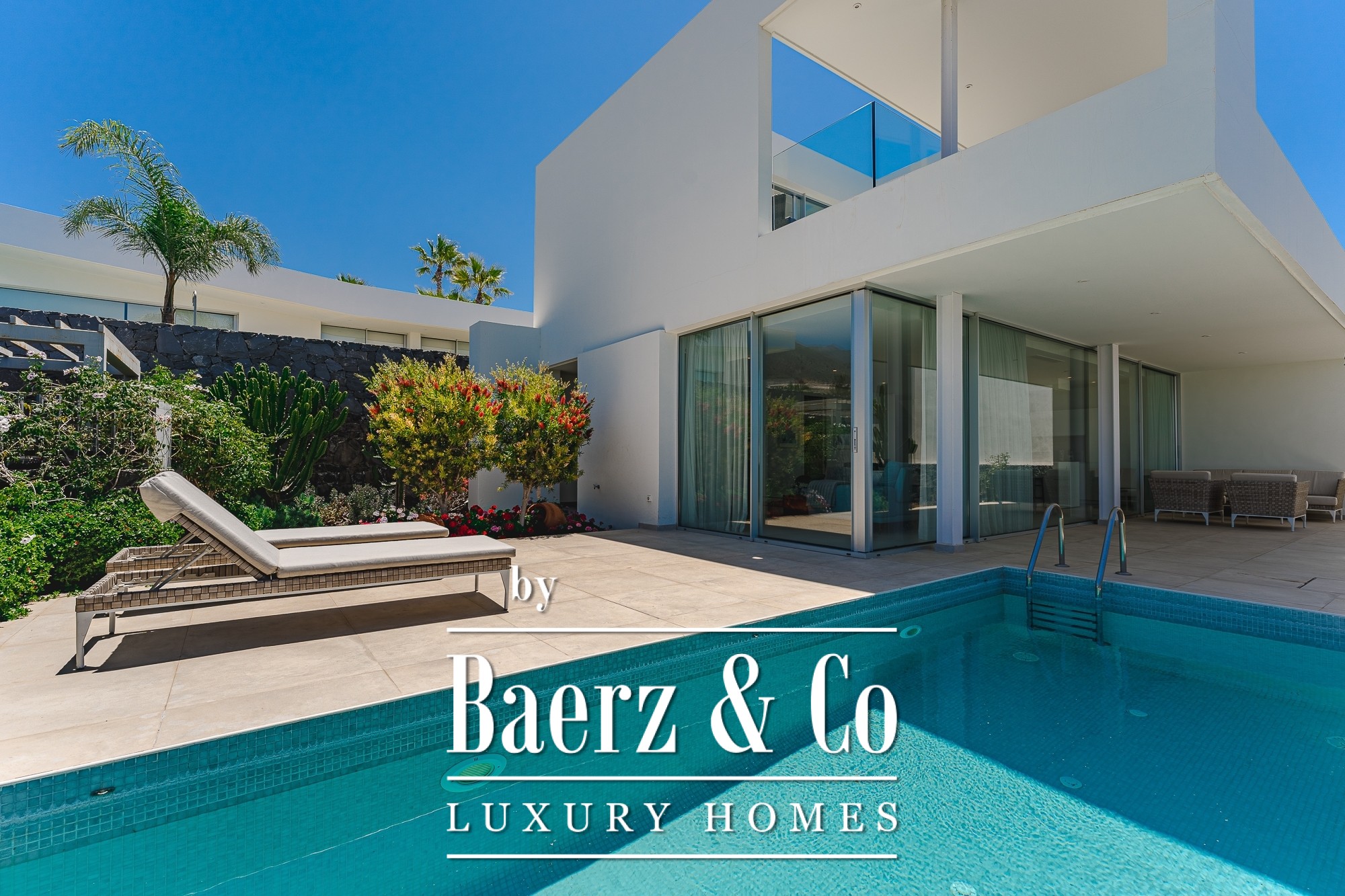 On the ground level, a fully equipped kitchen with premium appliances flows seamlessly into a spacious living area. Floor-to-ceiling windows anchor the space to the sea views and open directly onto a garden and heated swimming pool. Upstairs, two bedroom suites with fitted wardrobes continue the interplay between openness and retreat. The orientation ensures sweeping views across the Atlantic to La Gomera, imbuing the home with rare serenity. Outside, a landscaped garden with automatic irrigation and a carport add both beauty and practicality.