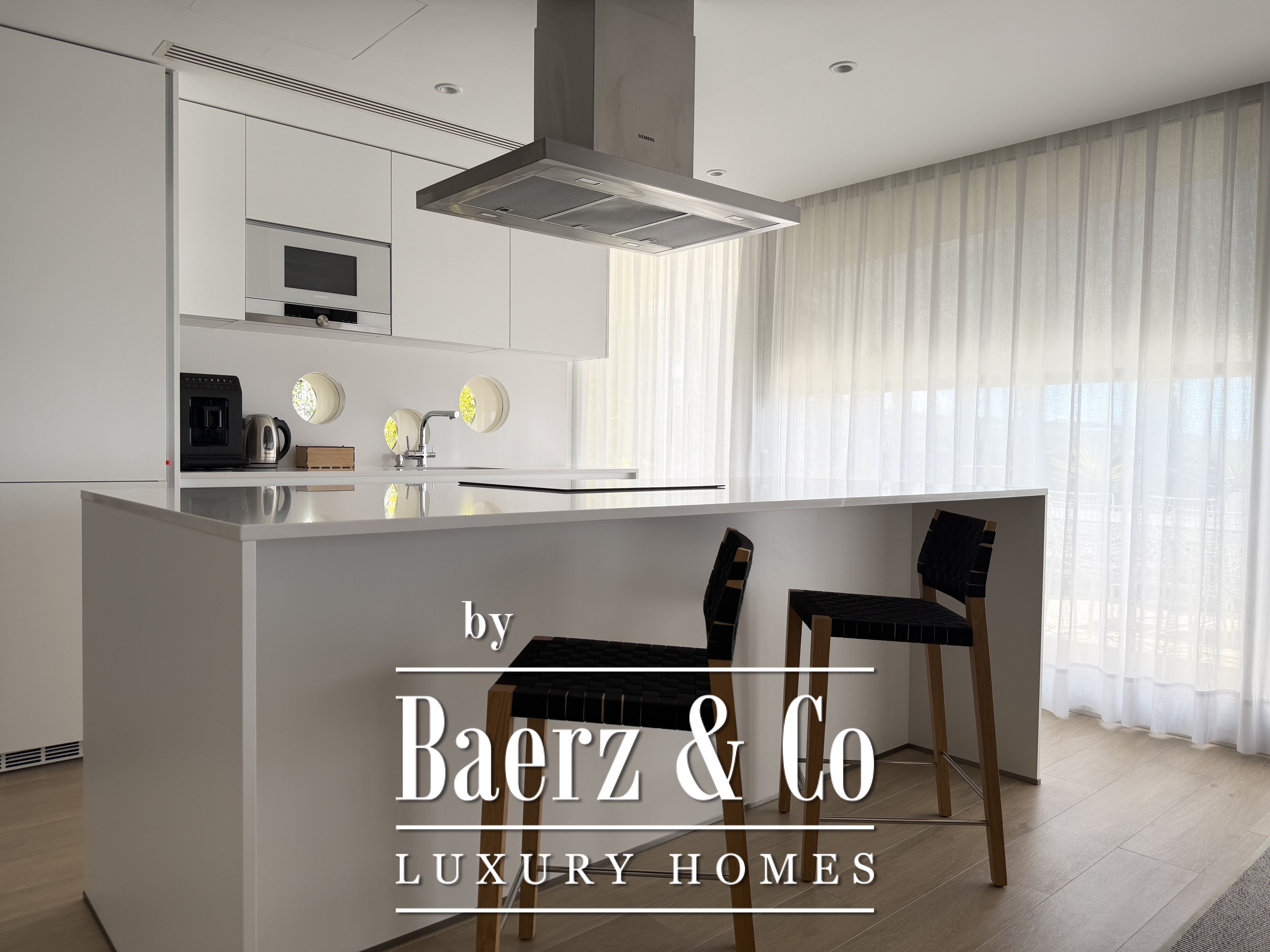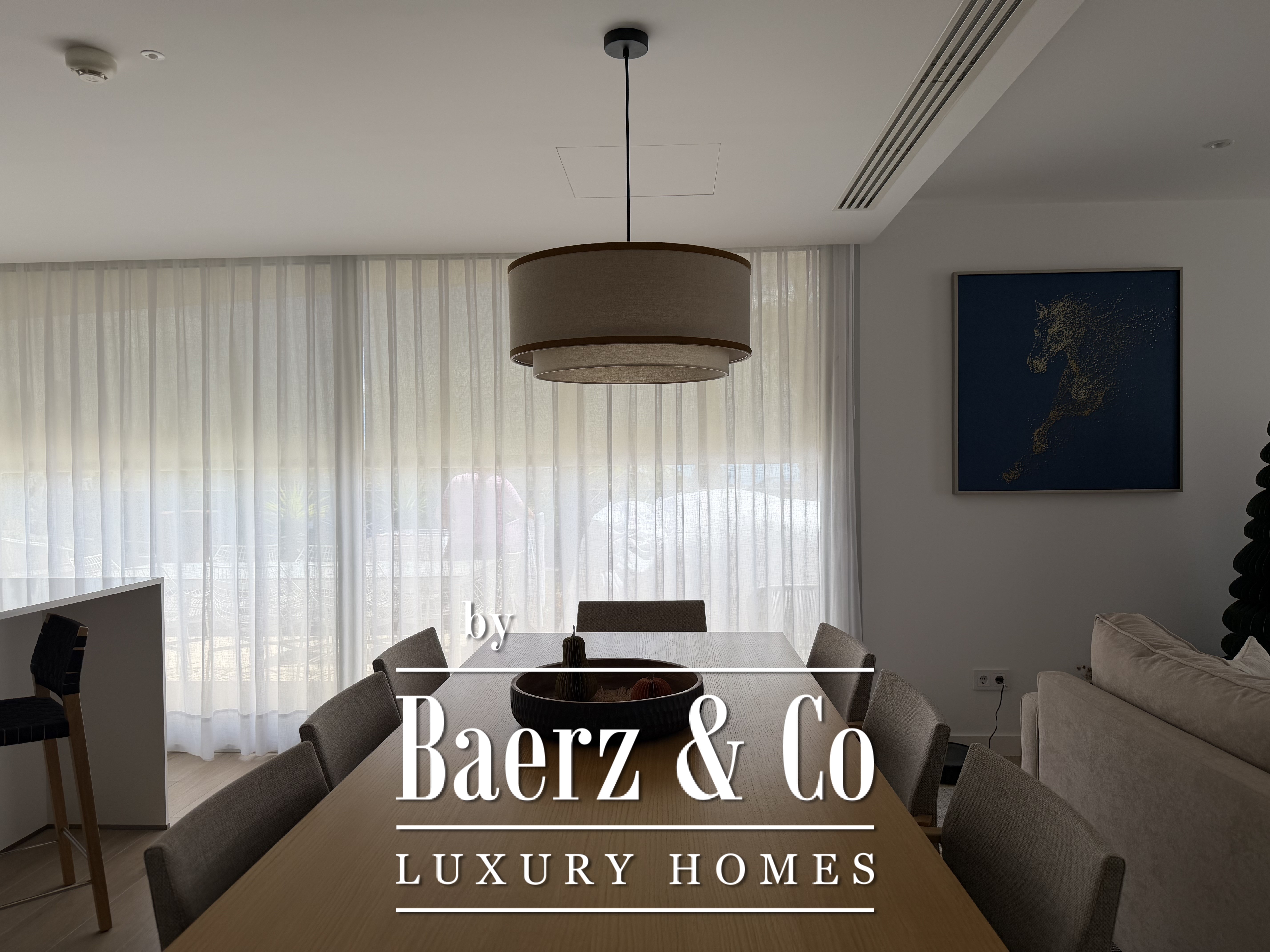 Natural light fills the interiors through expansive windows, framing the horizon and creating seamless access to the terrace and landscaped garden. Three bedrooms offer dressing rooms, while two bathrooms feature modern showers, underscoring the emphasis on refined functionality. The bright living room invites relaxation, whether enjoying a quiet moment or sharing the space with guests.