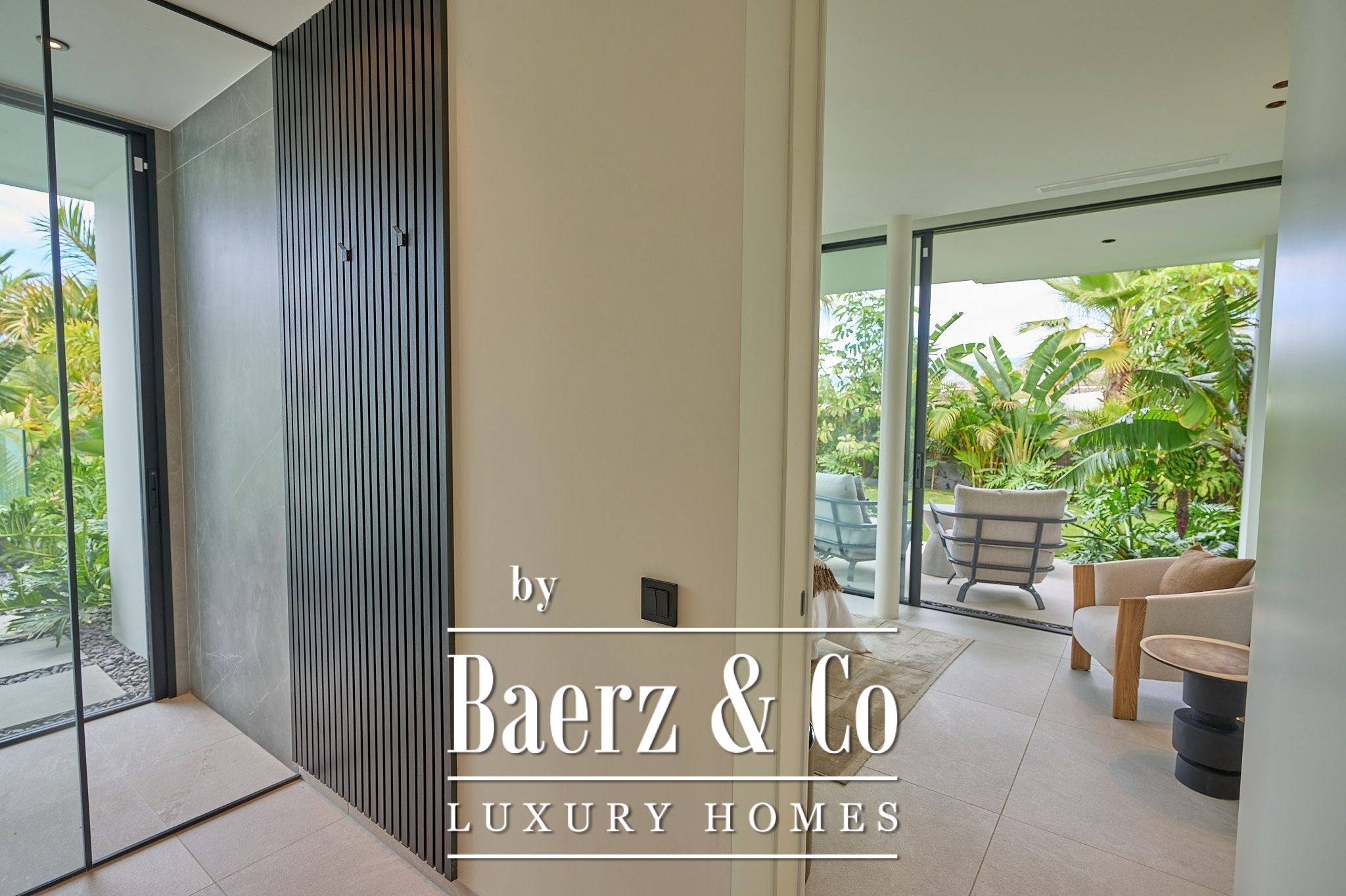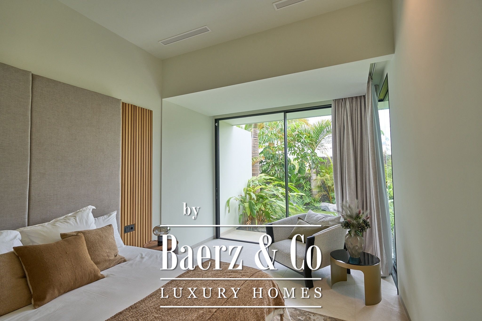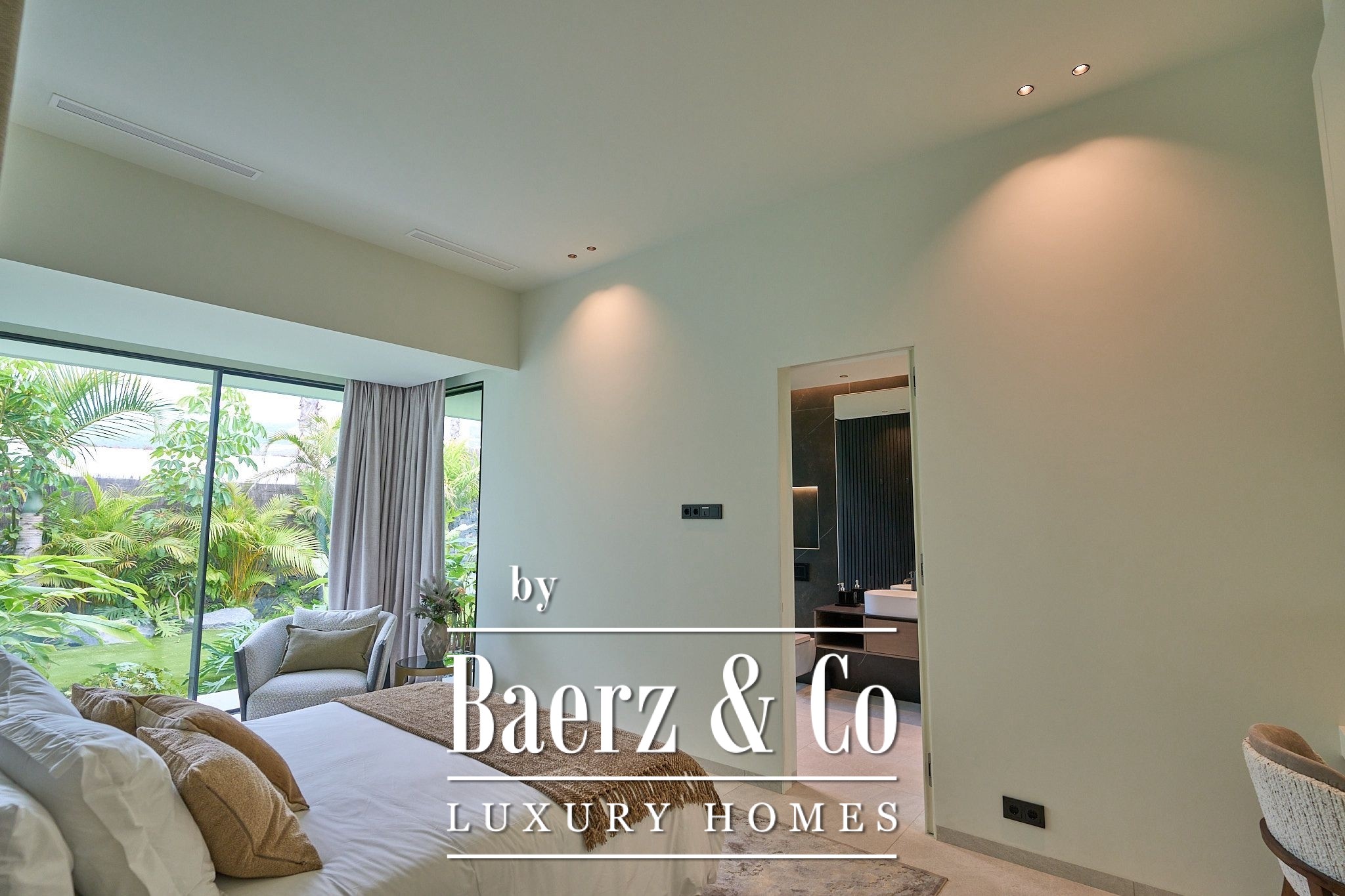 The villa features four en-suite bedrooms, each with built-in wardrobes and private access to lush tropical gardens that elevate the sense of space and tranquility. Upstairs, the spacious living and dining area flows naturally into a modern, fully equipped kitchen complemented by a climate-controlled wine cellar, while expansive windows amplify natural light and connect seamlessly to the exterior.