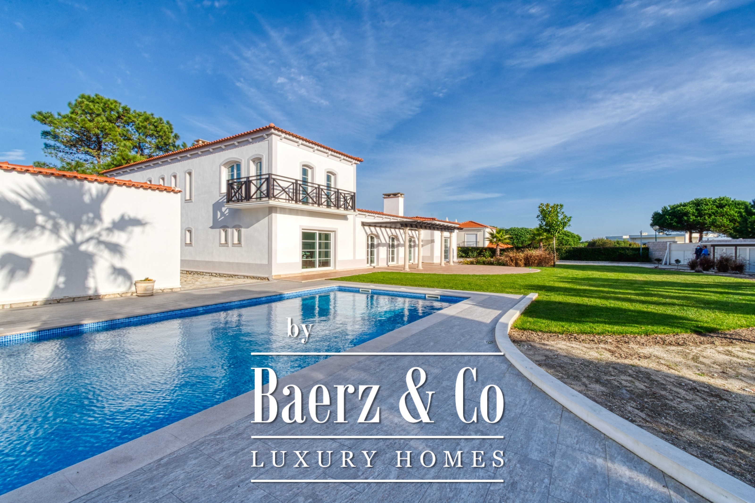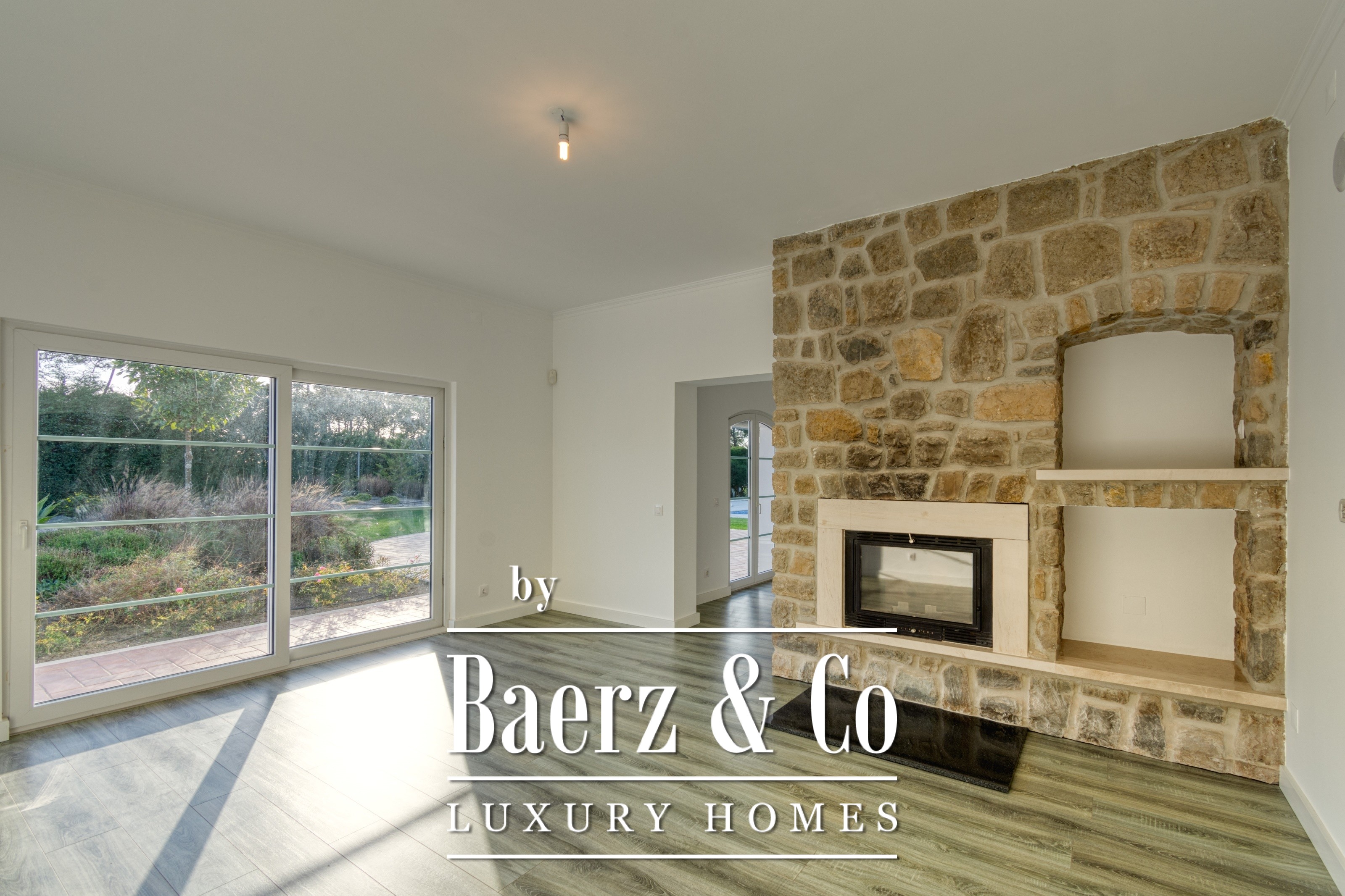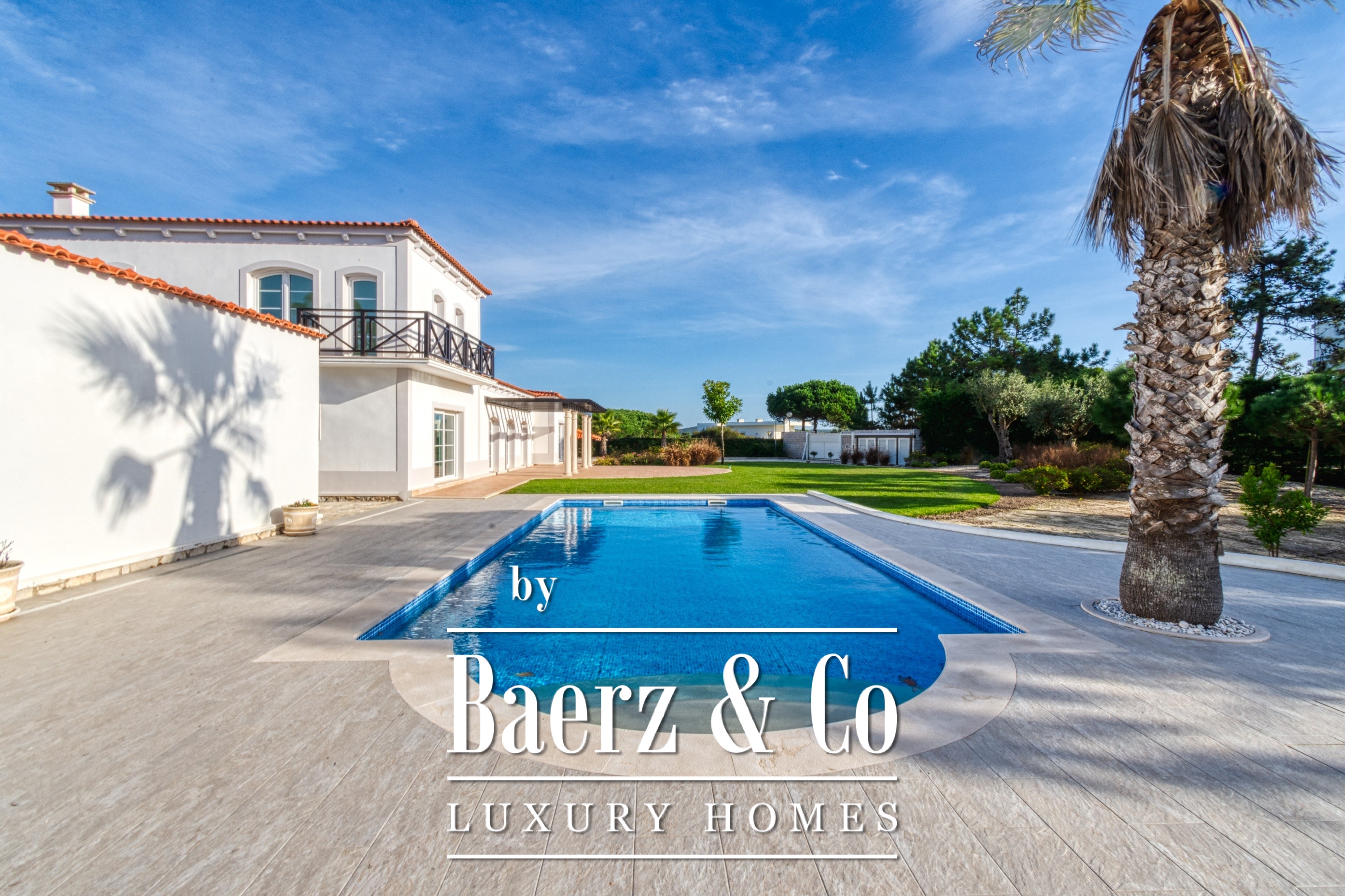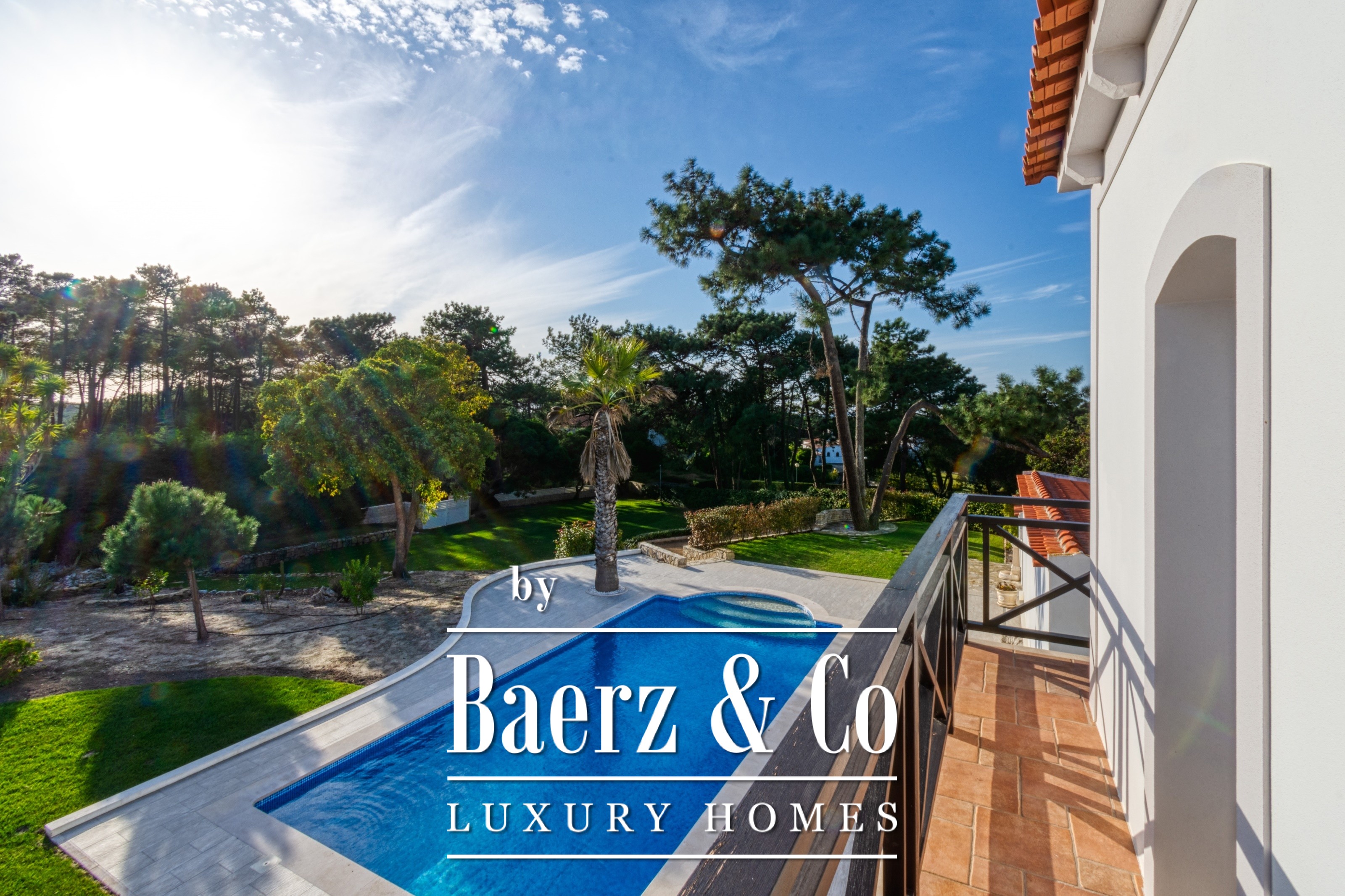 Outdoors, landscaped gardens surround the property, complemented by a 54 m² swimming pool, a barbecue pavilion, and a 70 m² garage prepared for future wellness spaces. Solar panels, central heating, and a private water source speak to thoughtful sustainability. With the beach a 10-minute walk away and Lisbon airport just under an hour’s drive, this villa offers a rare combination of privacy, scale, and privileged access along Portugal’s west coast. For those seeking a luxury villa for sale in Praia D'El Rey Golf & Beach Resort, the setting makes each day quietly remarkable.