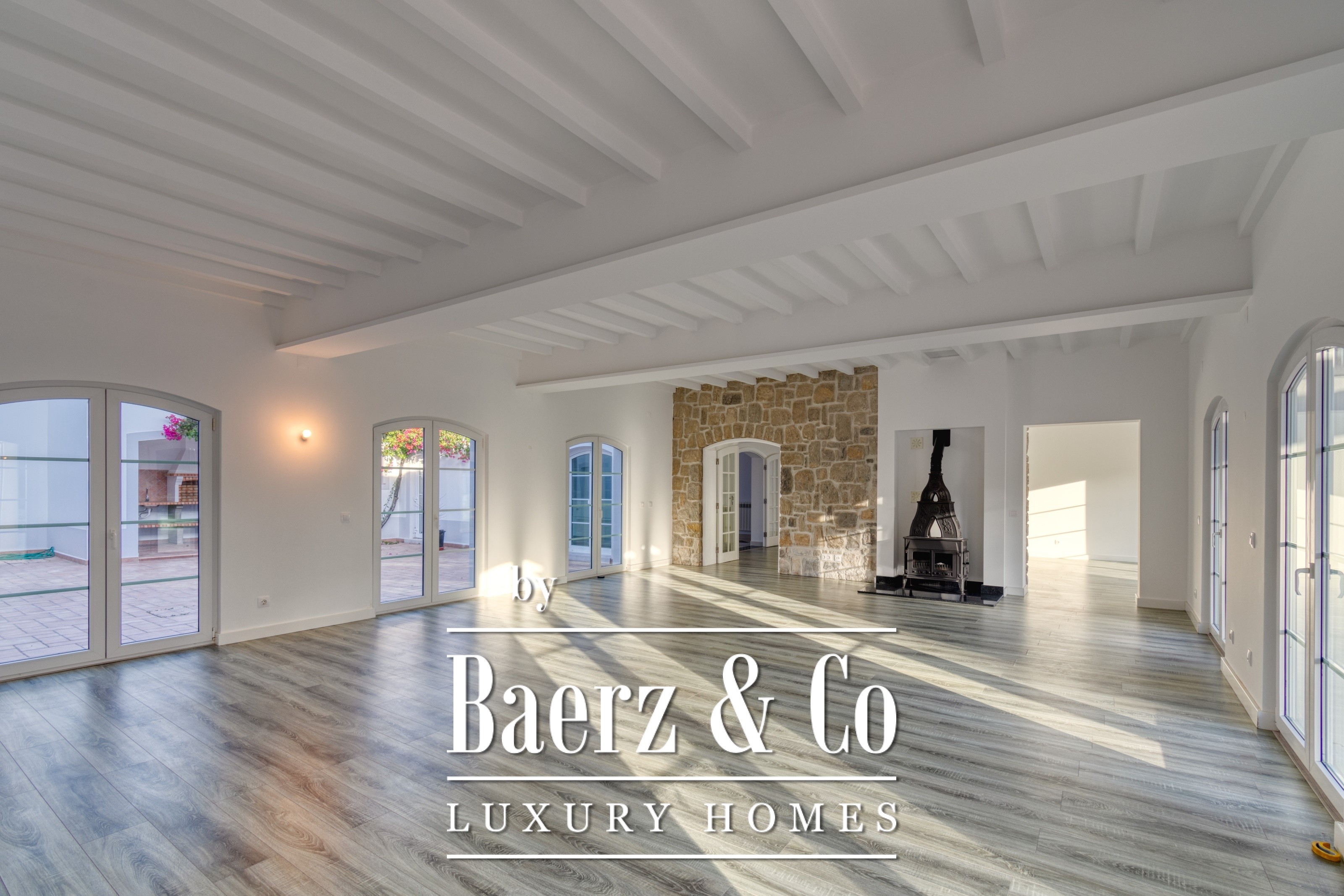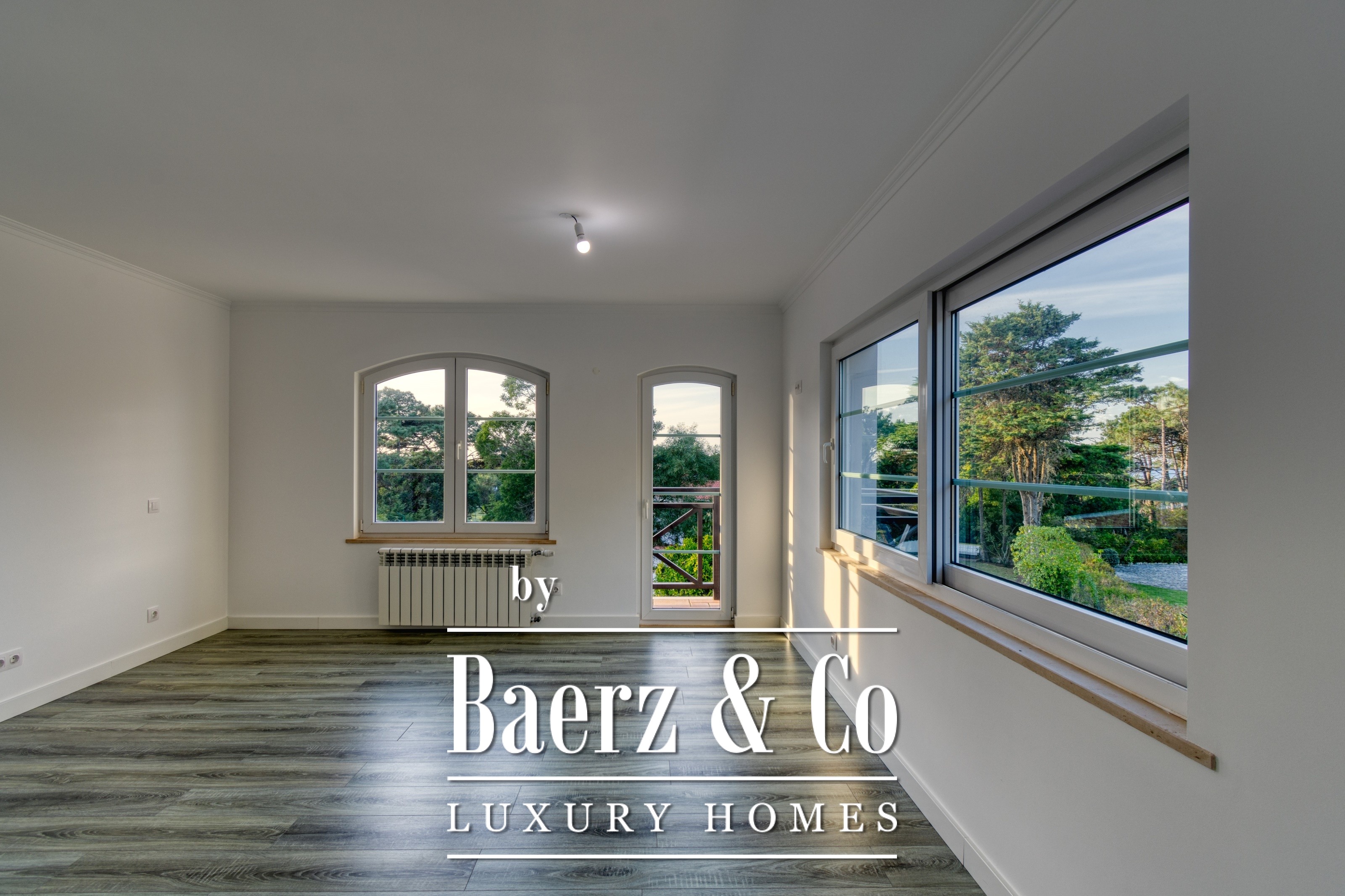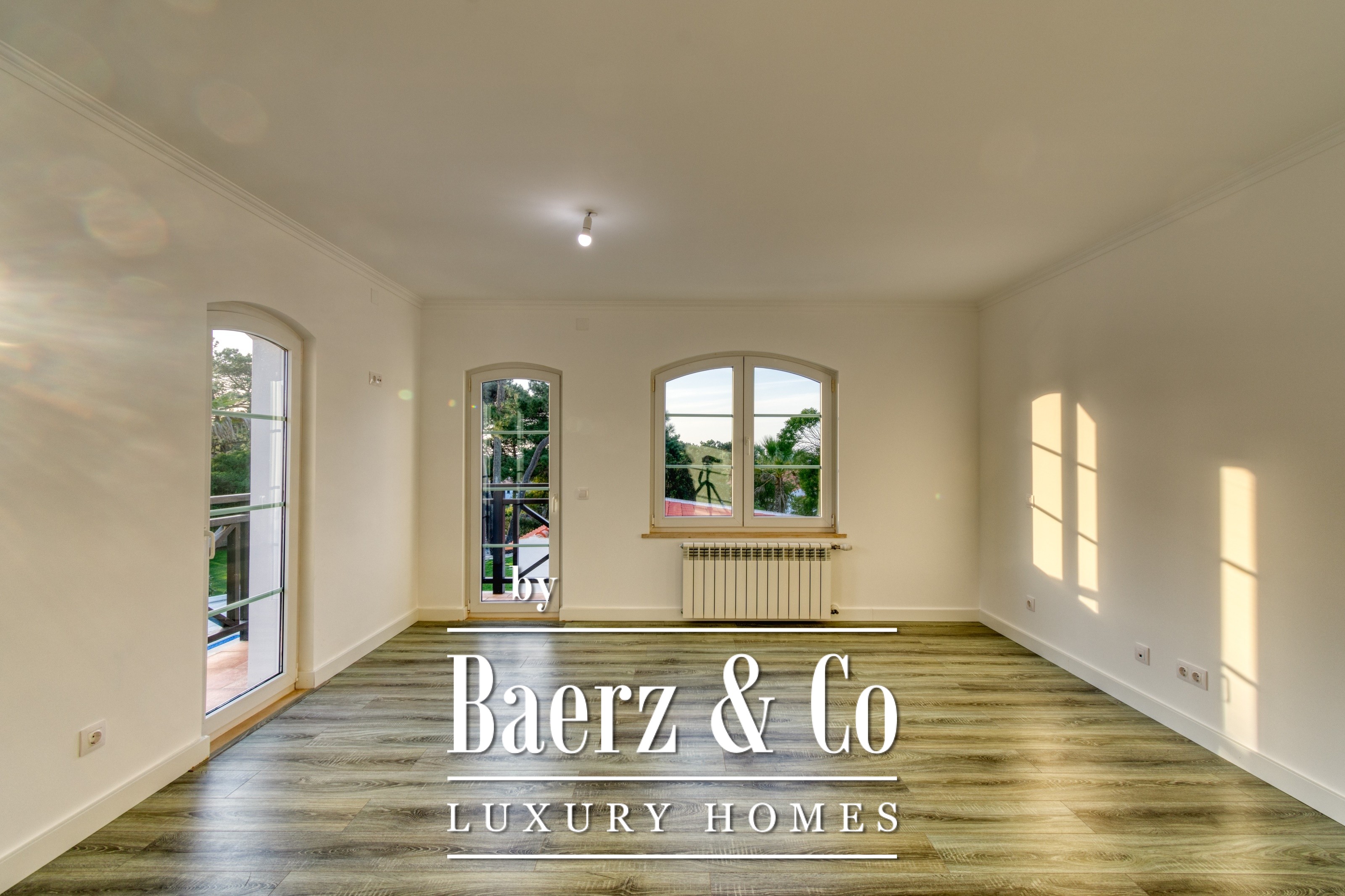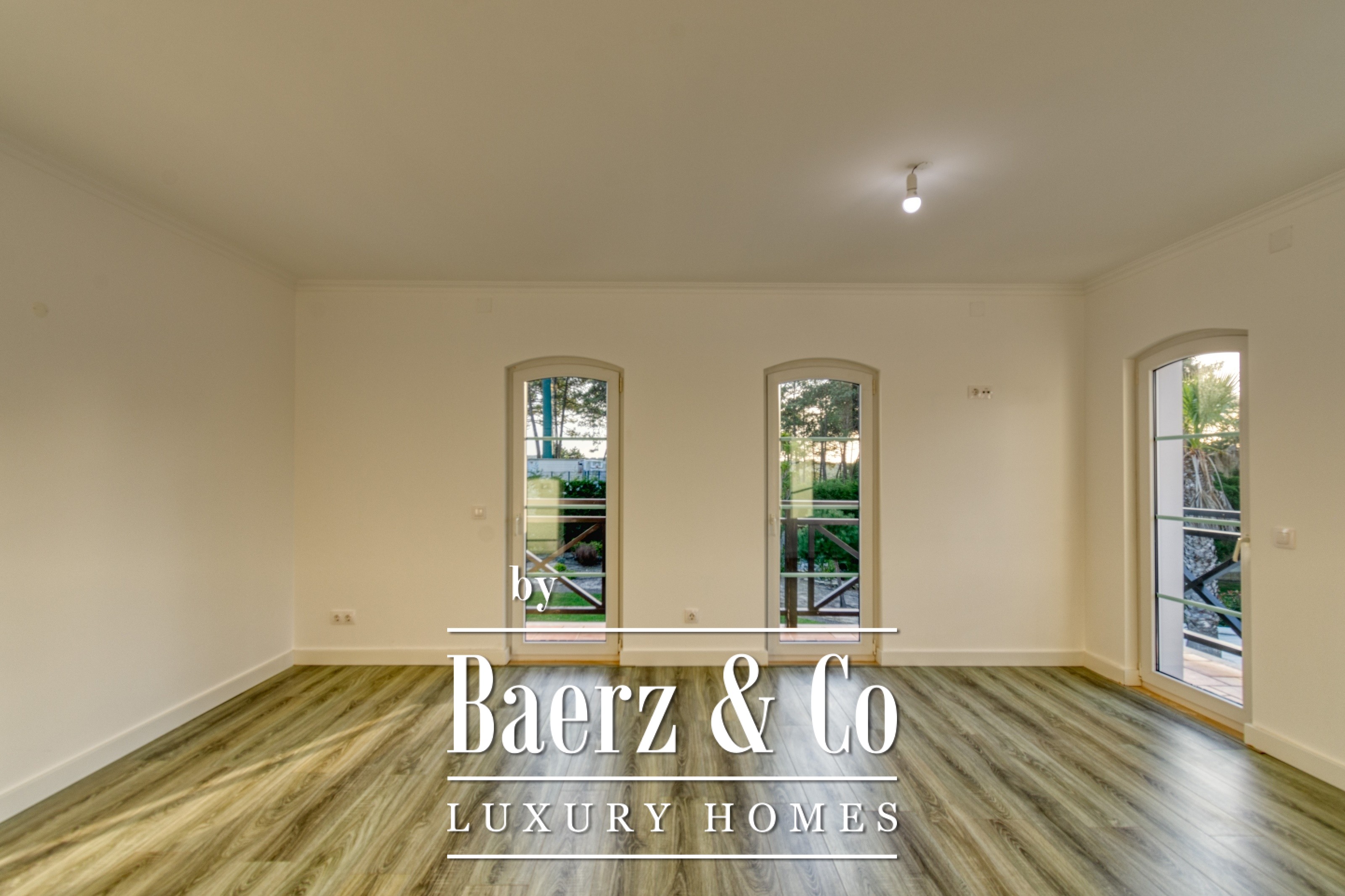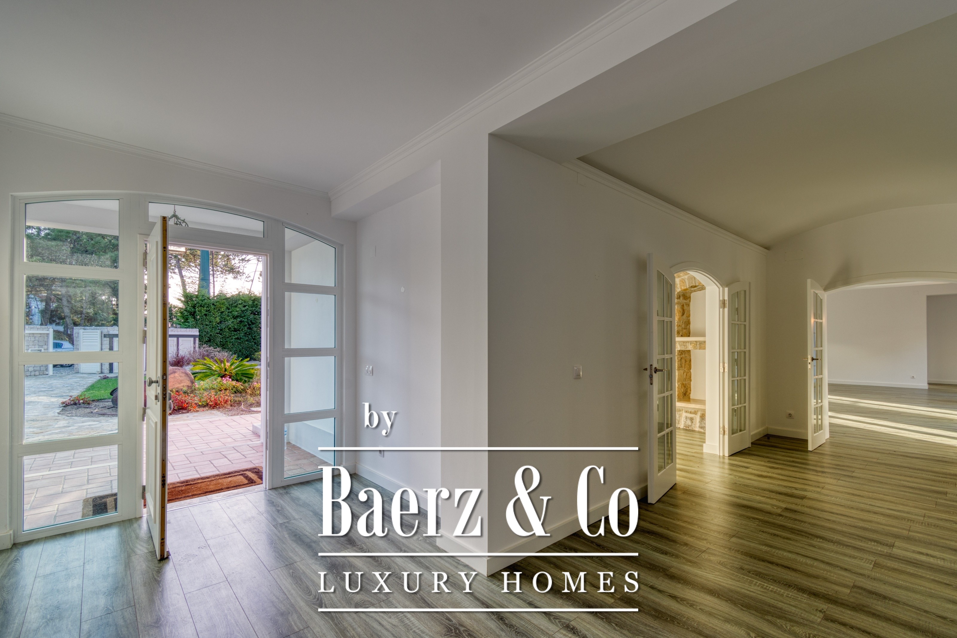 Outdoors, landscaped gardens surround the property, complemented by a 54 m² swimming pool, a barbecue pavilion, and a 70 m² garage prepared for future wellness spaces. Solar panels, central heating, and a private water source speak to thoughtful sustainability. With the beach a 10-minute walk away and Lisbon airport just under an hour’s drive, this villa offers a rare combination of privacy, scale, and privileged access along Portugal’s west coast. For those seeking a luxury villa for sale in Praia D'El Rey Golf & Beach Resort, the setting makes each day quietly remarkable.