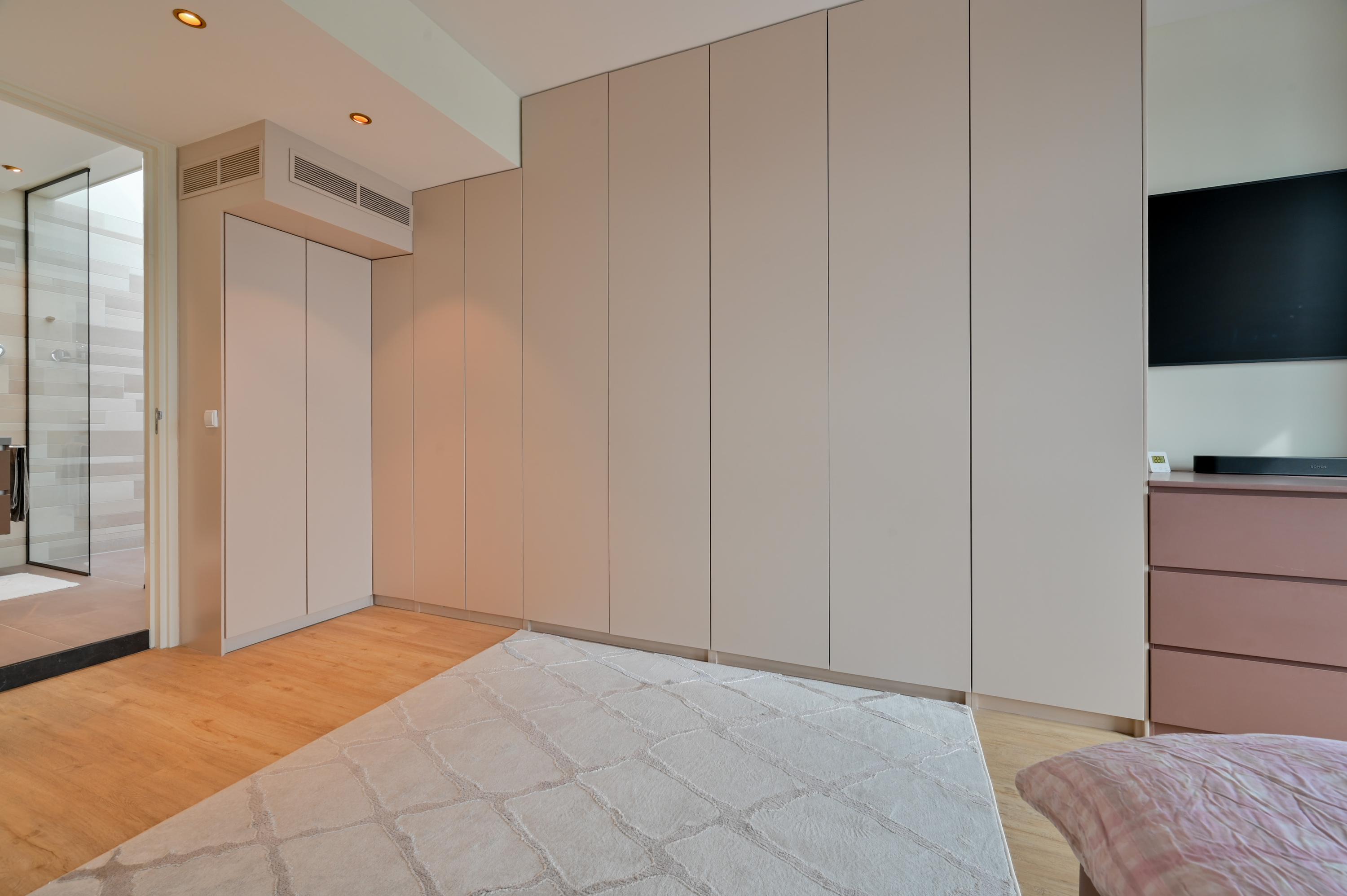 At the rear of the home, you will find the generous and luxurious open-plan kitchen, designed for both cooking and living. The kitchen features a central island with sink, a Quooker, dishwasher, combi ovens, induction hob with extractor, a large LG refrigerator with freezer and ice maker, a Liebherr wine climate cabinet, and extensive storage space. A built-in bench at the large dining table creates a cozy seating area, while double French doors provide access to the spacious terrace garden, where light, space, and tranquility come together.