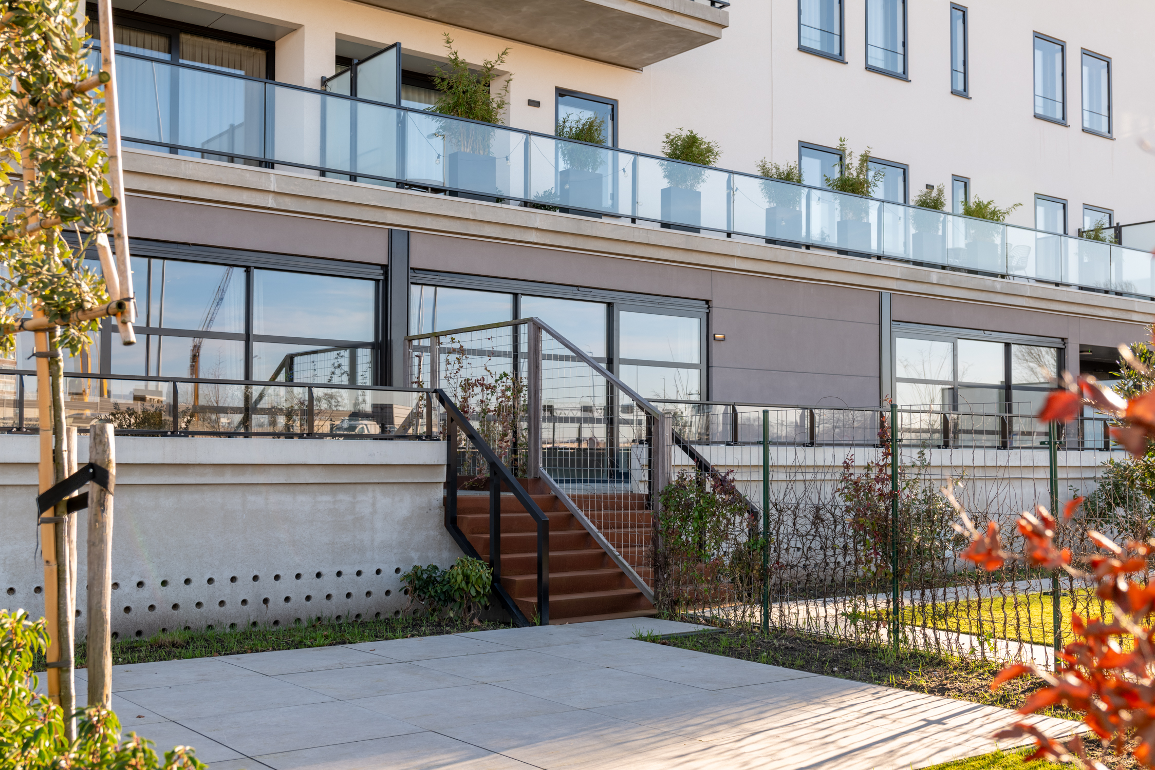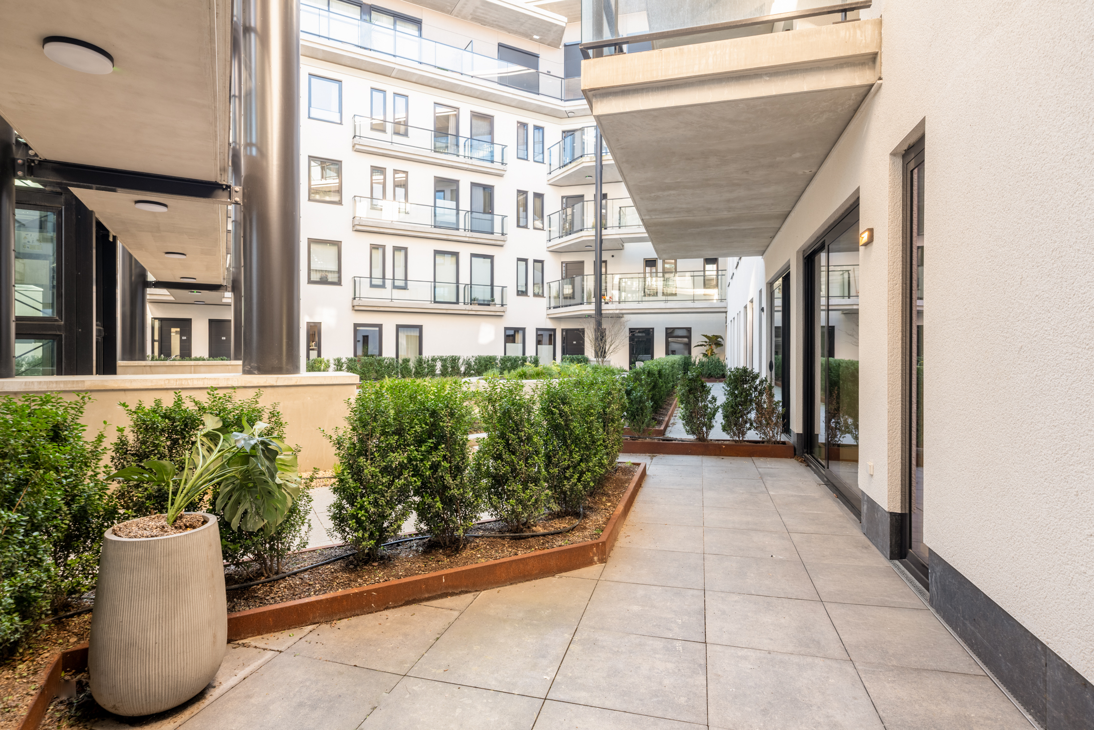 A vast living area of nearly 90 m² integrates a custom-designed lounge, elegant dining zone, and modern open kitchen equipped with premium appliances and a generous island. Light flows in through expansive windows, connecting the living spaces to a private garden at the front and a wide terrace stretching the full width of the apartment at the rear.
