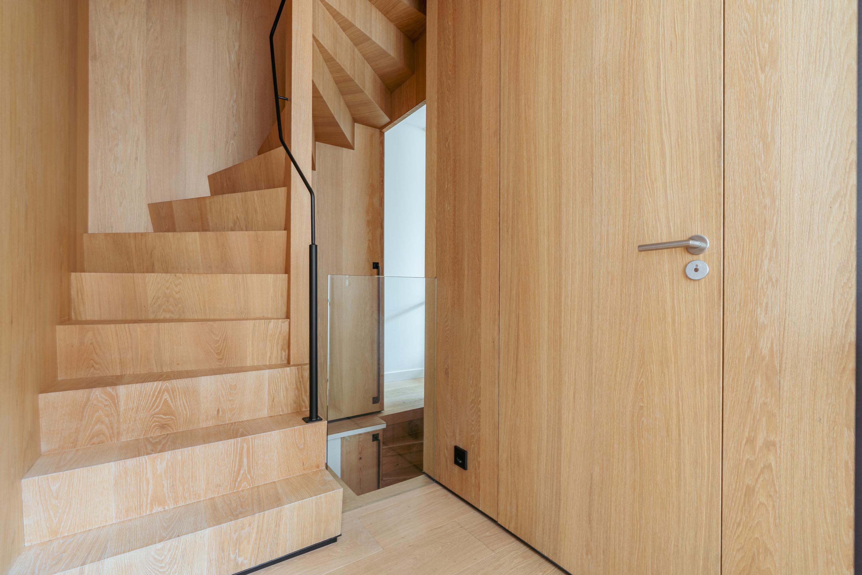 This upper floor is dedicated to a luxurious master suite — a private sanctuary of peace, space, and comfort. A central walk-in closet features custom cabinetry that is both functional and stylish. At the front is the cozy bedroom, where original ceiling beams and impressive ceiling height immediately draw the eye. Tall windows extending into the gable enhance the sense of openness and bring in wonderful natural light. Built-in wardrobes contribute to the clean, elegant look. At the rear lies the spectacular bathroom — a true wellness retreat at home. Here you’ll find a striking freestanding Agape Spoon Woodline bathtub, a double vanity with stylish cabinetry, a spacious walk-in shower, a steam cabin, and a built-in recliner for ultimate relaxation. The space is finished with warm materials and thoughtful design elements, including integrated lighting for a hotel-like atmosphere. Beautiful wooden sliding panels provide both shading and aesthetic appeal, offering privacy without blocking light. The toilet is separate from the bathroom.