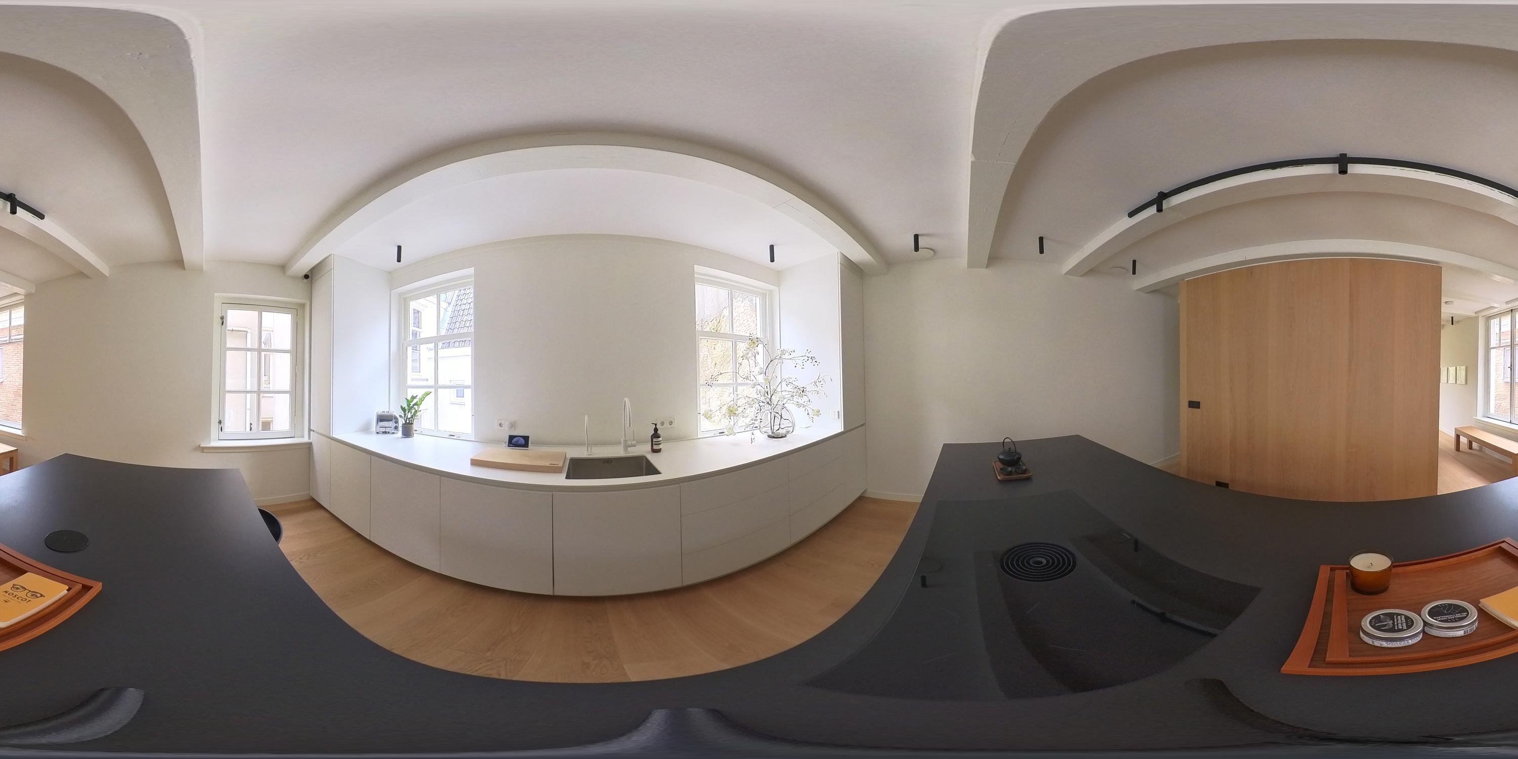 This floor is entirely dedicated to living and entertaining. At the rear is the modern kitchen — the heart of the home. It includes high-end built-in appliances: fridge, freezer, combi oven and microwave, Quooker tap, and a sleek induction cooktop with integrated extractor fan. Ample storage keeps the space minimalist and tidy. The centrally placed island includes a bar area for informal dining. At the front is the living area, where large windows offer a sweeping view over the canal. The combination of natural light, warm wooden floors, and subtle finishes create a calm, inviting ambiance. French doors open to a hallway with a separate toilet, and a staircase leads to the third floor.