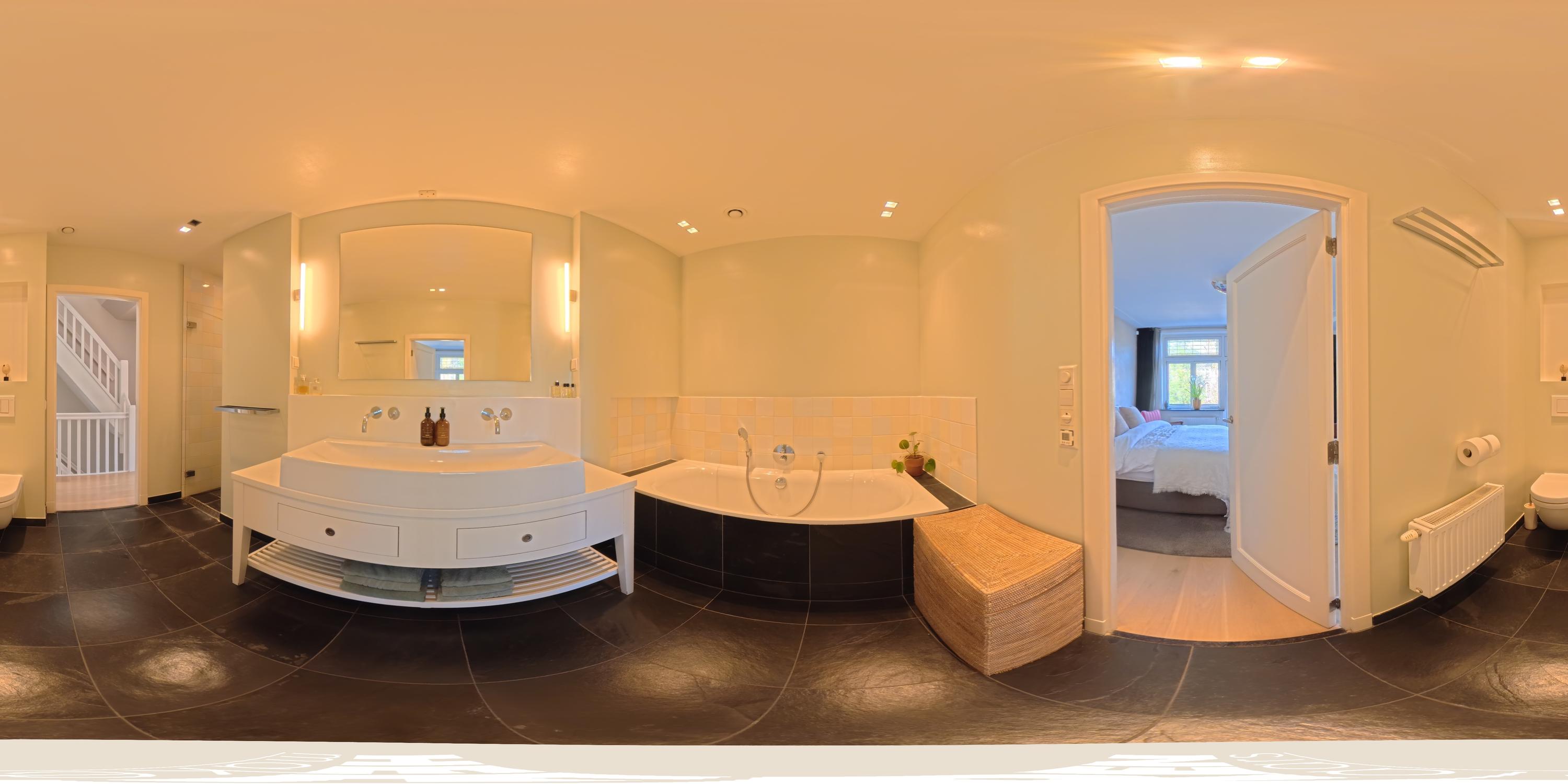 Landing with access to two particularly spacious bedrooms. The master bedroom is quietly situated at the rear and features bespoke built-in wardrobes. Through double French doors, you reach the wide balcony of approximately 6 m², offering excellent privacy. The generous en-suite bathroom is fitted with a bathtub, walk-in shower, double washbasin with vanity unit, and a toilet. The bathroom is also accessible from the landing. At the front, you will find the second spacious bedroom, also with built-in wardrobes, currently arranged as a home office with two workstations.