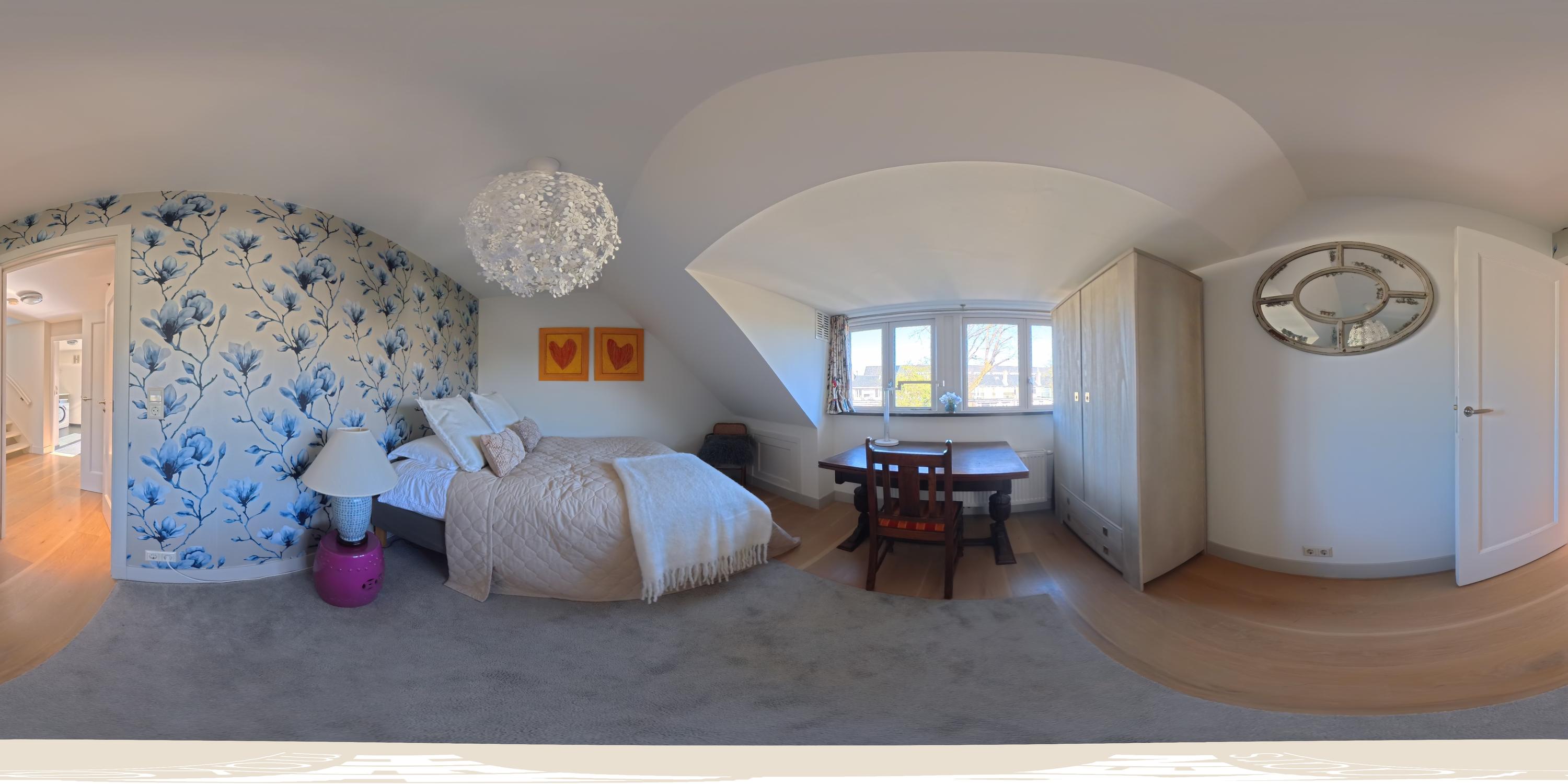 Landing with access to the fifth bedroom of this family home. The top floor boasts an impressive ceiling height and multiple windows, creating a bright and spacious atmosphere. The en-suite bathroom is fitted with a walk-in shower, washbasin with vanity unit, and toilet. A practical storage room is also accessible from the landing. This floor is highly suitable as a home office, guest room, or studio.