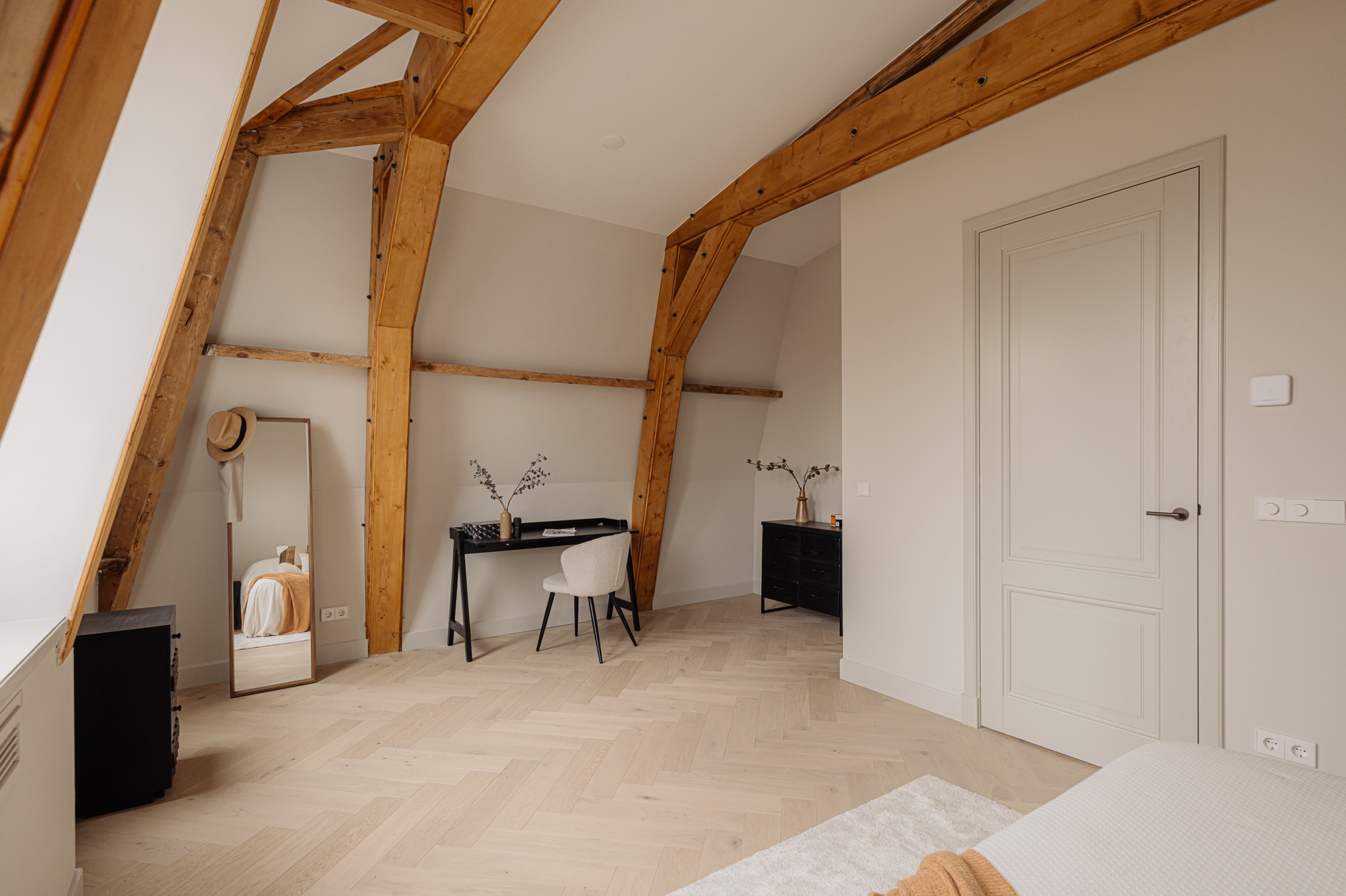 The two bedrooms at the back are flooded with natural light. They are so spacious that it would be easy to create a third bedroom. They have been beautifully finished with original wooden beams, which contribute to the apartment’s distinctive charm. The Master bedroom has its own en-suite bathroom with a double washbasin, a large bath and walk-in shower and a toilet. This bathroom is the epitome of comfort and luxury. The second bathroom is elegant too and has a double washbasin unit and a walk-in shower.