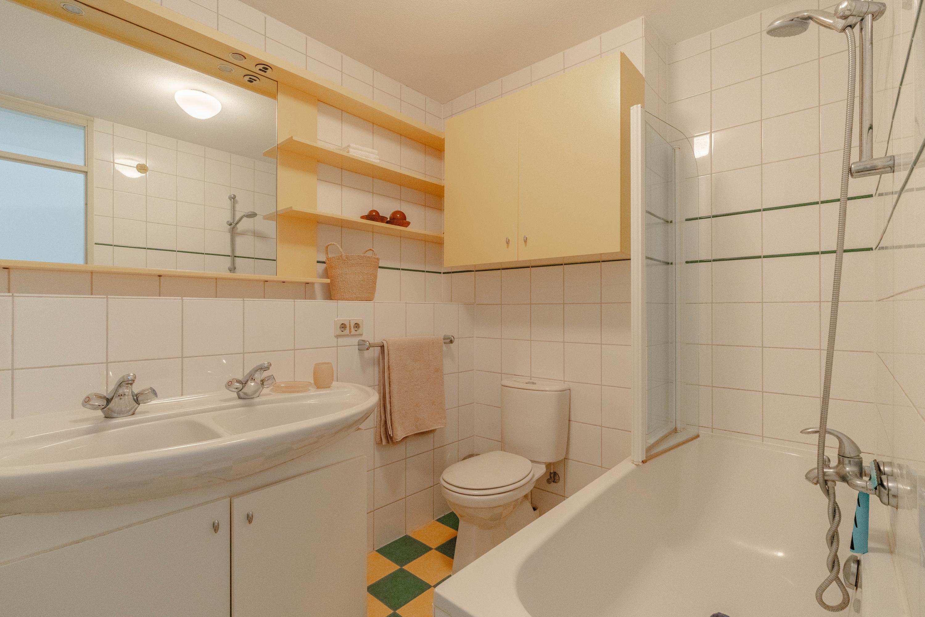 The apartment’s living level occupies the top floor, where large windows and generous ceiling heights invite daylight to animate the interiors. The living room opens to far-reaching views across the Singel and the city’s celebrated Flower Market, setting an atmosphere of refined urban calm. A half-open kitchen, complete with built-in appliances and an adjacent storage area, seamlessly connects to the dining space, ideal for gathering and entertaining.
