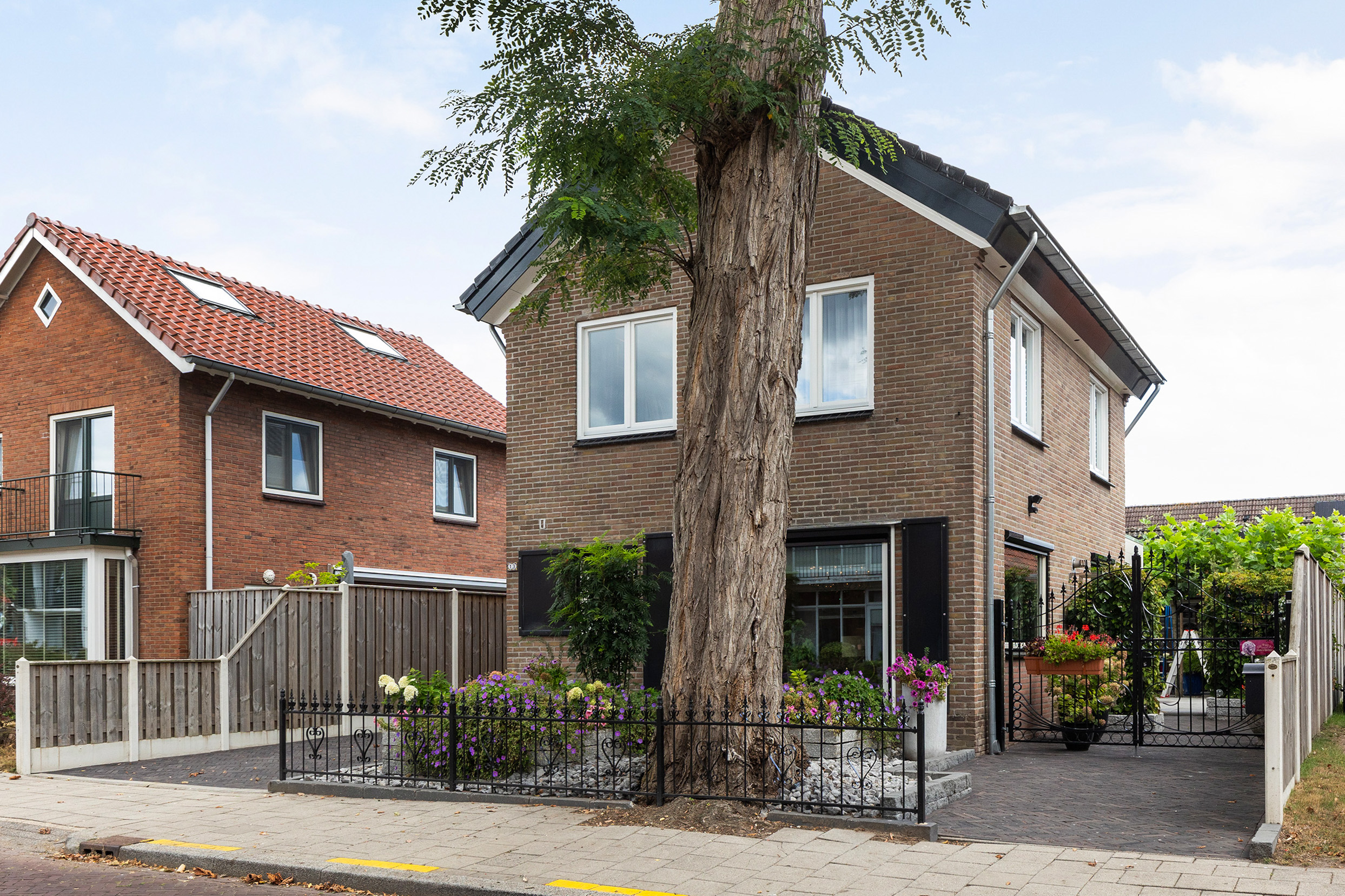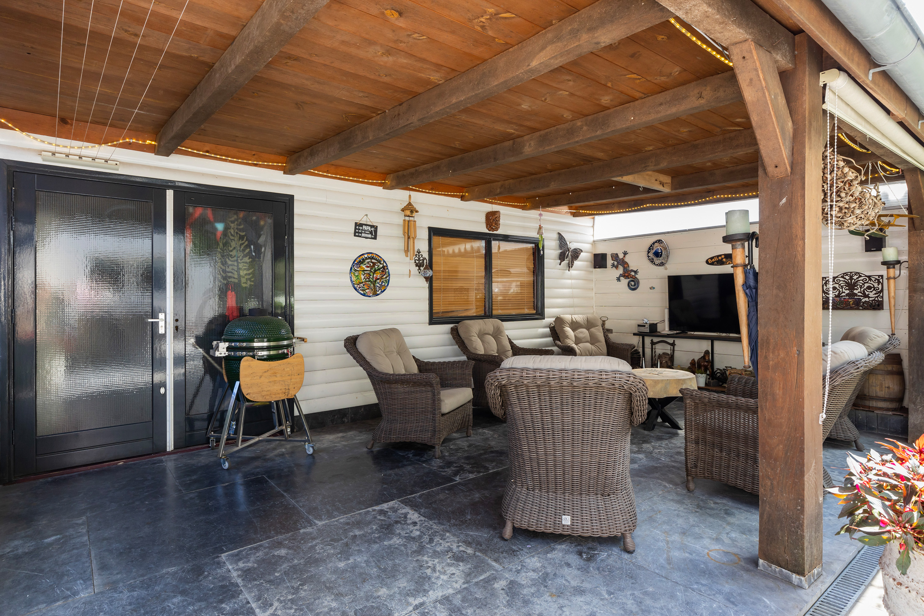 De buitenruimte is minstens zo aantrekkelijk. De fraai aangelegde tuin beschikt over terrassen van blauw hardsteen, granieten plantenbakken en diverse zitplekken. Aan de achterzijde staat een houten schuur met bergvliering met daarvoor een exclusieve veranda vervaardigd uit een robuust eikenhouten constructie en een met EPDM afgewerkt dak: een heerlijke plek om te genieten van het buitenleven en gezelligheid. De erfafscheidingen zijn recent vernieuwd in samenwerking met de buren en bestaan uit schuttingen met betonpalen en hout. Aan de voorzijde siert een acaciaboom de tuin, terwijl een smeedijzeren hekwerk met afsluitbare poort zorgt voor een stijlvolle entree. De royale oprit met klinkerbestrating en carport biedt plaats aan meerdere auto’s.