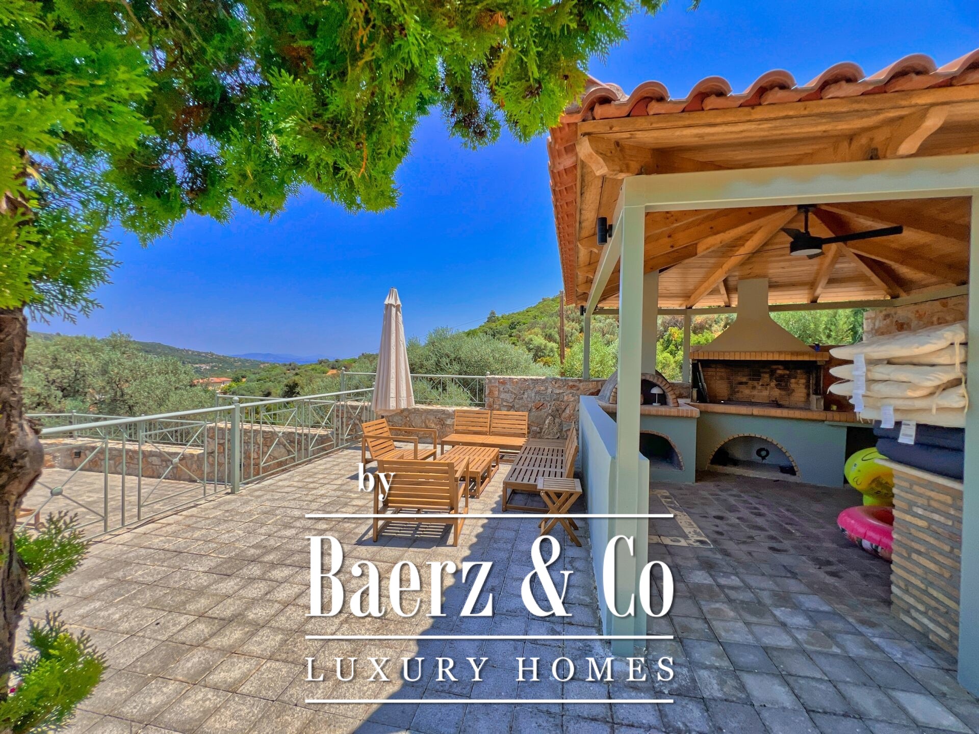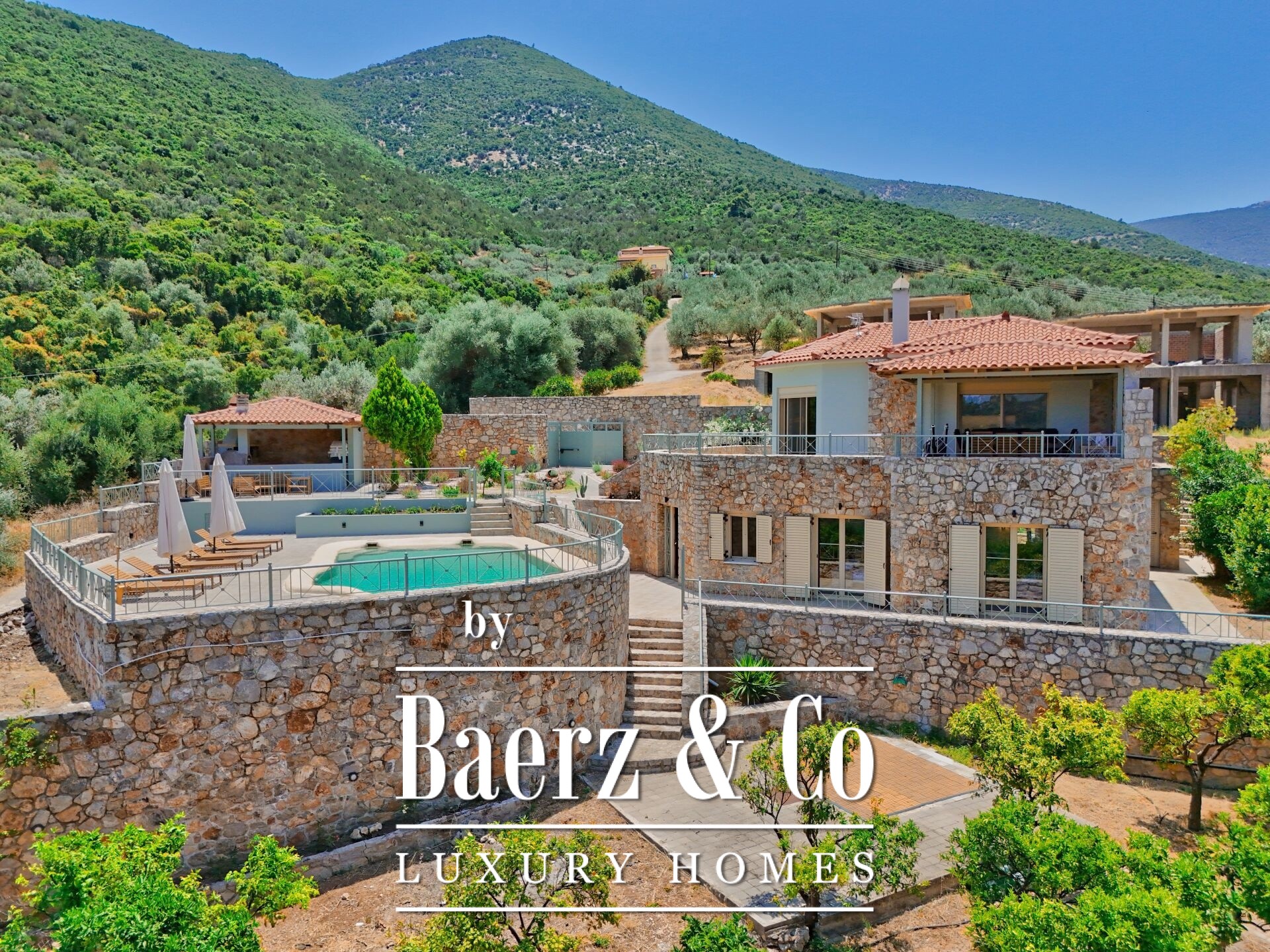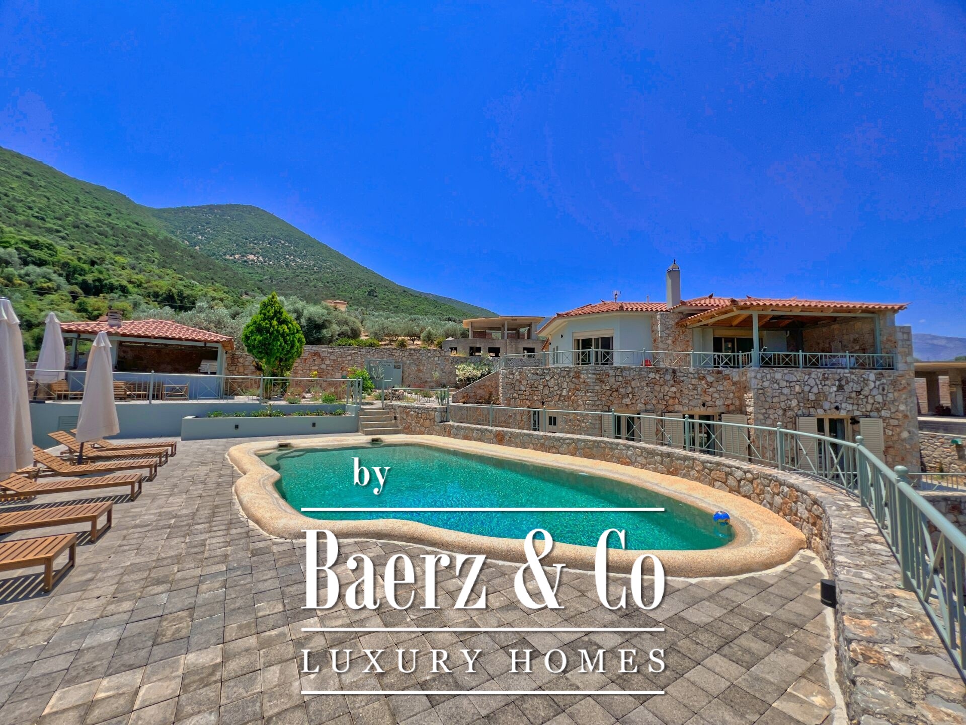 Outdoors, a graceful pool, stone seating areas, sheltered BBQ, and sunbathing terraces establish a rhythm for gatherings or quiet contemplation. The northeast orientation draws in morning light, while landscaped grounds echo the region’s timeless appeal. This luxury villa for sale in Archaia Epidavros is well suited for a discerning primary residence, tranquil summer home, or considered investment in the Peloponnese.
