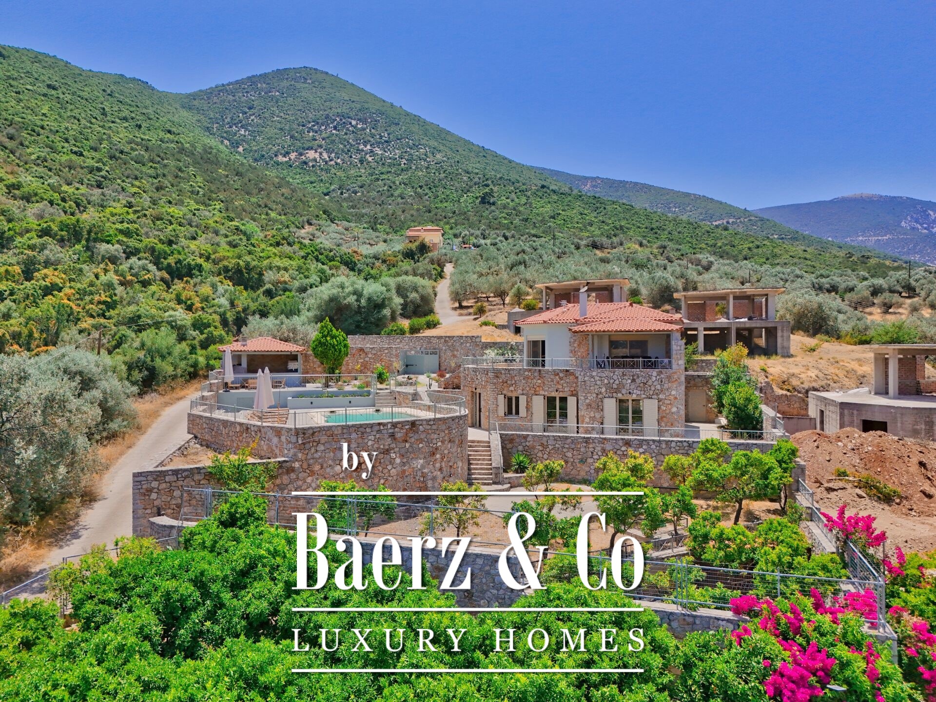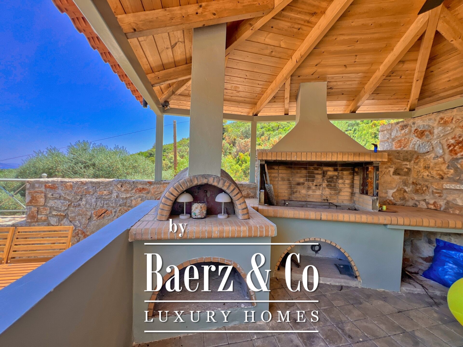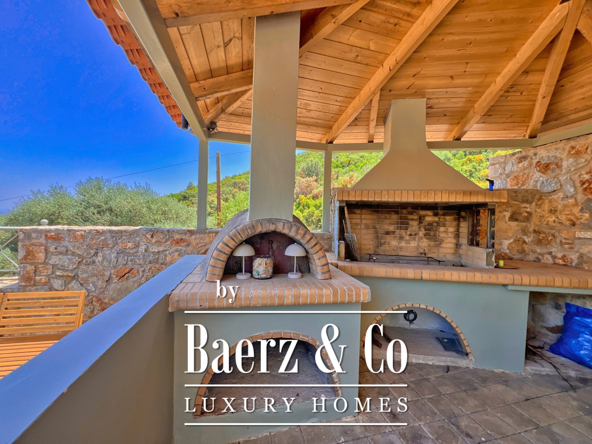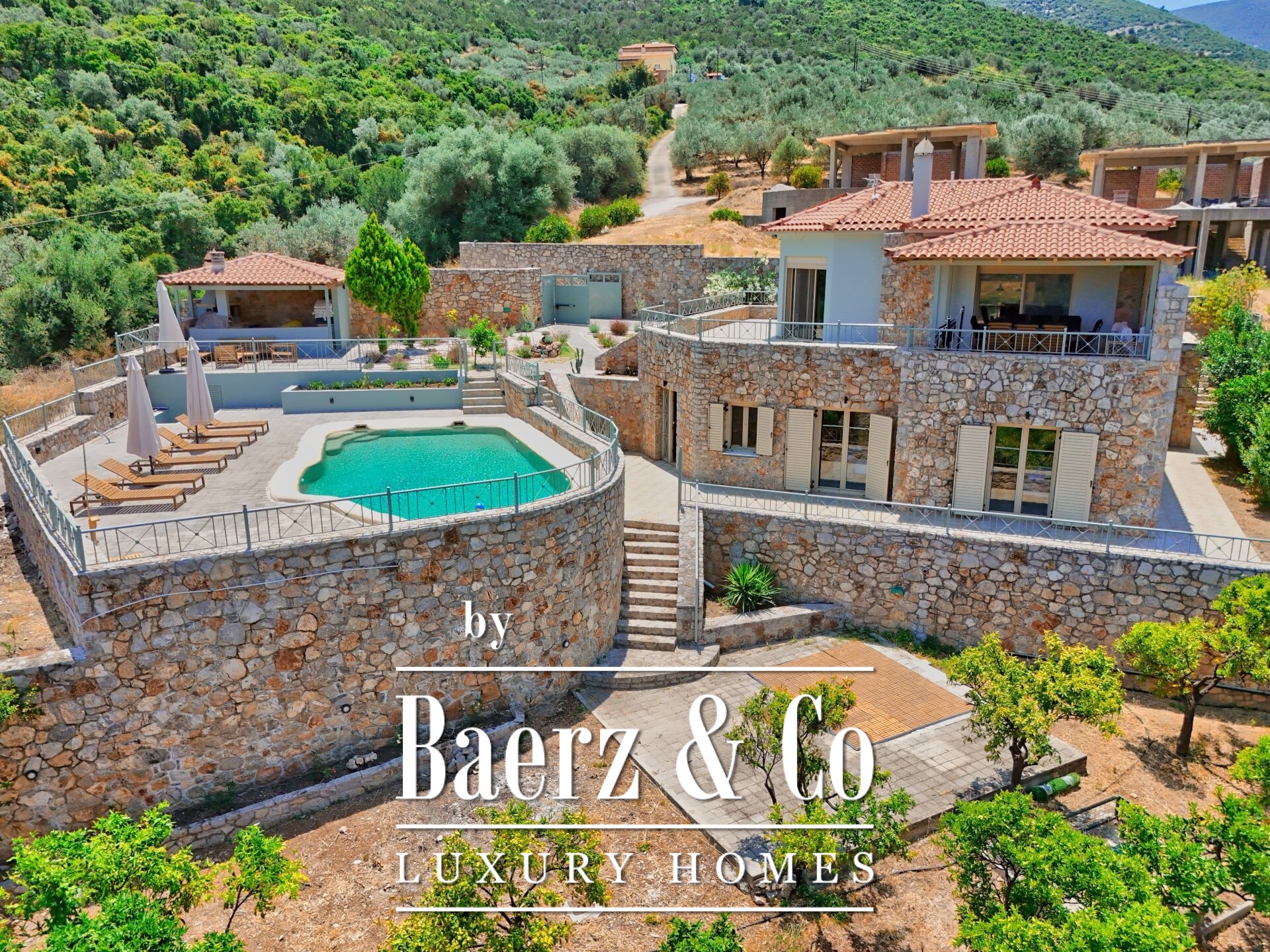 Outdoors, a graceful pool, stone seating areas, sheltered BBQ, and sunbathing terraces establish a rhythm for gatherings or quiet contemplation. The northeast orientation draws in morning light, while landscaped grounds echo the region’s timeless appeal. This luxury villa for sale in Archaia Epidavros is well suited for a discerning primary residence, tranquil summer home, or considered investment in the Peloponnese.