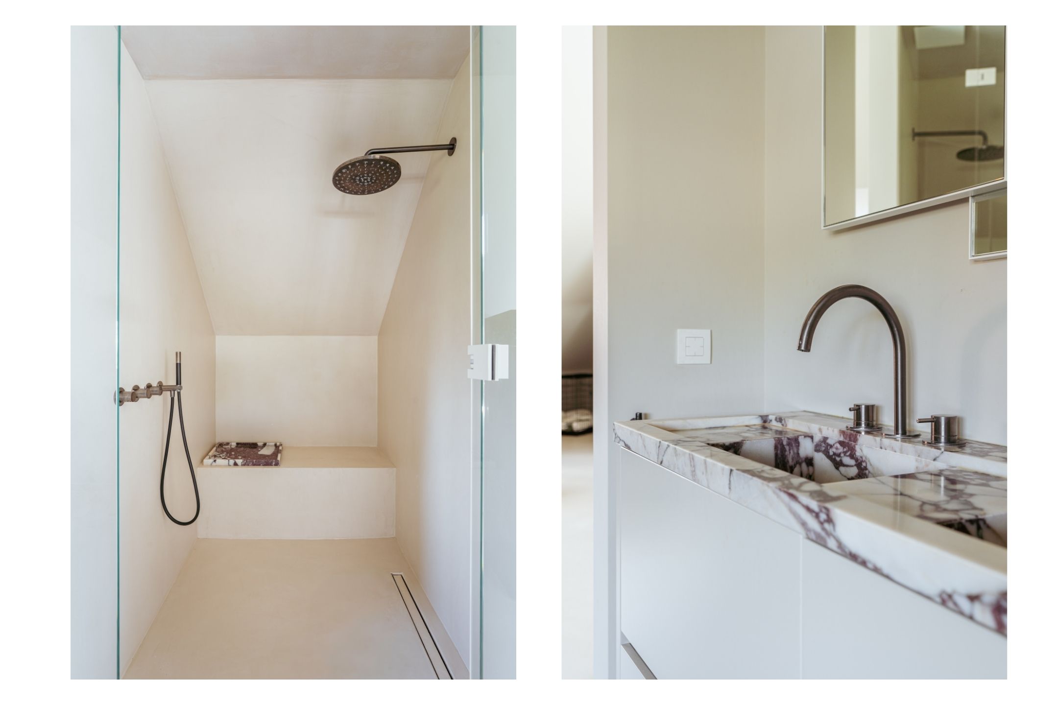 A staircase in the hallway leads to the first floor, where you will find three generously sized bedrooms. Thanks to their large dimensions, it would be simple to create a fourth or even fifth bedroom. The luxurious master bedroom features a freestanding bathtub, an en-suite bathroom, built-in wardrobes, and a spacious walk-in closet. The large bathroom is fitted with a double washbasin, walk-in shower, and WC. On the opposite side of the hallway, the second bathroom is also equipped with a walk-in shower, WC, and washbasin.