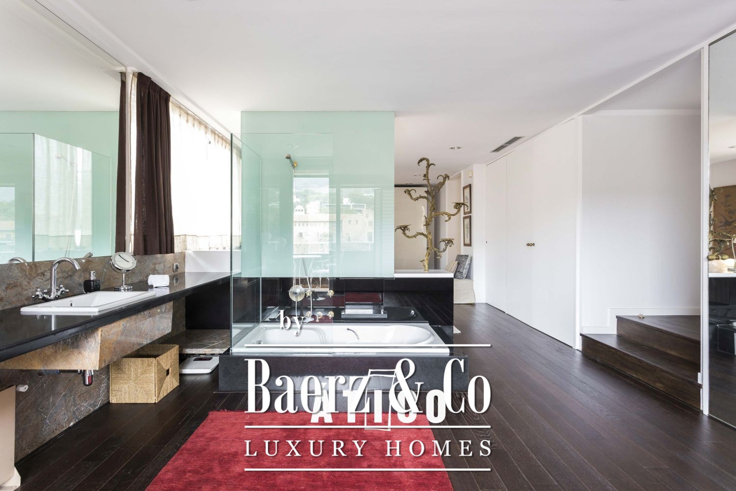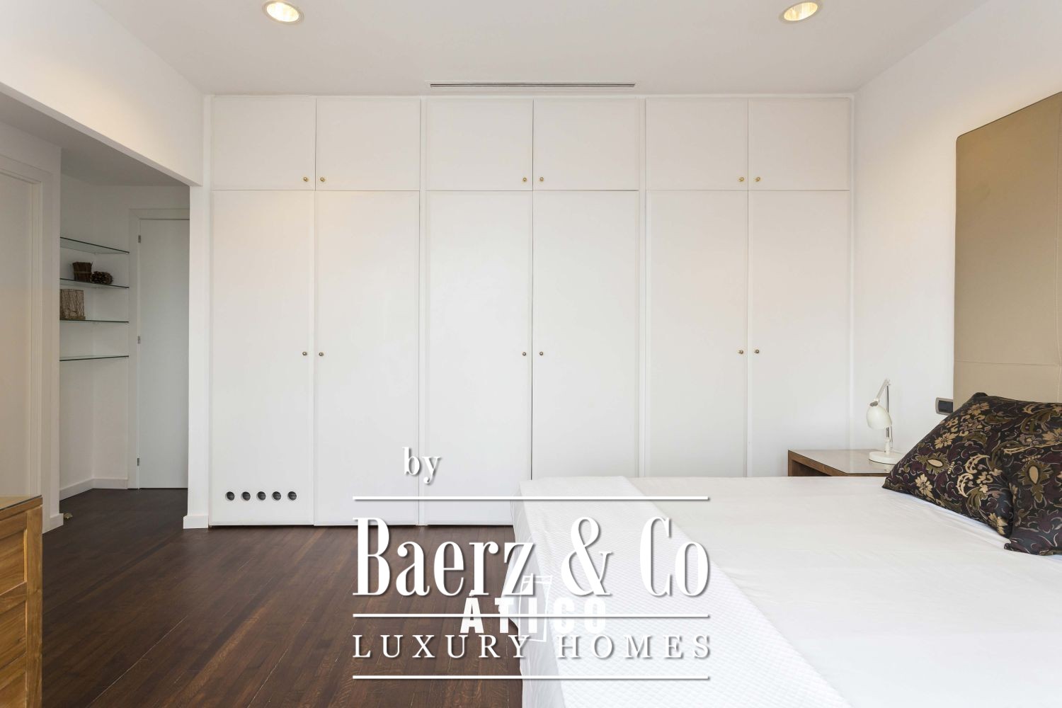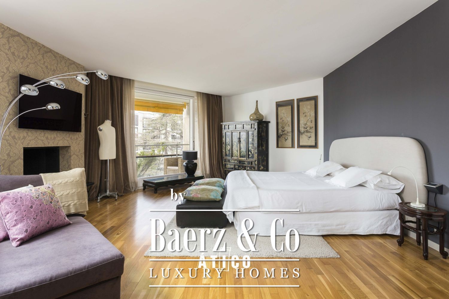 The apartment presents five double bedrooms, including two suites and two doubles, along with a dedicated service room and bathroom. The master suite features its own fireplace, a spacious dressing area and bathroom with extensive wardrobes. A second suite includes a private bathroom with jacuzzi and sauna, while two additional suites reside tranquilly on the far side of the residence.