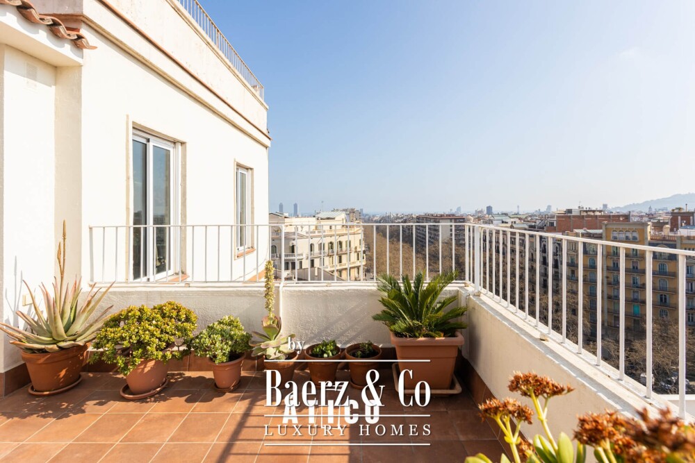 Penthouse apartment Barcelona presents an elevated urban sanctuary, set just moments from Passeig de Sant Joan in one of the city’s most sought-after addresses. This central 65 m² residence offers two bedrooms and a terrace of 10 m², allowing for a private vantage point over the city, including privileged views of Tibidabo, the sea, and the Sagrada Familia.