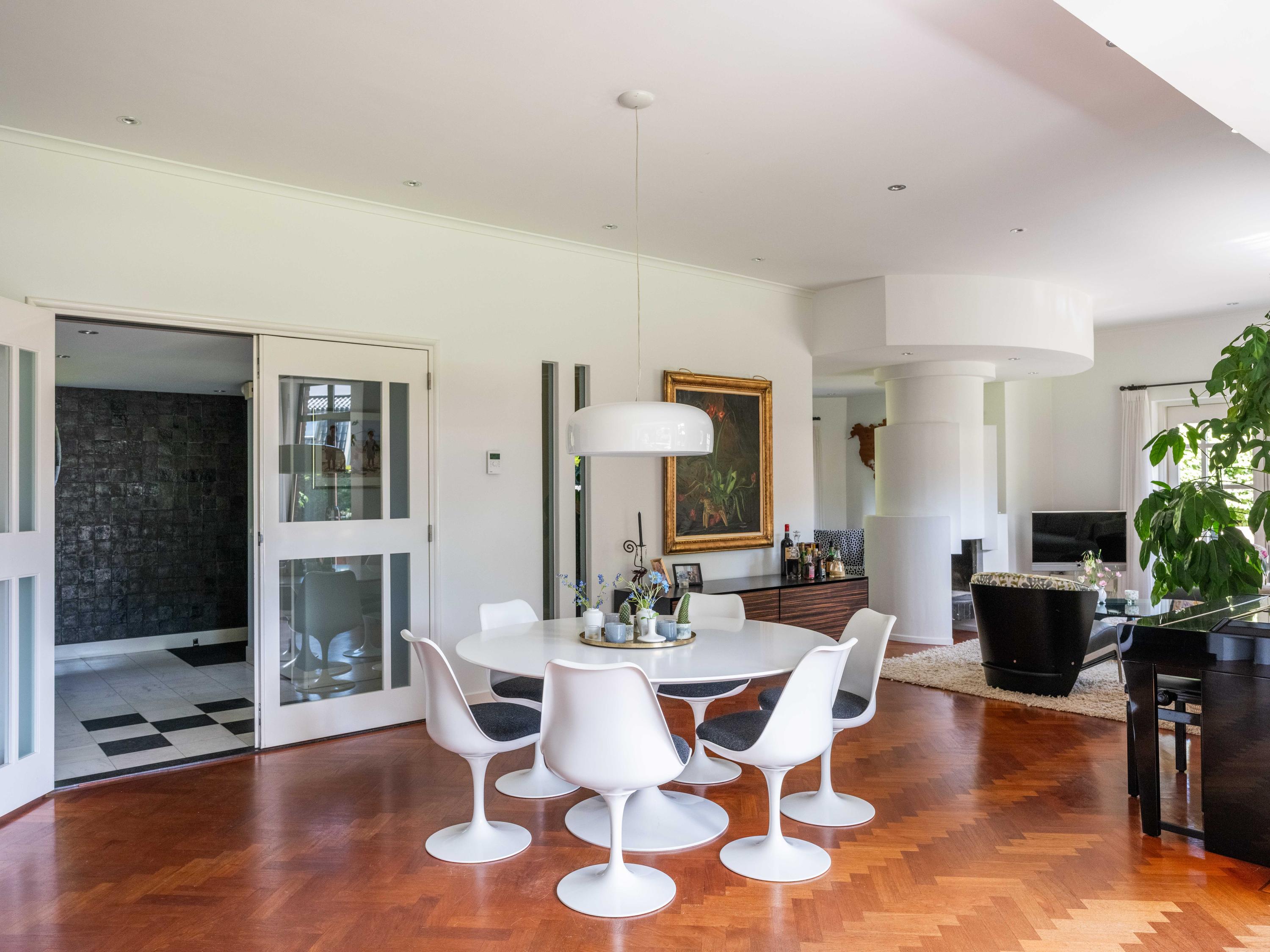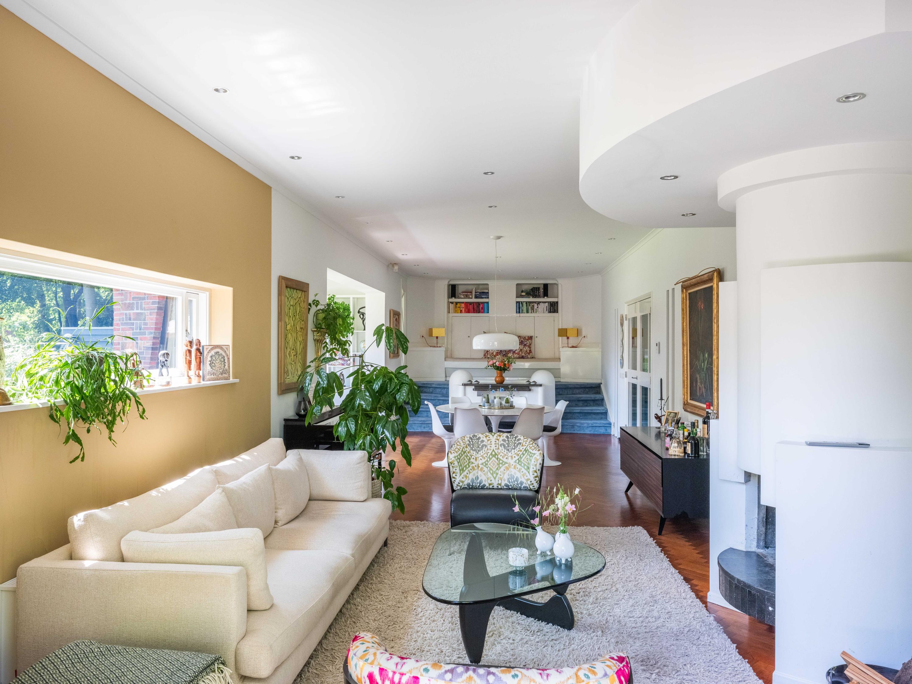 A few steps down from the hall leads to the kitchen, equipped with modern built-in appliances. Its shape, a half hexagon, gives it a playful and unique design, as does the dining area with space for a large table, which is one level lower.