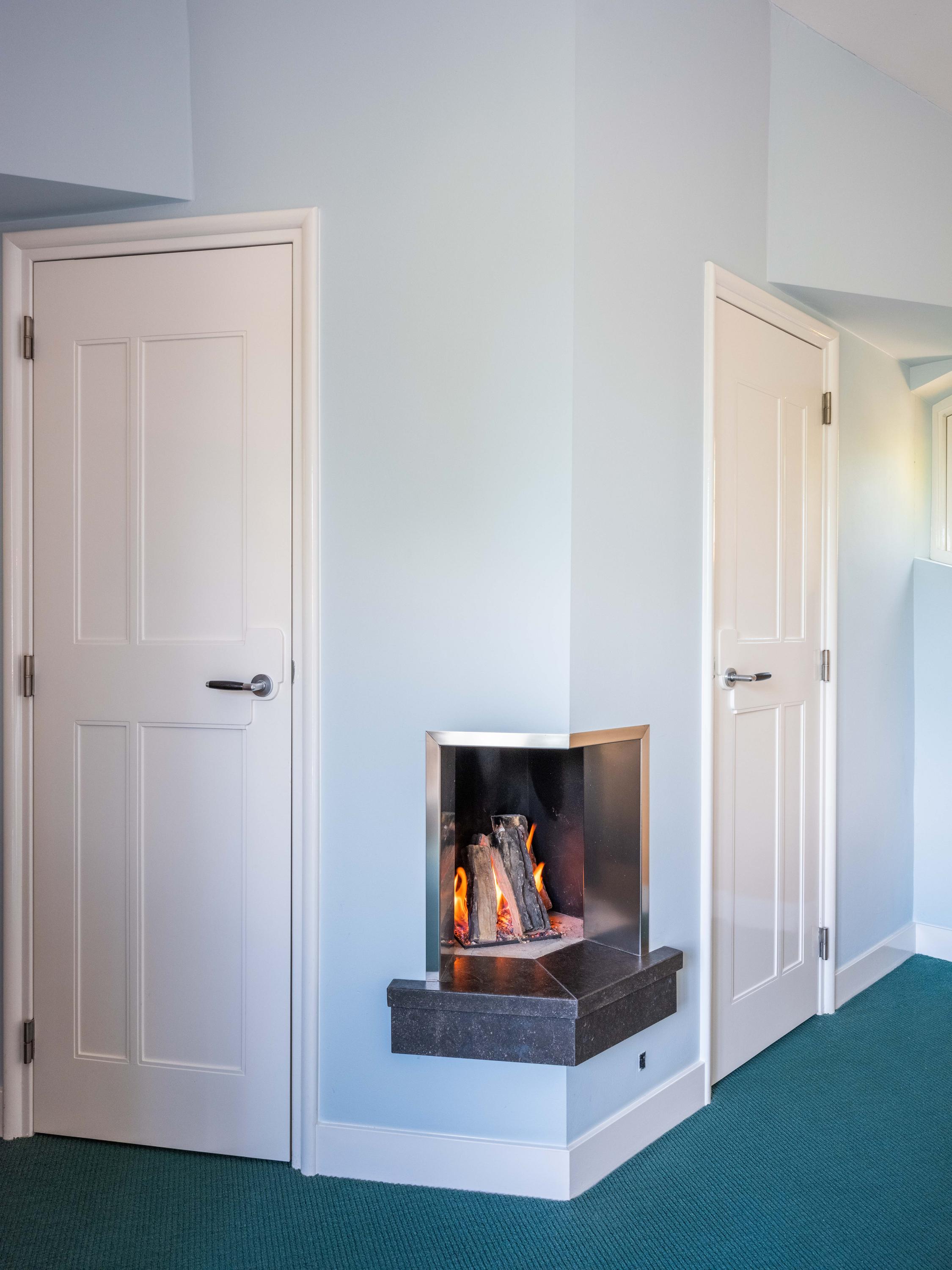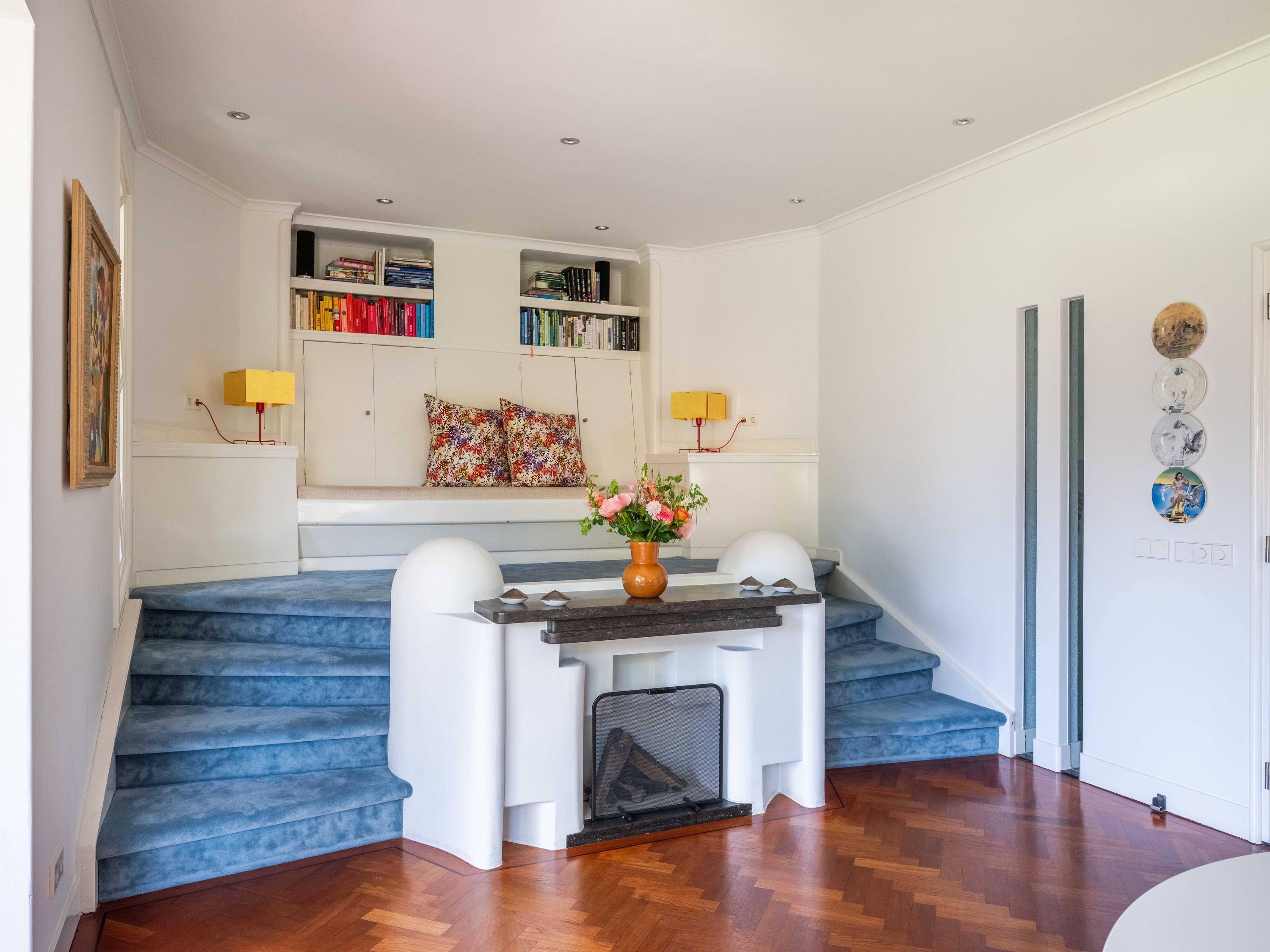 French doors lead to the spacious living room with fireplace, a dining area and conservatory. A striking feature is the raised section, known as the ‘wheelhouse’, which has monumental value. A beautiful parquet floor with piping, the rounded shapes of the fireplace, the ‘compass balls’ near the raised section and the trapezoidal window with columns give the whole a special appearance.