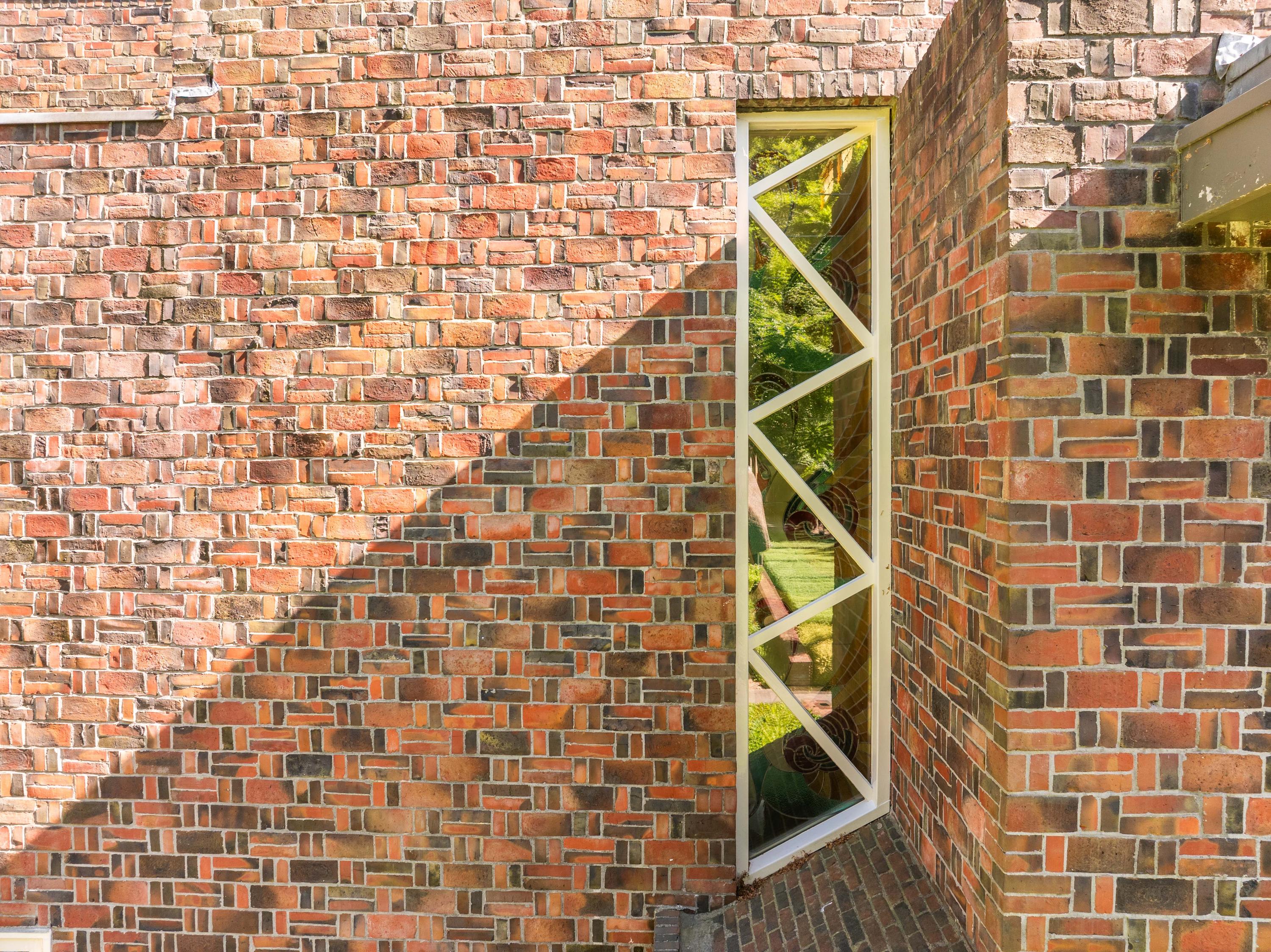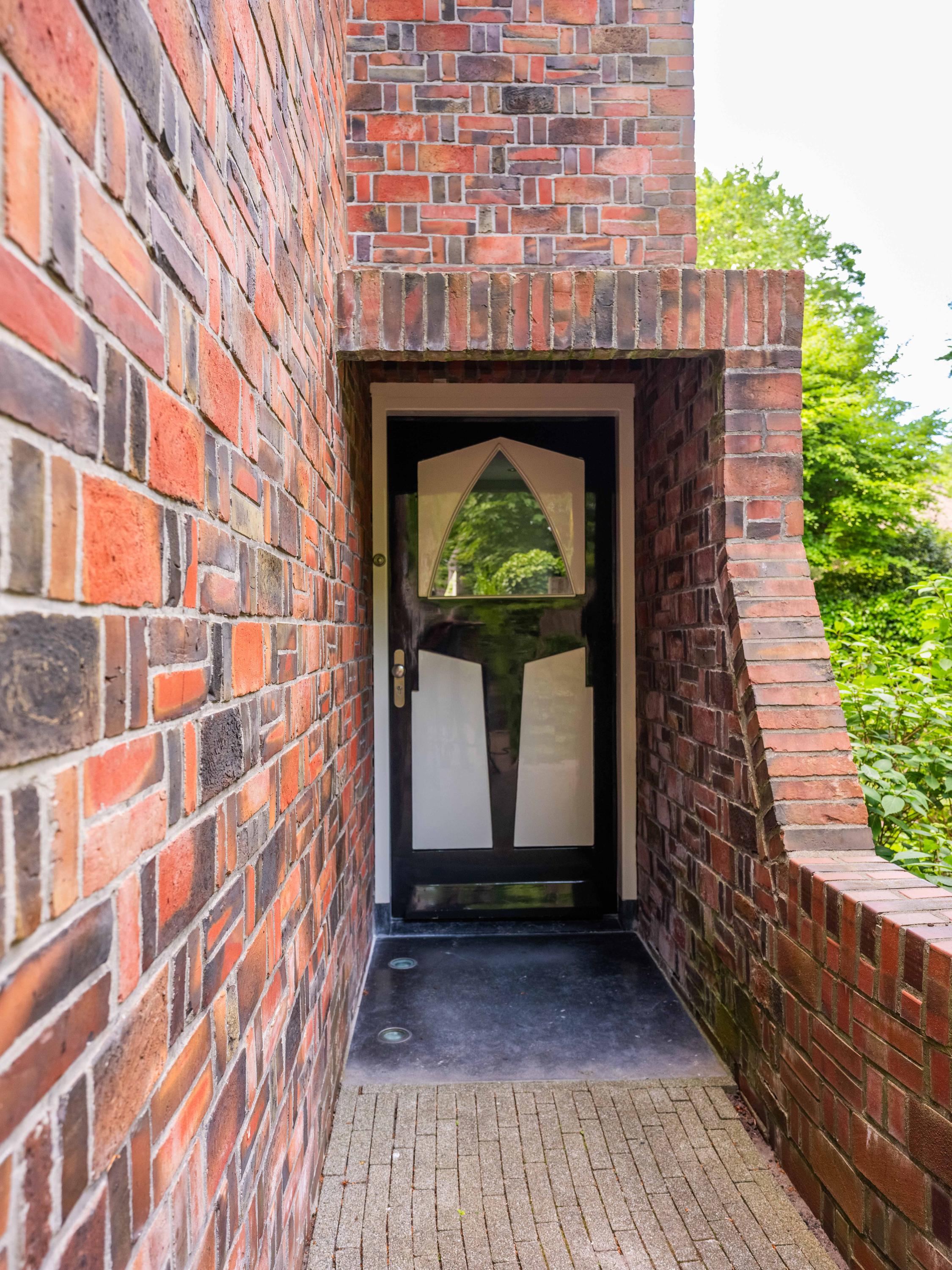 A winding path between beautifully shaped privet hedges leads to the hidden front door. Through the entrance, one enters the hall with a cloakroom, the stairs to the upper floor and a toilet.