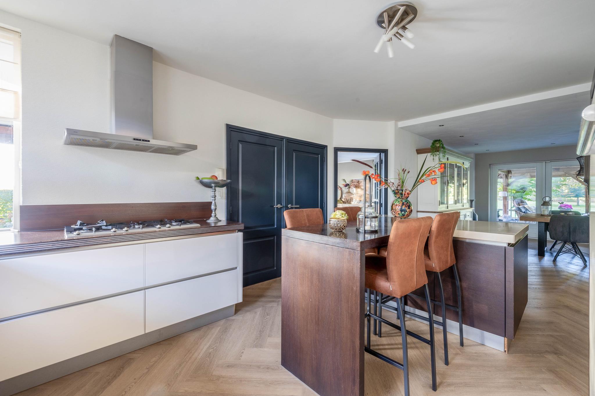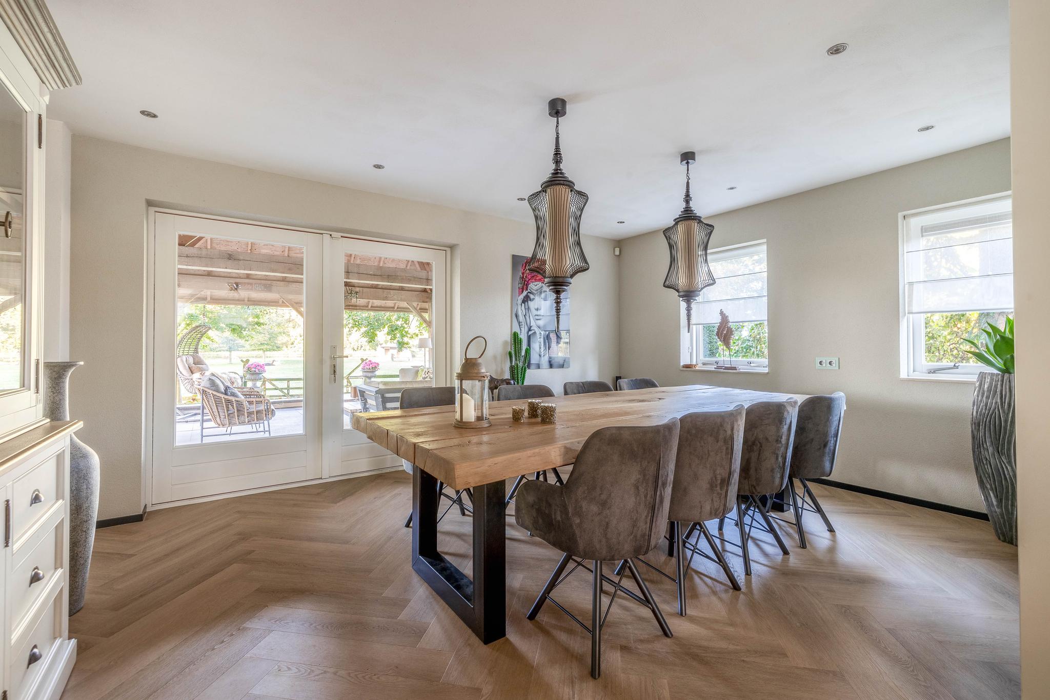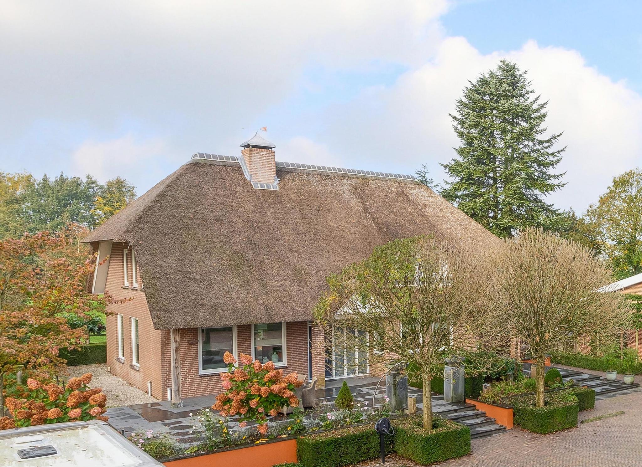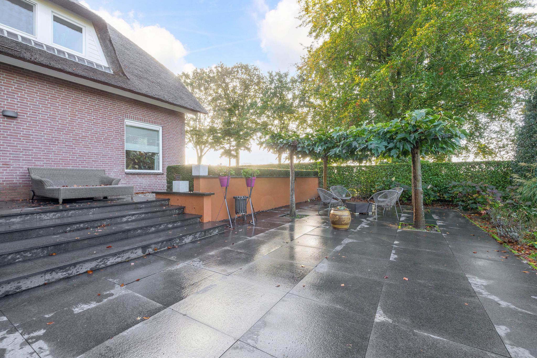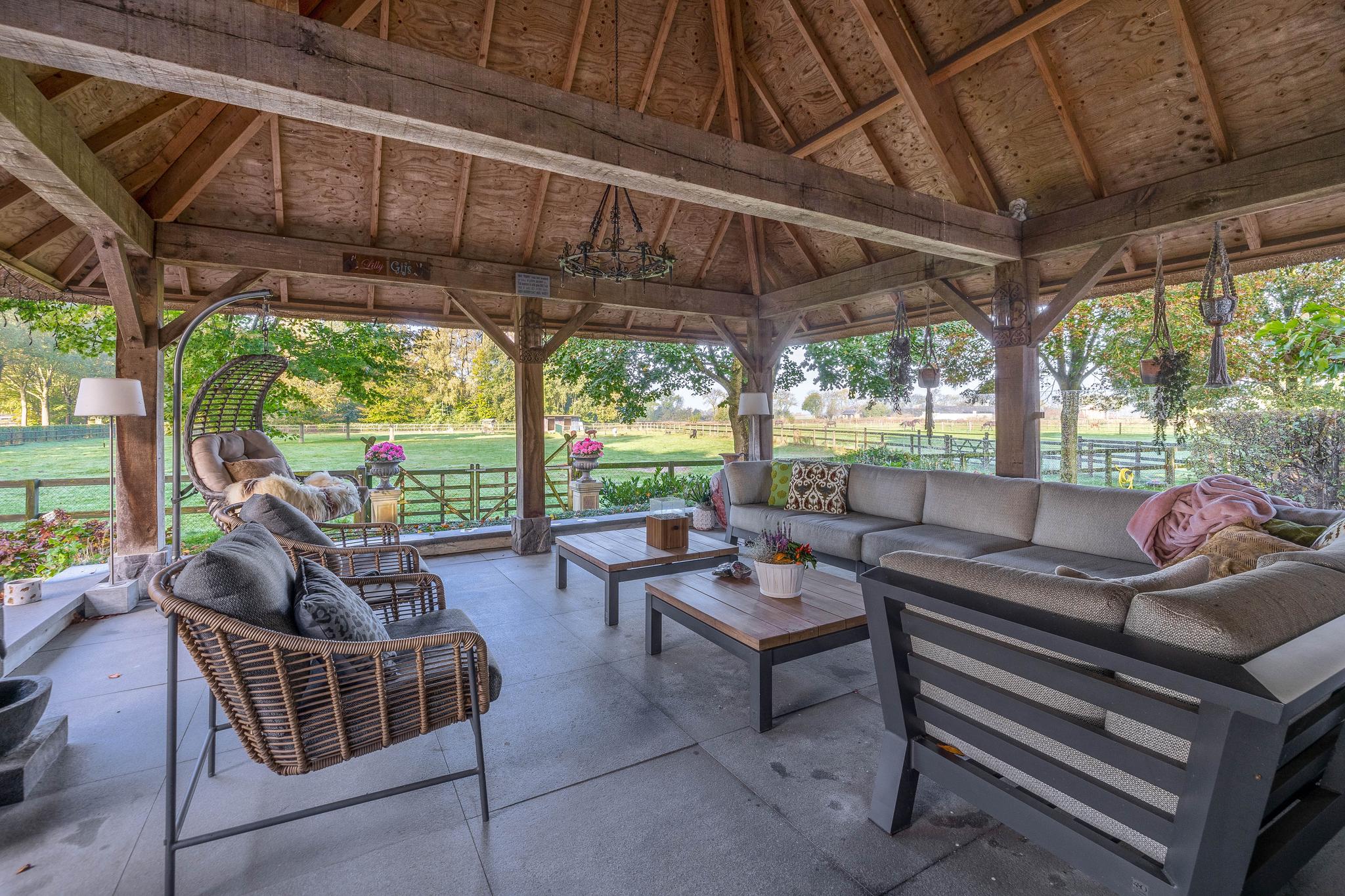 The garden surrounding the house is beautifully landscaped and well maintained. The garden is laid out with borders with perennials, trees, lawn and several terraces. At the front is a terrace, at the rear the terrace has a very beautiful and attractive canopy. This canopy is made of oak and has a glass wall. The roof is covered with reeds. The terrace offers beautiful views of the meadows. In short, a lovely place to be! A little further on is an aviary and another covered terrace. From here, too, there is a beautiful view of the meadows.