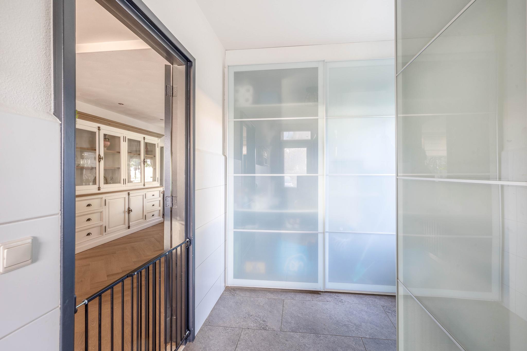 The hall provides access to the living room, meter cupboard and via a fixed staircase there is access to the 1st floor. The hall has a PVC floor in herringbone pattern, partly masonry/ partly stucco walls and a stucco ceiling. The hall provides access to the living room, meter cupboard and via a fixed staircase there is access to the 1st floor. The spacious living kitchen is also equipped with the same PVC floor in herringbone pattern. The walls and ceiling have been plastered. The kitchen layout is in a U-shape with a storage island. The kitchen is further equipped with a dishwasher, combination microwave oven, sink, 5-burner gas hob and fridge. From the kitchen, there is access to the cellar. The cellar is fully tiled and equipped with a cuckoo and a window. There are fixed shelves and a wooden staircase. A hatch provides access to the space under the house. The practical utility room is partly tiled and the floor is covered with a tiled floor which has underfloor heating. Practical sliding cupboards provide storage space. This is where the central heating combi boiler, the underfloor heating unit and the connections for the washing equipment are located. From the utility room, there is access to the toilet room and the yard. The toilet room is fully tiled and further equipped with a hand basin and a floating toilet.