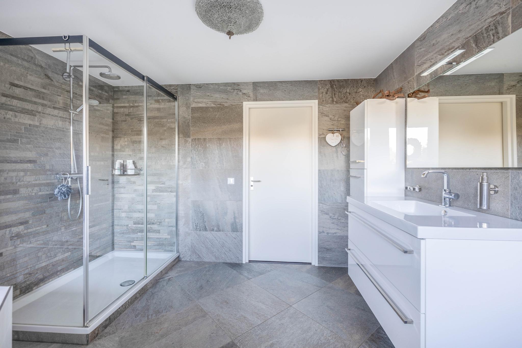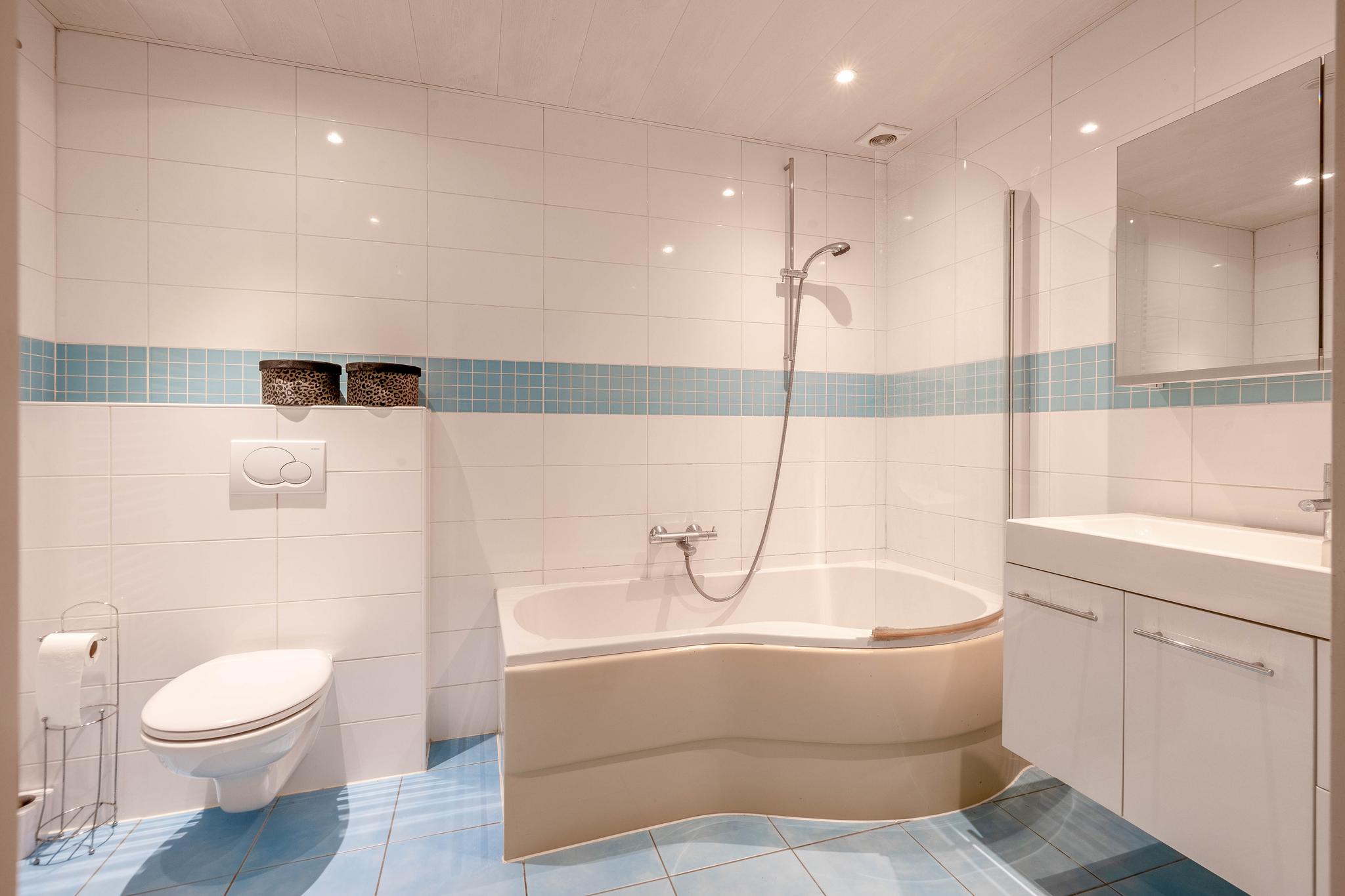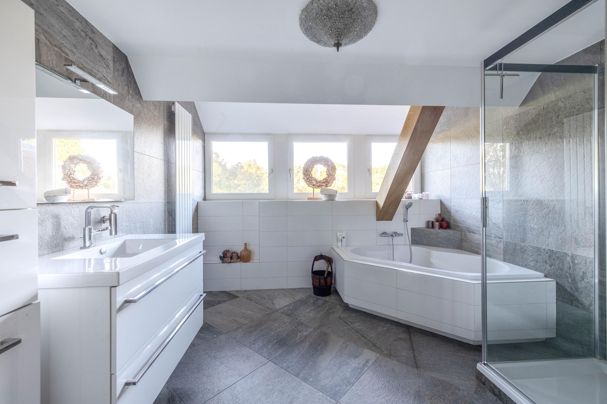 The generous landing provides access to 3 spacious bedrooms and a bathroom. Bedroom I is carpeted, with sprayed walls and a sprayed ceiling. From this room, a fixed staircase provides access to the storage attic. The room further features a practical built-in wardrobe. Bedroom II is also finished with carpeted floors, sprayed walls and a sprayed ceiling. Fixed sliding wardrobes provide storage space. The spacious bathroom is fully tiled and further equipped with a bathtub, walk-in shower, washbasin with cabinet and a design radiator. The toilet room is fully tiled and equipped with a floating toilet. The very spacious master bedroom was formerly divided into two bedrooms. This is relatively easy to realise again. The room is finished with carpeting, spachtelputz walls and a sprayed ceiling. A practical closet and sliding wardrobes provide storage space. Many windows provide plenty of natural light.