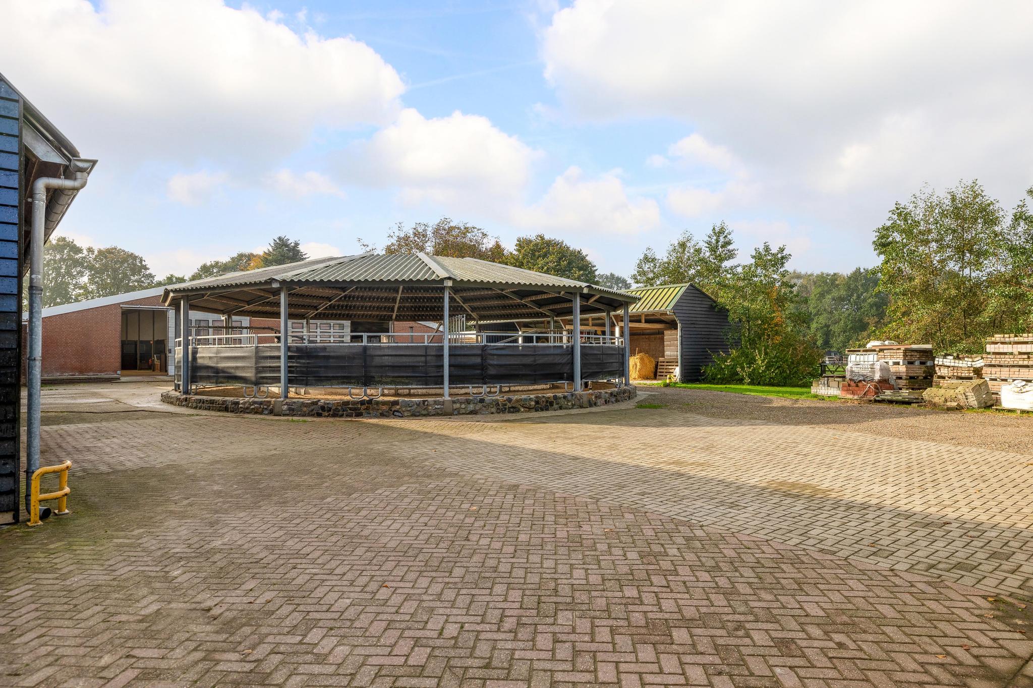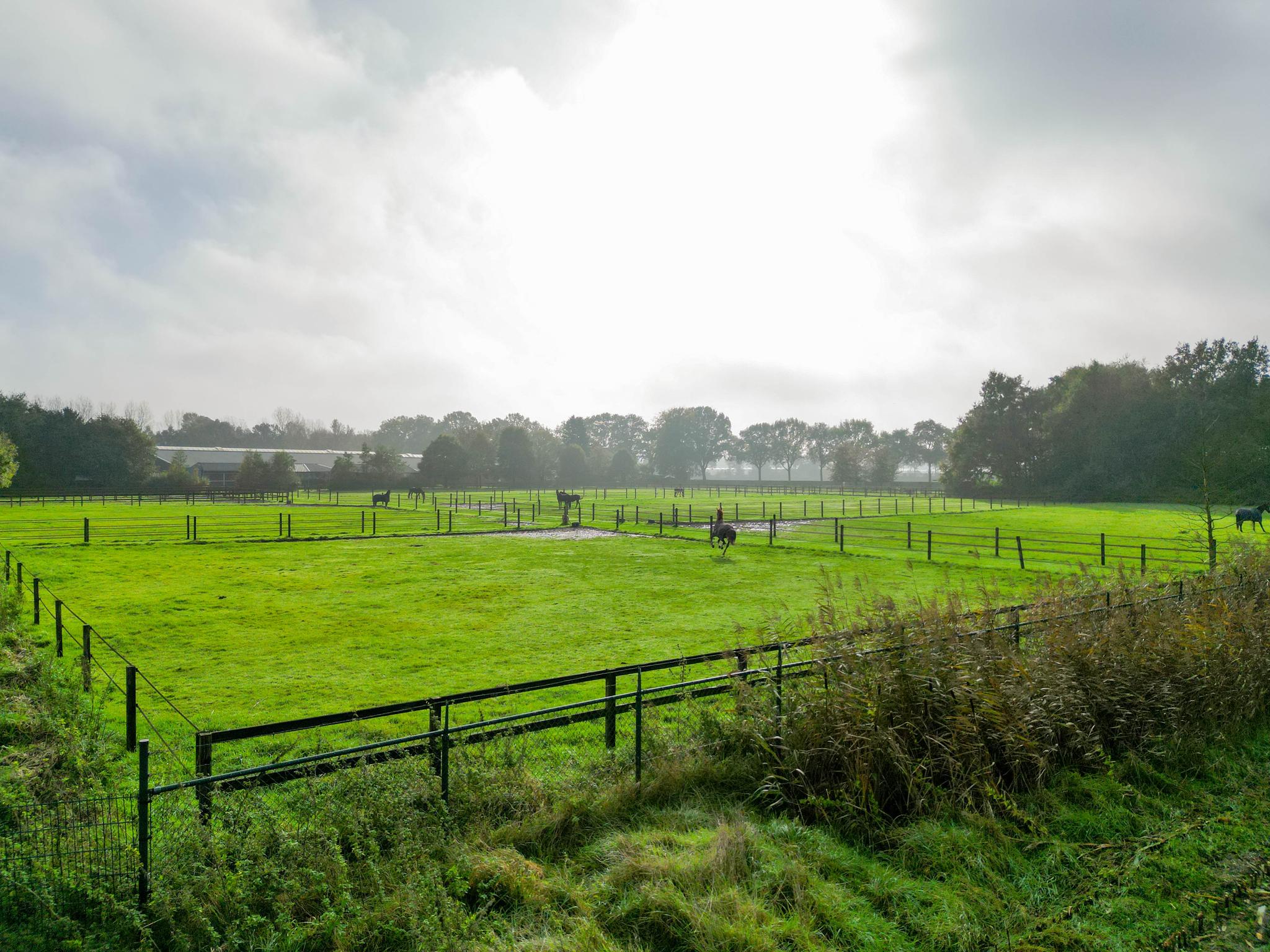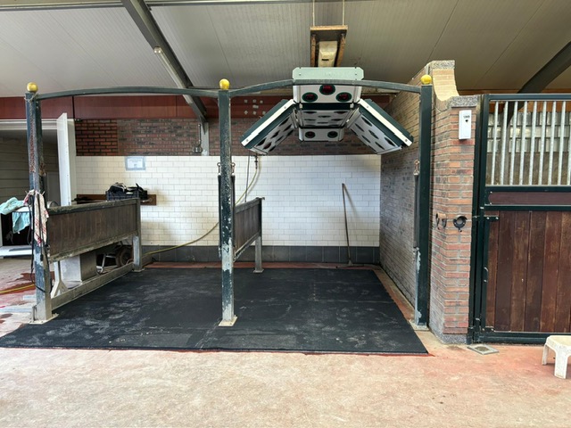 The yard is further equipped with an outdoor arena, covered horse walker, a lunging circle, several paddocks, a storage/field barn, shed, manure heap, pasture and a detached shed. There is ample parking space for stabling trailers and trucks, among other things. The yard can be closed with an electric opening gate. The storage/field shed with open front is constructed of partly masonry / partly sheet piling with wooden rafters and a sheet piling roof.