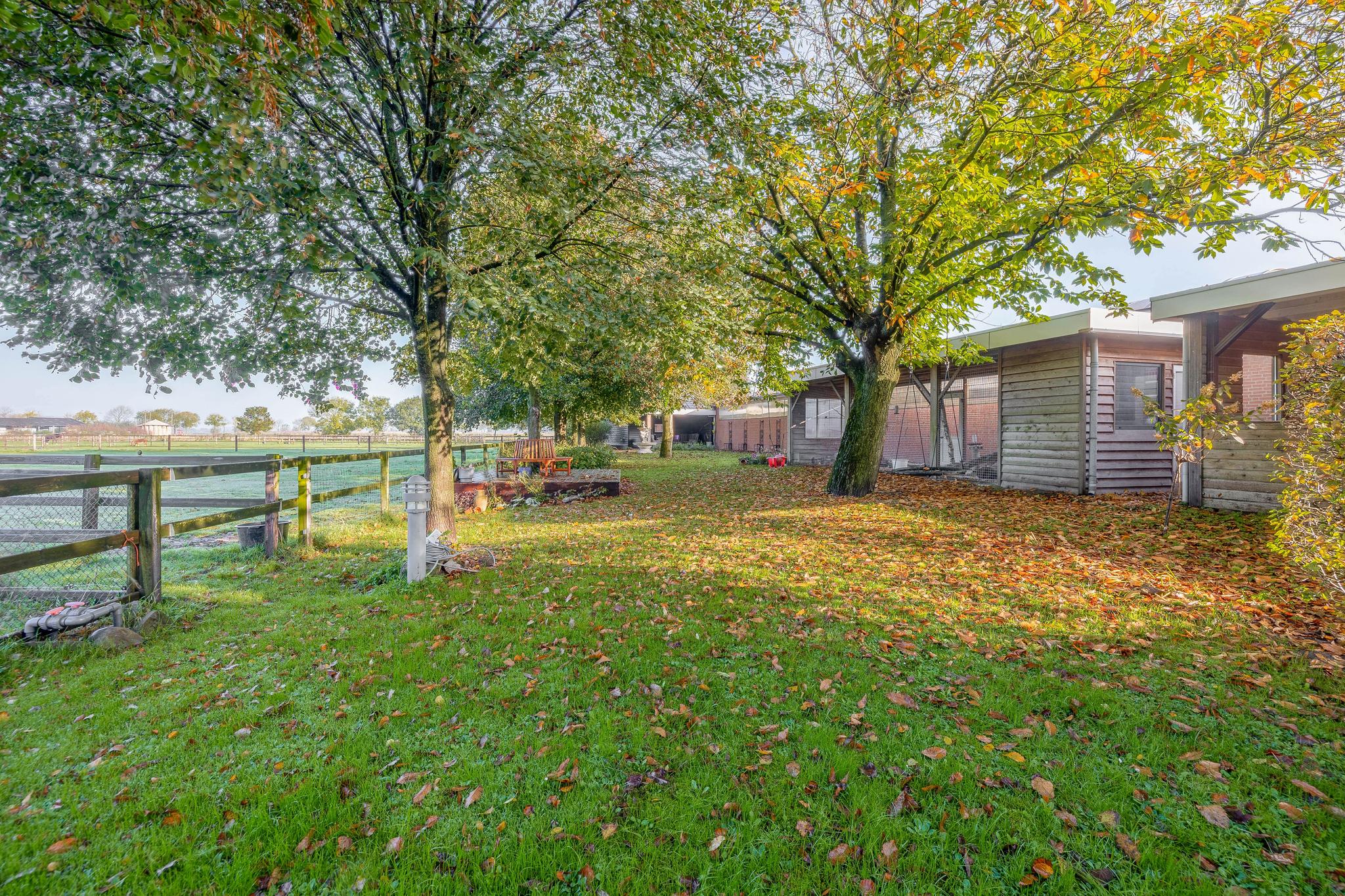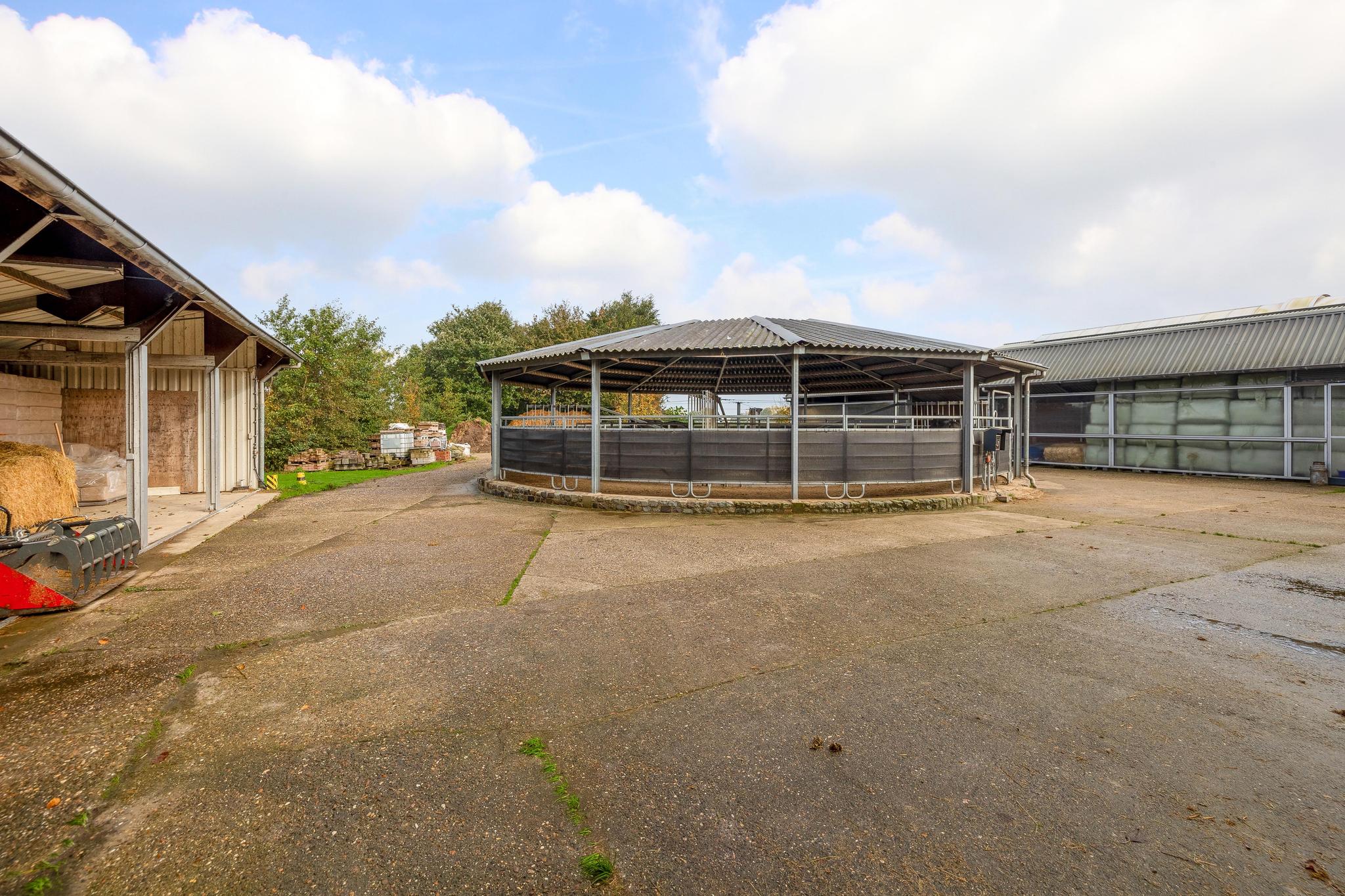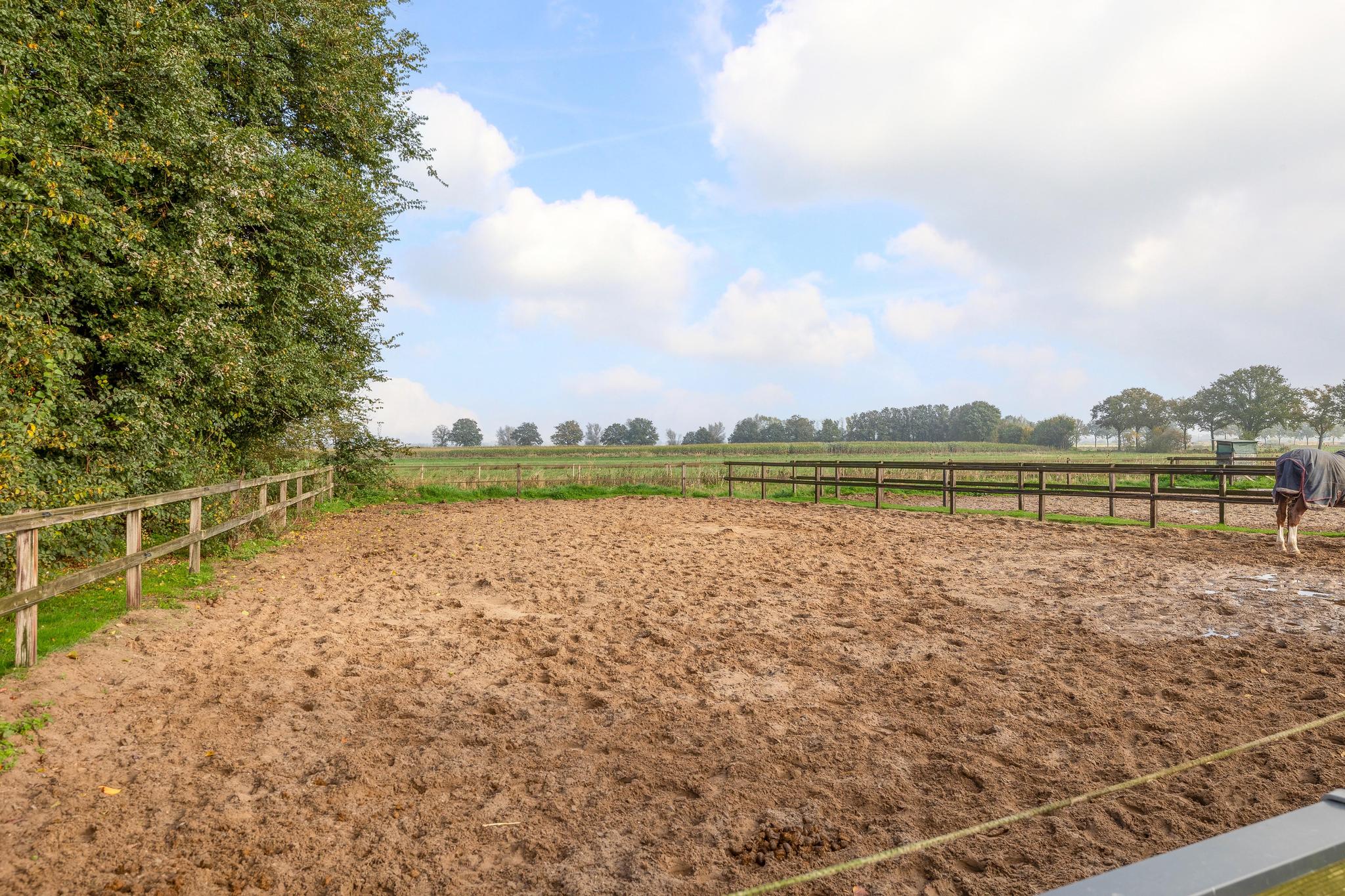 The yard is further equipped with an outdoor arena, covered horse walker, a lunging circle, several paddocks, a storage/field barn, shed, manure heap, pasture and a detached shed. There is ample parking space for stabling trailers and trucks, among other things. The yard can be closed with an electric opening gate. The storage/field shed with open front is constructed of partly masonry / partly sheet piling with wooden rafters and a sheet piling roof.