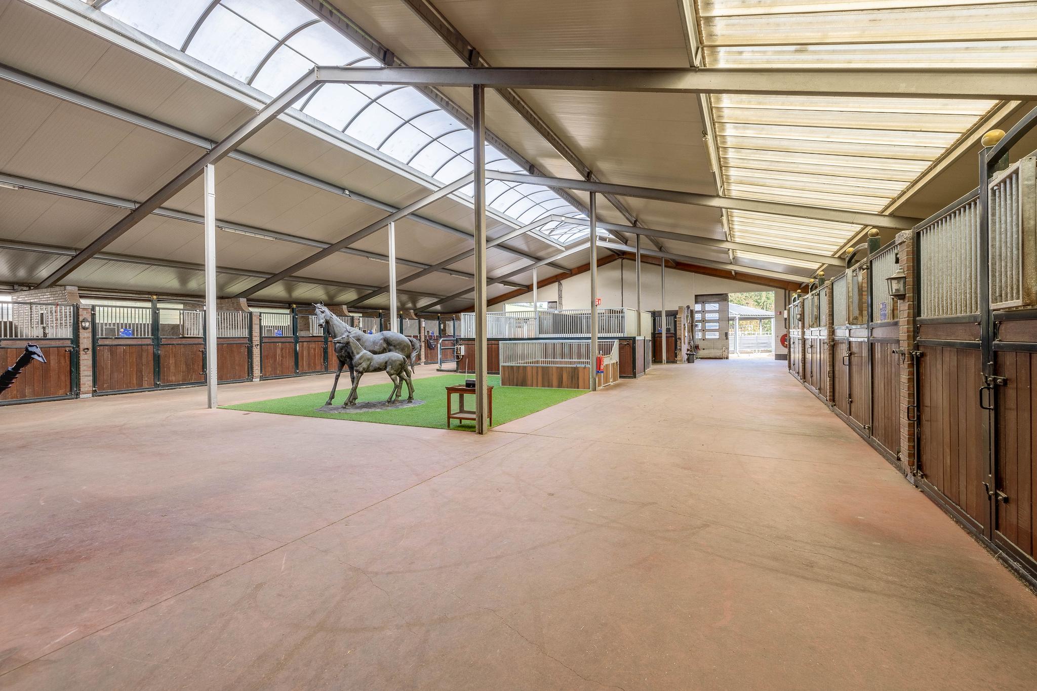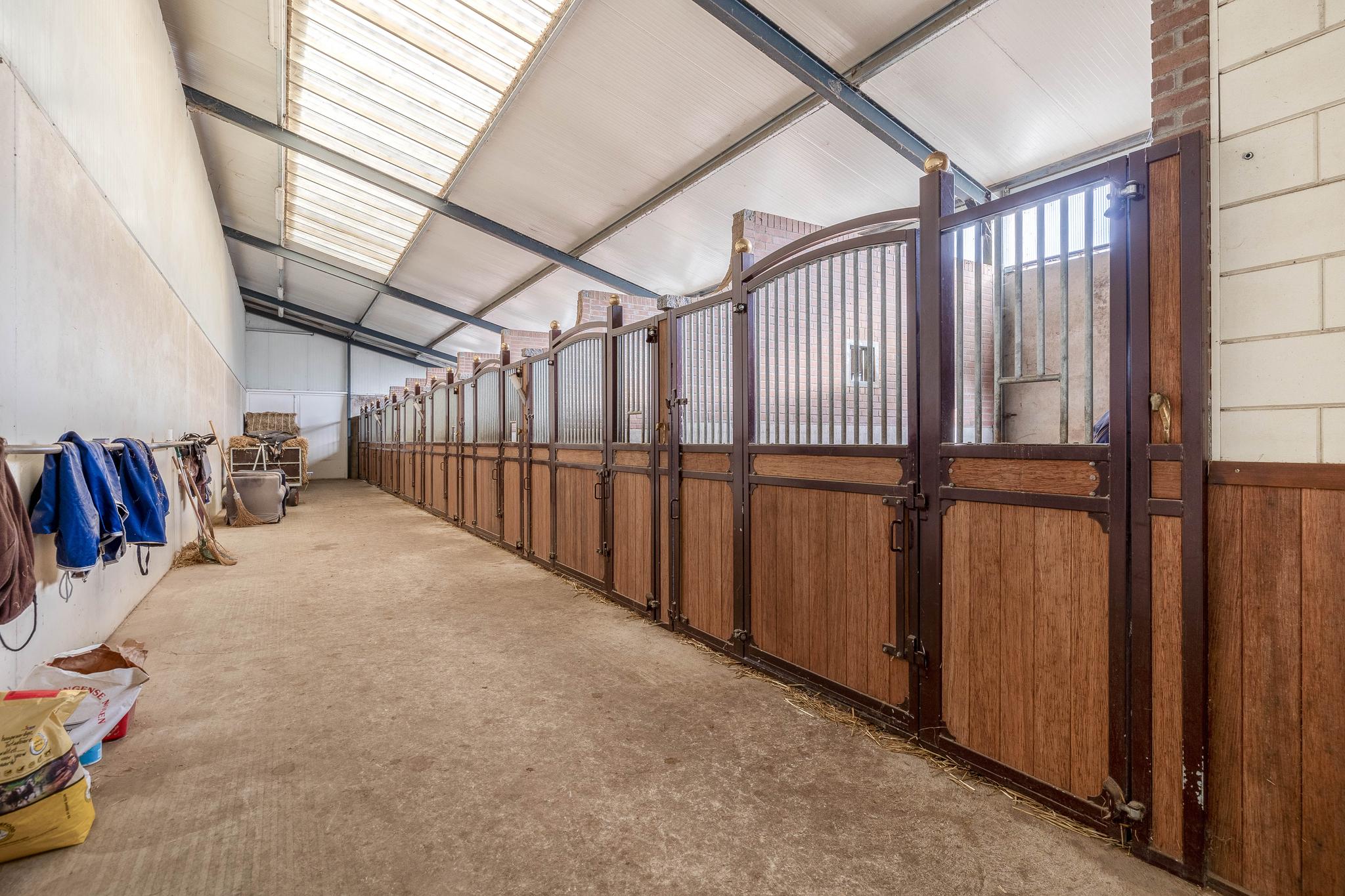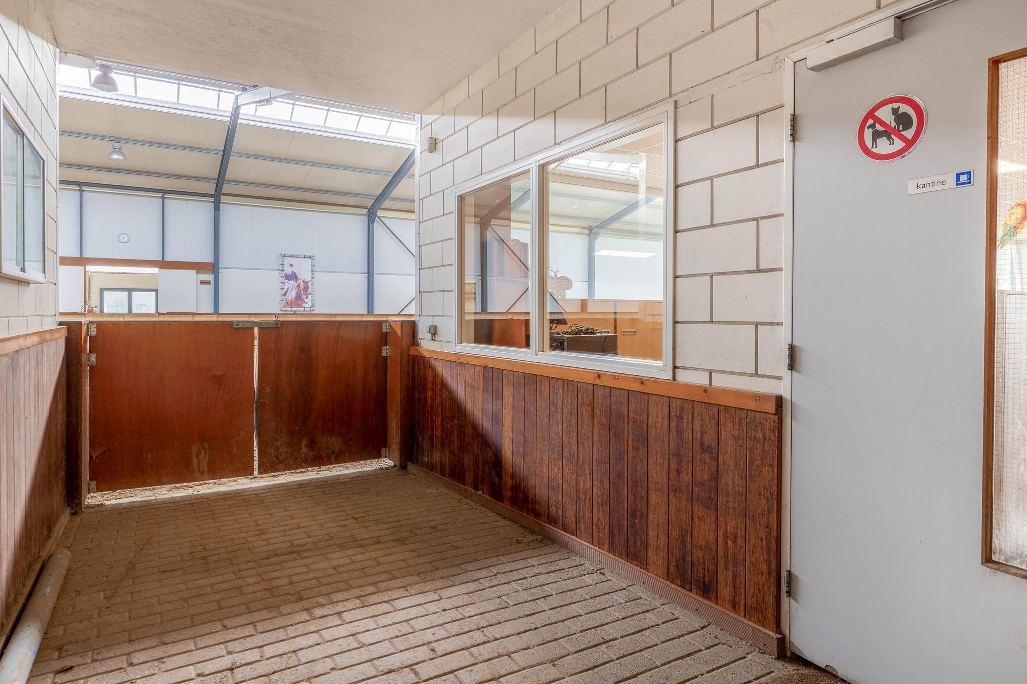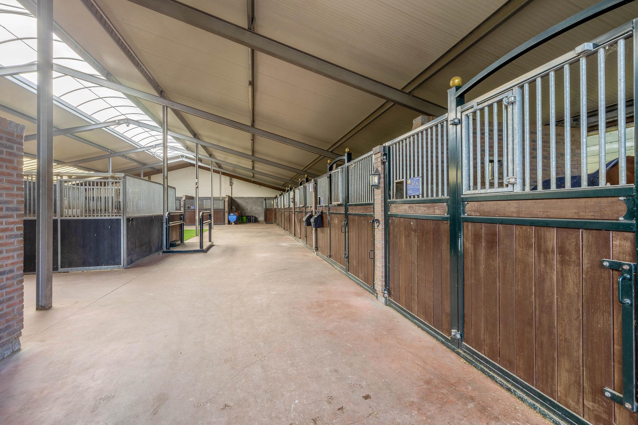 The stable section on the left side is equipped with 16 horse boxes. These stalls have partly hardwood / partly powder-coated and partly galvanised front walls. The partitions are of masonry and partly occupied. The doors the front walls are hinged. 2 stalls are equipped with partly plastic / partly galvanised front and partition walls and sliding doors. There is also 1 pony stall. There are 2 washing areas and a solarium. The washing areas are equipped with hot and cold water supply. From the stable area, there is access to a hall where the 2 saddle rooms are located. From this hall, there is also access to the reception area and indoor arena. The spacious reception area is finished with a tiled floor, part masonry/part stucco walls and a system ceiling. There is a toilet block consisting of a toilet room, disabled toilet and a portal with 2 washbasins. There is also a complete kitchen. The kitchen is equipped with an oven, combination microwave oven, dishwasher, built-in coffee maker, sink and hob. n the reception area, the meter cupboard is located. This is where the central heating combi boiler is located. The room also has an alarm system. From the reception area, there are lovely views of the indoor arena. French doors provide access to the yard. The adjoining indoor arena (approx. 20mtr. x 60mtr.) is equipped with an ebb and flow floor and a hardwood arena surround (Horsmans). A skylight in the ridge and windows in the end wall provide natural light and ventilation. Furthermore, the arena is equipped with a mirror wall. A rolling door at the rear wall provides access to the yard. From the indoor arena, there is access to the stable area on the right. This stable area has 13 horse stalls. These stalls (approx. 4mtr. x 3mtr.) are fitted with partly powder-coated / partly galvanised and hinged doors. The stalls are also equipped with an exterior hatch. There is also a tack room, washing area and solarium here. From this stable area, there is access to a canteen. This canteen is finished with laminate flooring and a system ceiling. The canteen has a separate central heating boiler. French doors on the rear elevation provide access to the yard.
