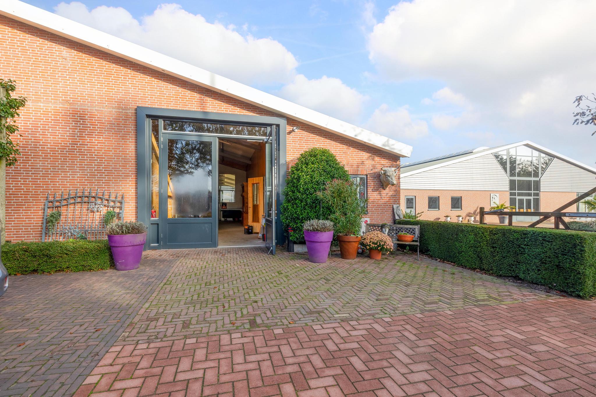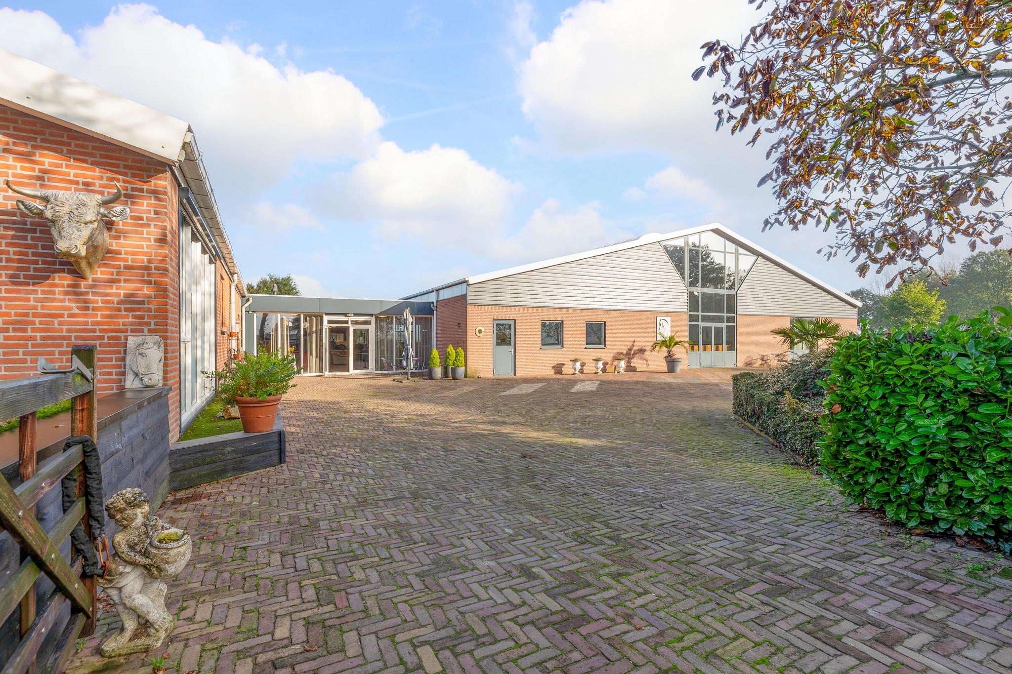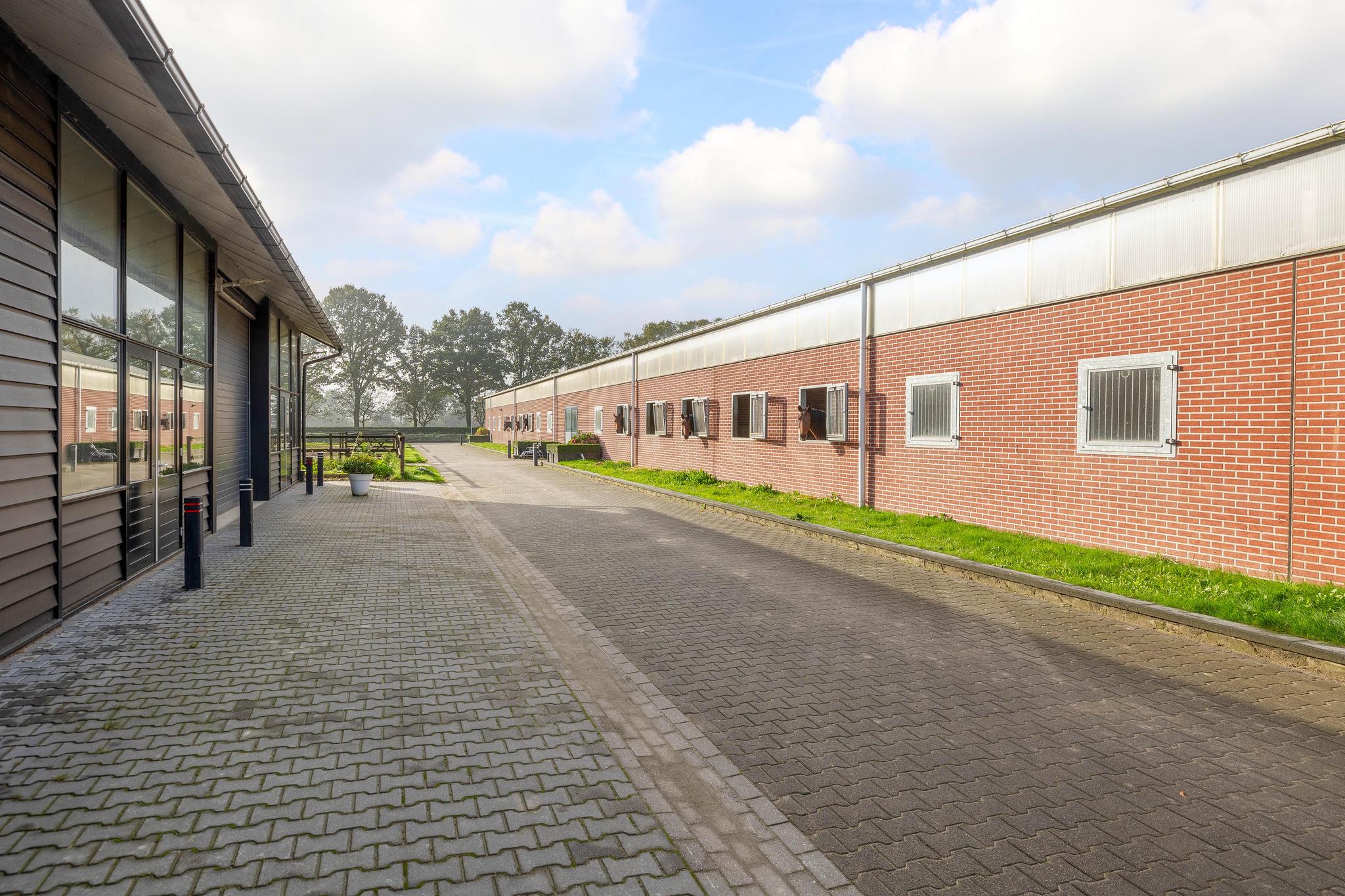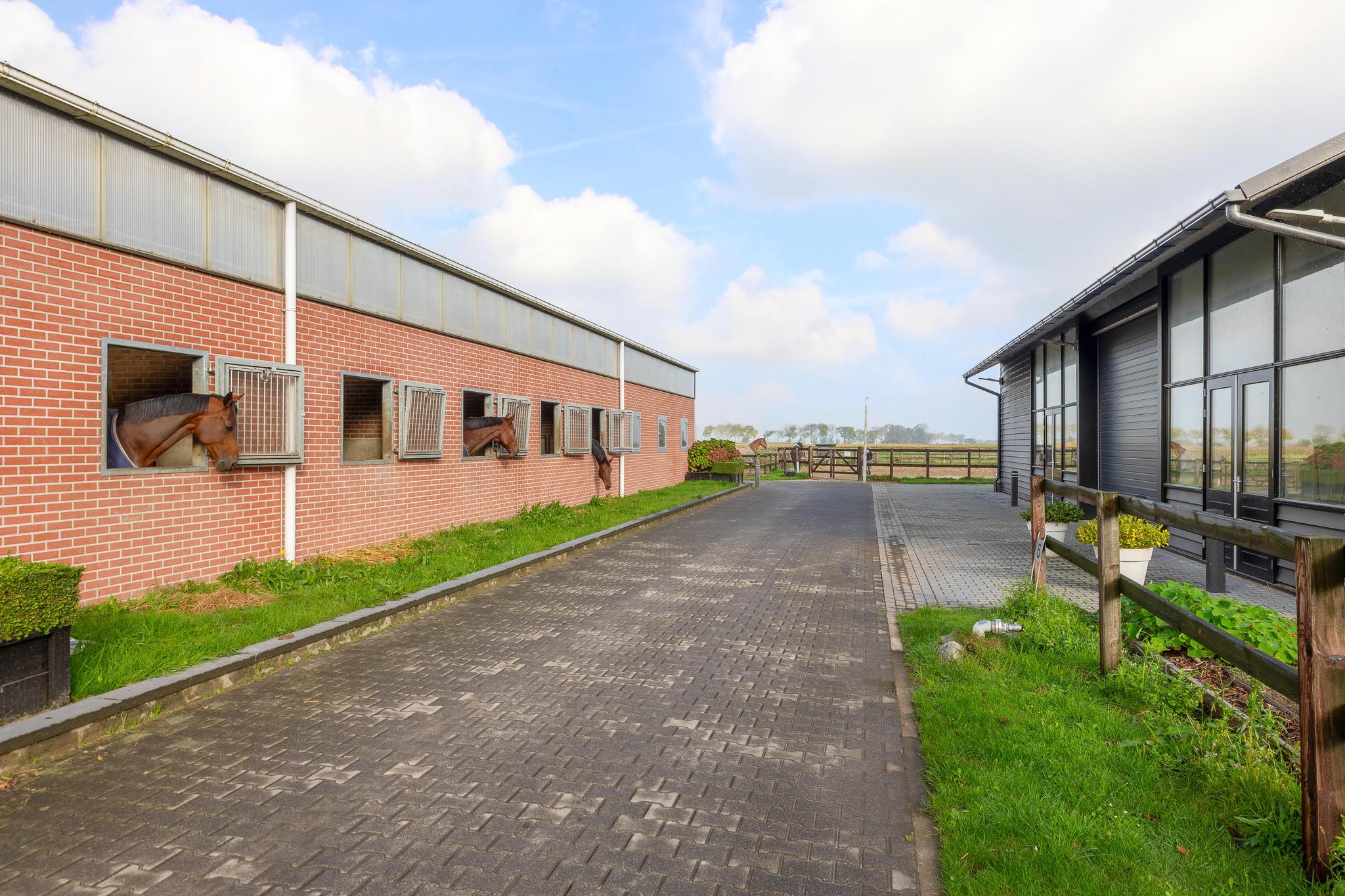 The stable section on the left side is equipped with 16 horse boxes. These stalls have partly hardwood / partly powder-coated and partly galvanised front walls. The partitions are of masonry and partly occupied. The doors the front walls are hinged. 2 stalls are equipped with partly plastic / partly galvanised front and partition walls and sliding doors. There is also 1 pony stall. There are 2 washing areas and a solarium. The washing areas are equipped with hot and cold water supply. From the stable area, there is access to a hall where the 2 saddle rooms are located. From this hall, there is also access to the reception area and indoor arena. The spacious reception area is finished with a tiled floor, part masonry/part stucco walls and a system ceiling. There is a toilet block consisting of a toilet room, disabled toilet and a portal with 2 washbasins. There is also a complete kitchen. The kitchen is equipped with an oven, combination microwave oven, dishwasher, built-in coffee maker, sink and hob. n the reception area, the meter cupboard is located. This is where the central heating combi boiler is located. The room also has an alarm system. From the reception area, there are lovely views of the indoor arena. French doors provide access to the yard. The adjoining indoor arena (approx. 20mtr. x 60mtr.) is equipped with an ebb and flow floor and a hardwood arena surround (Horsmans). A skylight in the ridge and windows in the end wall provide natural light and ventilation. Furthermore, the arena is equipped with a mirror wall. A rolling door at the rear wall provides access to the yard. From the indoor arena, there is access to the stable area on the right. This stable area has 13 horse stalls. These stalls (approx. 4mtr. x 3mtr.) are fitted with partly powder-coated / partly galvanised and hinged doors. The stalls are also equipped with an exterior hatch. There is also a tack room, washing area and solarium here. From this stable area, there is access to a canteen. This canteen is finished with laminate flooring and a system ceiling. The canteen has a separate central heating boiler. French doors on the rear elevation provide access to the yard.