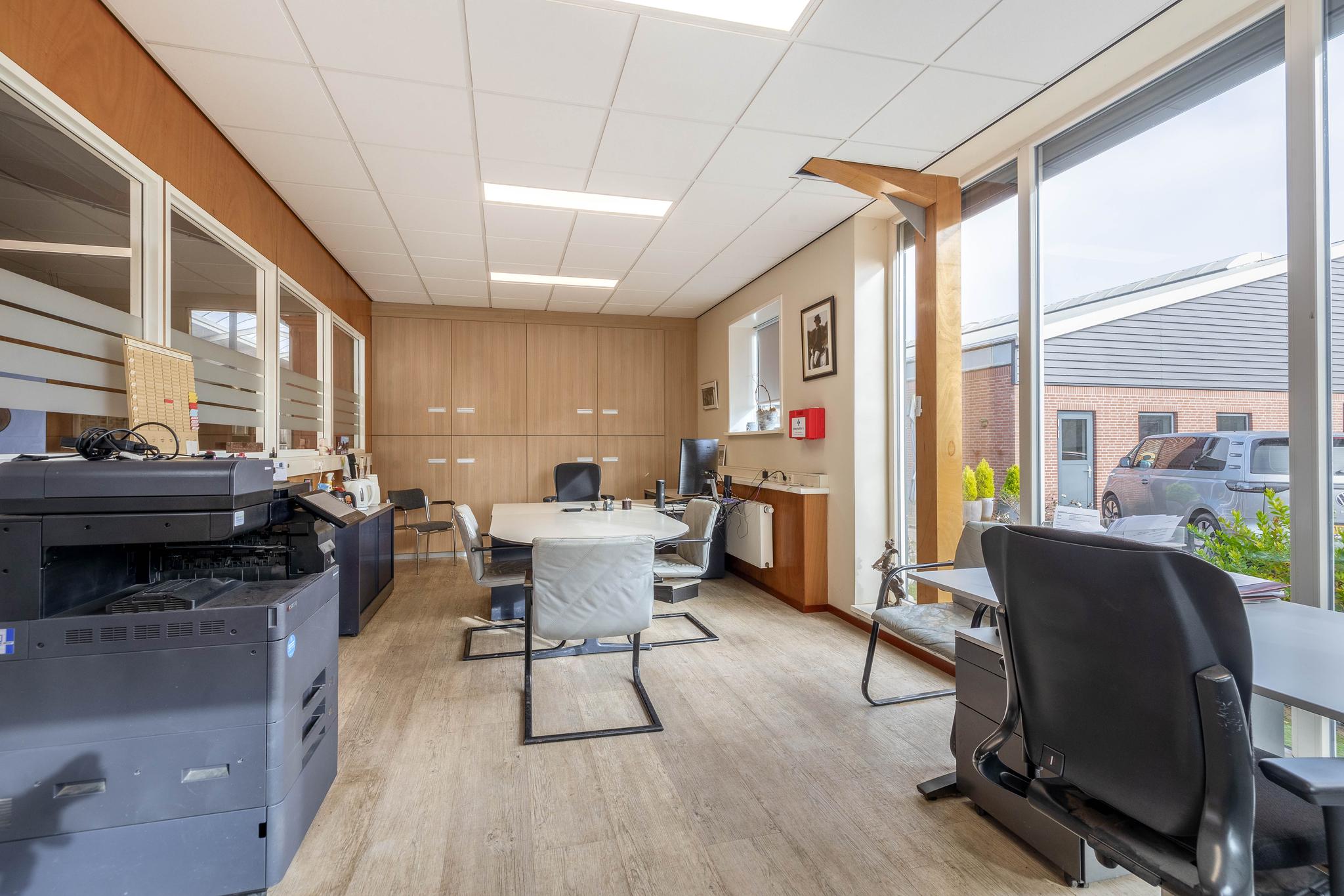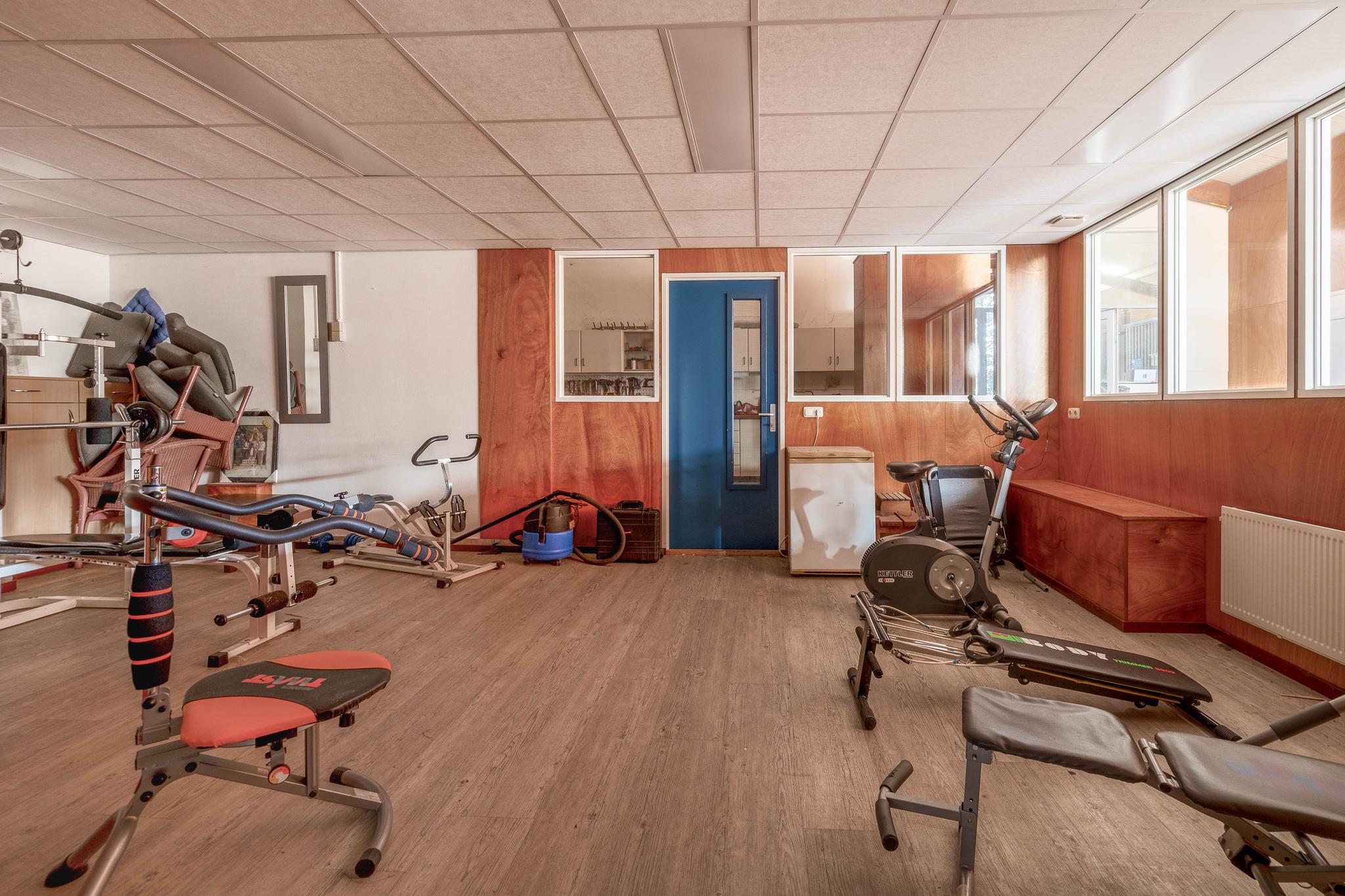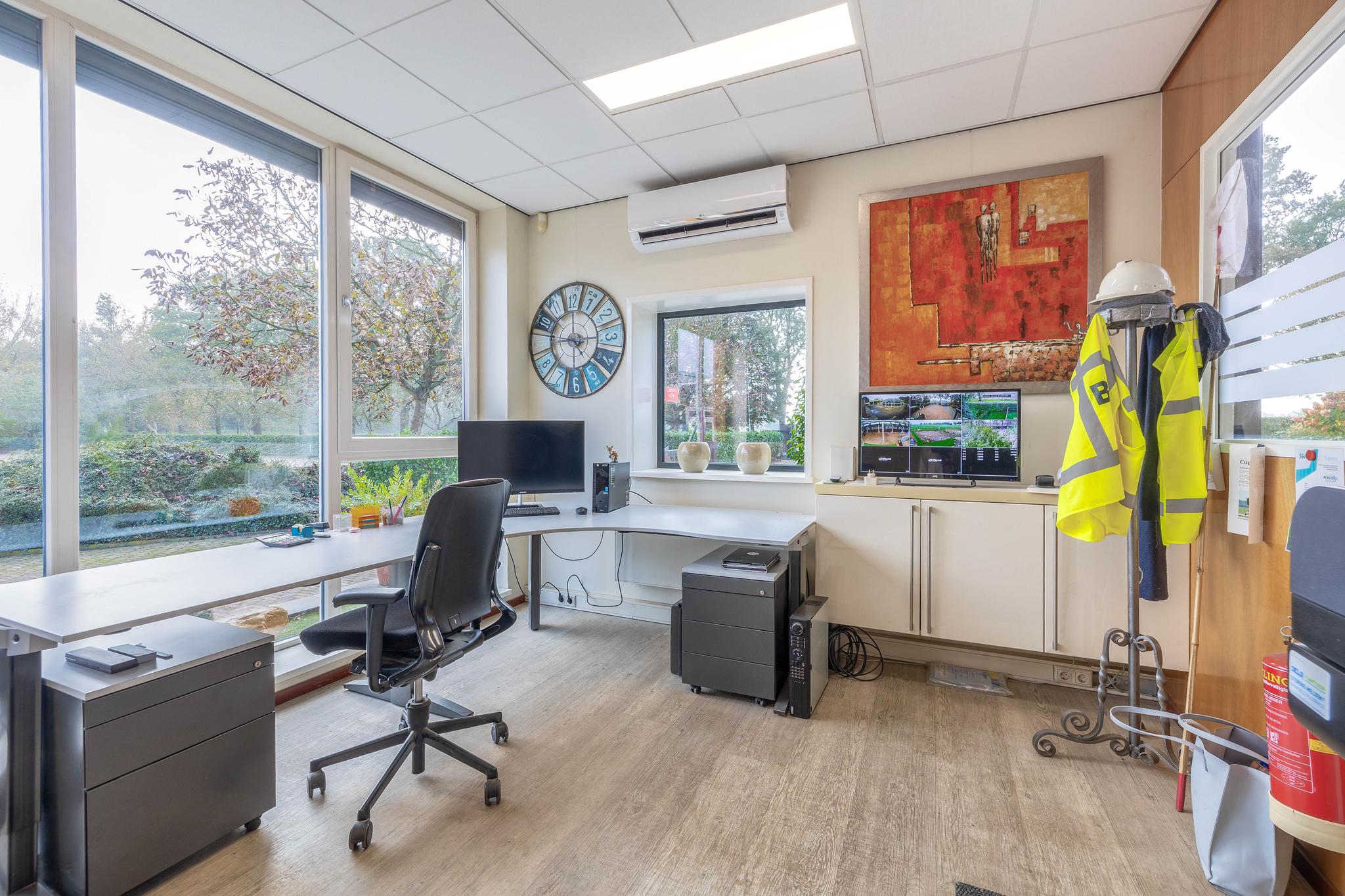 An office area with storage, workshop and multi-purpose room and a flat are located at the front of the building. The office area has a PVC floor, stucco walls and a system ceiling. There is also air conditioning. Large windows provide plenty of natural light and practical views of the entrance gate and car park. The storage room is equipped with the sprinkler pump for the rain slope, meadows and garden. It also houses the inverter for the solar panels (81 units). The workshop with concrete floor is equipped with fixed cupboards and the connections for the washing equipment. A fixed staircase provides access to the attic space. The multi-purpose room, currently used as a gym, has a PVC floor, partly masonry / partly stucco walls and a system ceiling. The connection for the central heating boiler serving the gym and the flat is located here. From this room there is access to the flat and a fixed staircase provides access to the attic space.