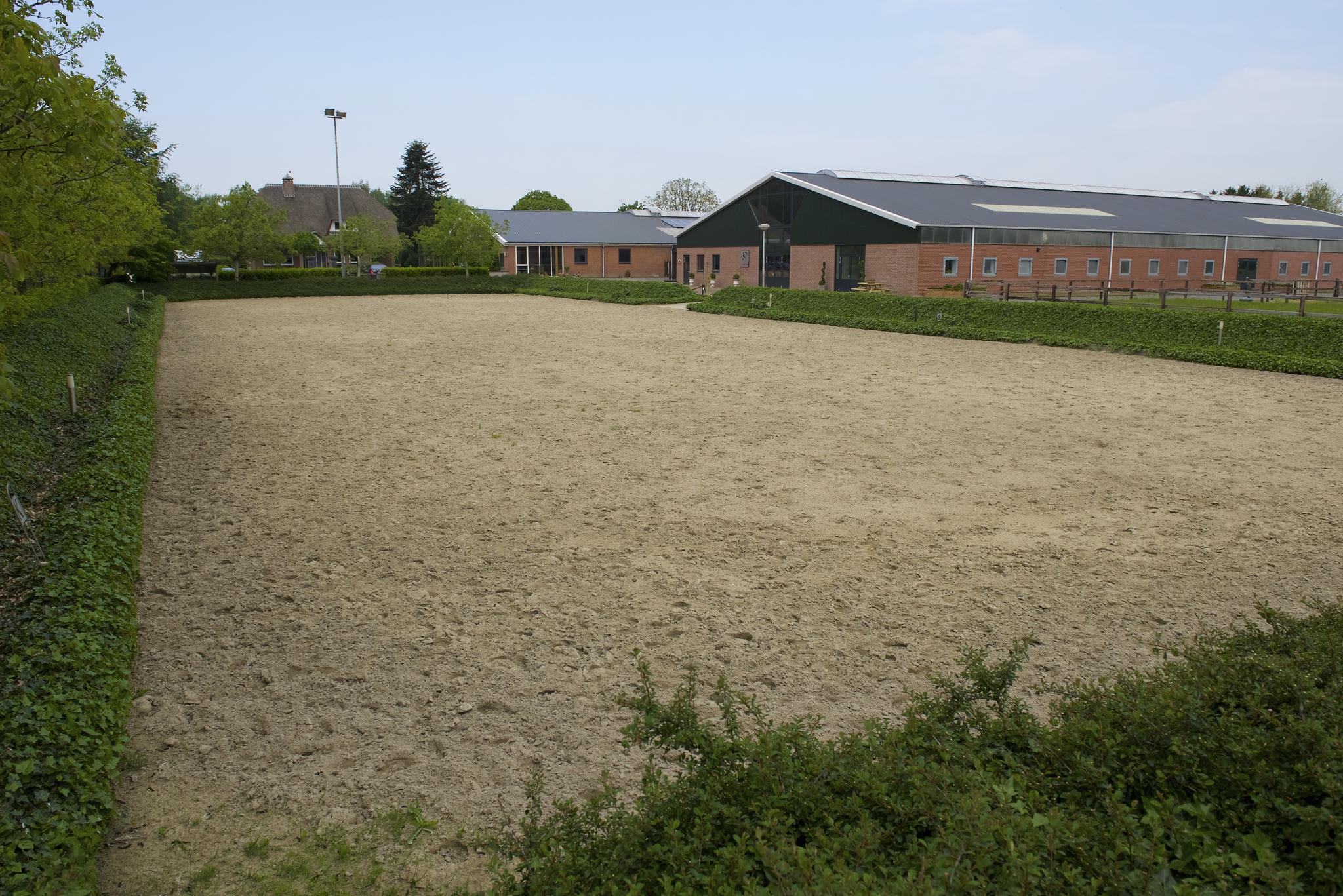 The adjacent paddocks (2 pcs) are equipped with a wooden fence. The outdoor arena (approx. 25mtr. x 65mtr.) has a sandy floor with sprinkler system. The arena is fenced off with a beech hedge and is also equipped with lighting.