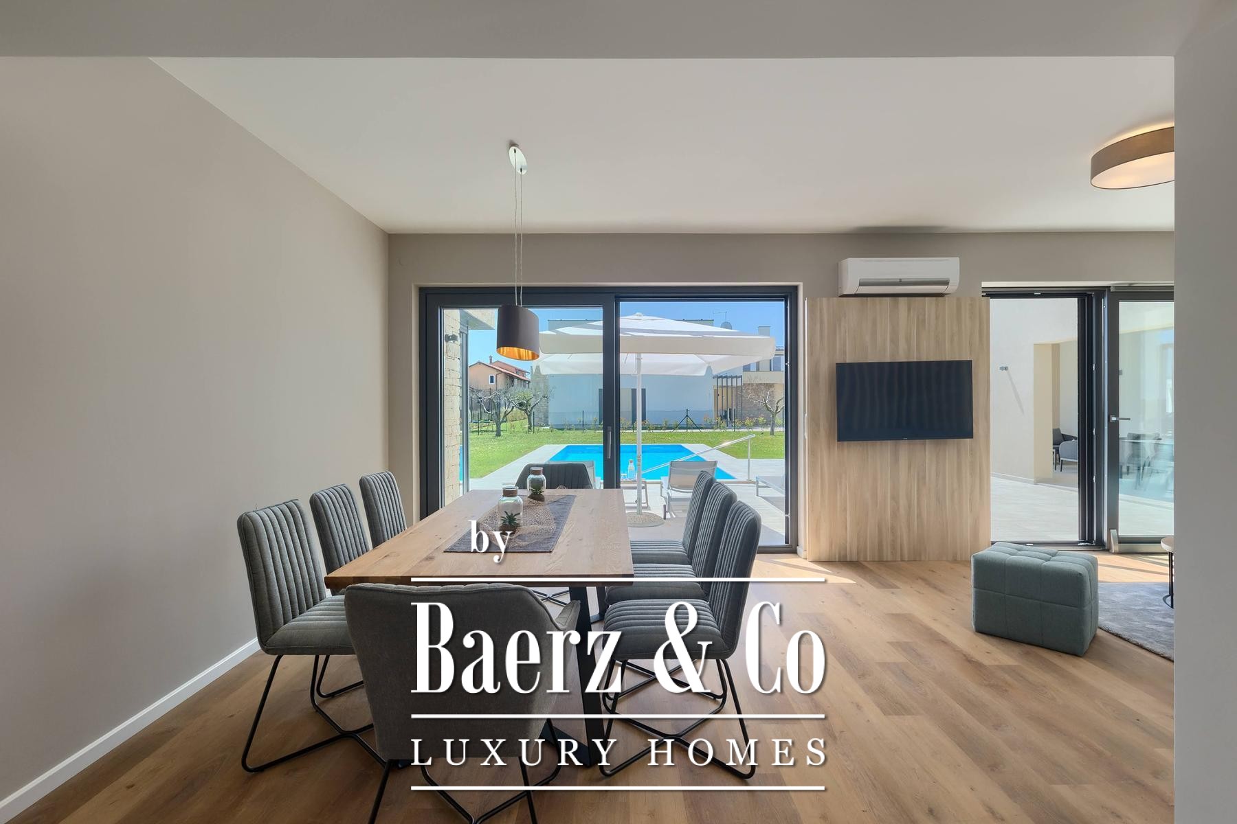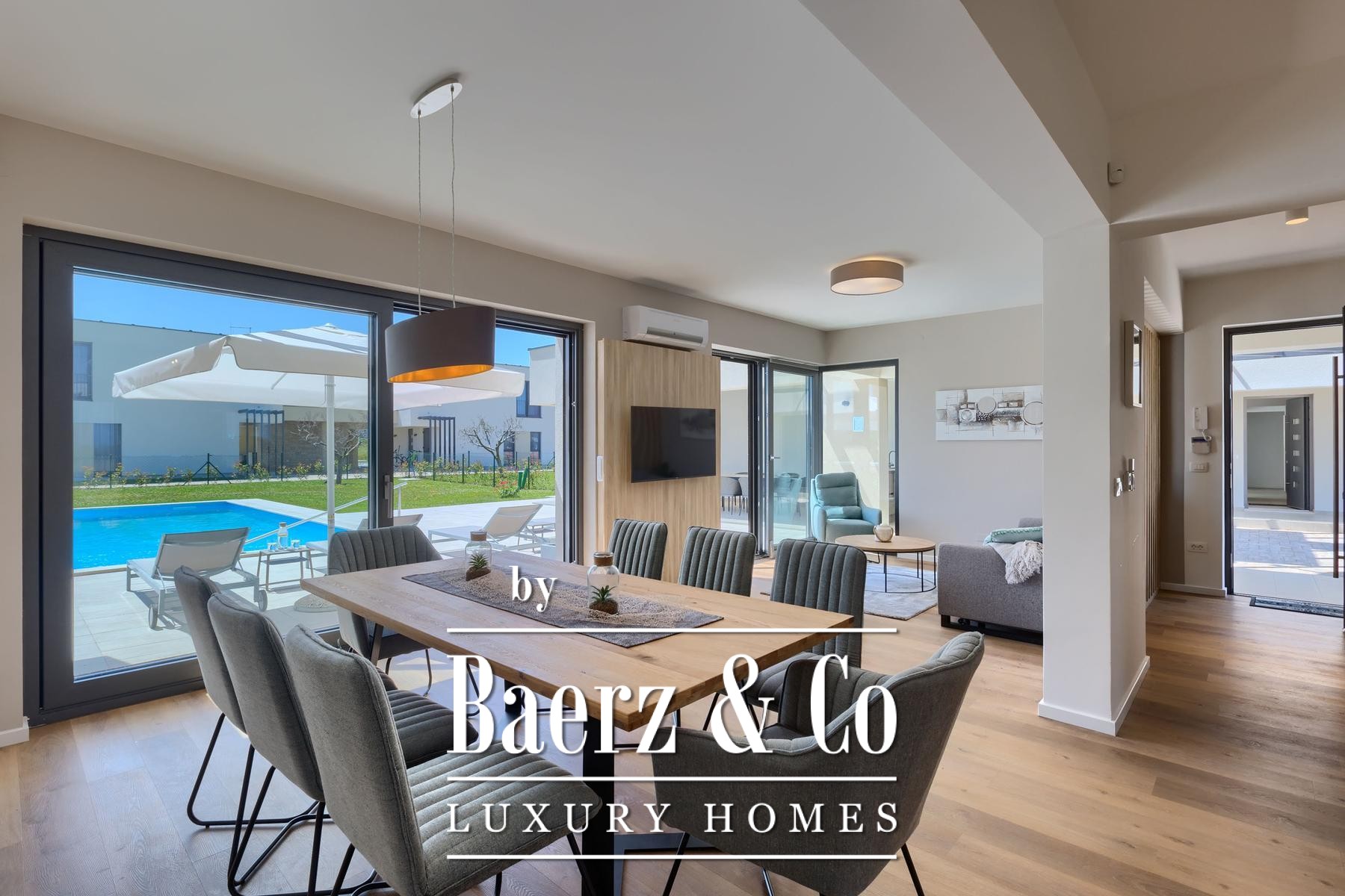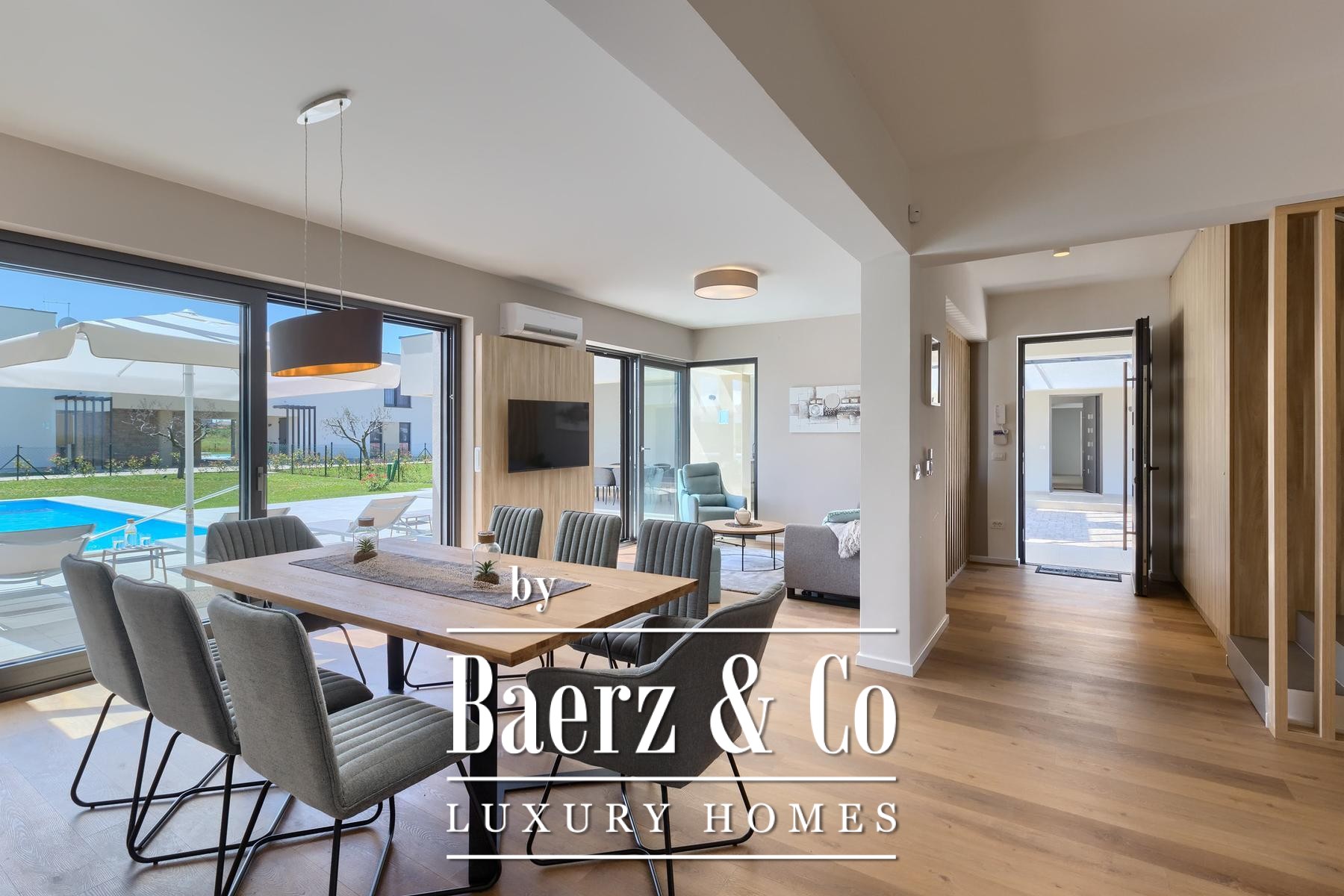 Townhouse Brtonigla is set in the heart of this picturesque Istrian town, surrounded by expansive greenery and mature olive groves. The property offers 274 m² of living space across two levels. The entry leads to an open-plan living room, a modern kitchen and dining area, and a bedroom suite with direct pool access. Practical features include a storage room, technical facilities, and a guest toilet with laundry.