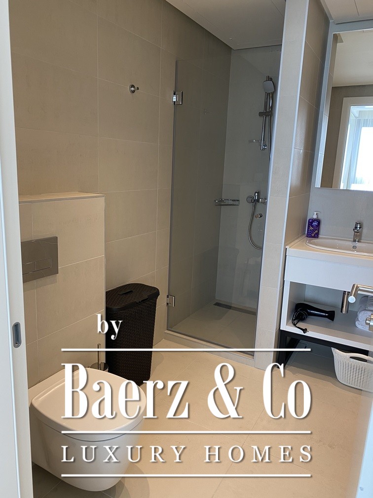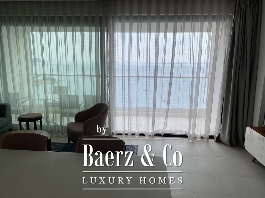 Floor-to-ceiling windows open onto a spacious balcony, framing unbroken views of the sea. Each room is equipped with air conditioning, ensuring year-round comfort. The two bathrooms provide both shower and bathtub options, catering to personal preference and daily ritual.