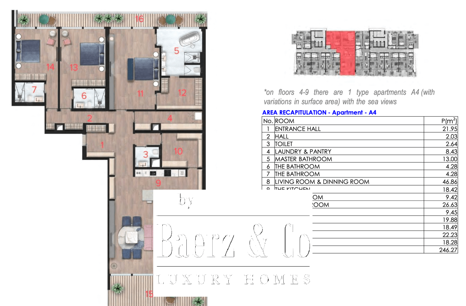 Apartment Budva is gracefully positioned on the sixth floor of a five-star development on the first line to the sea, moments from Budva Old Town. This apartment Budva embodies understated luxury and contemporary dimensions, offering 246 m² of living space with an open floor plan, dining area, kitchen and three bedrooms, each with its own en suite bathroom. Two terraces frame distinct perspectives, one toward the sea and Old Town, the other over the rhythm of the city.