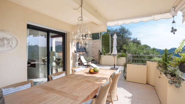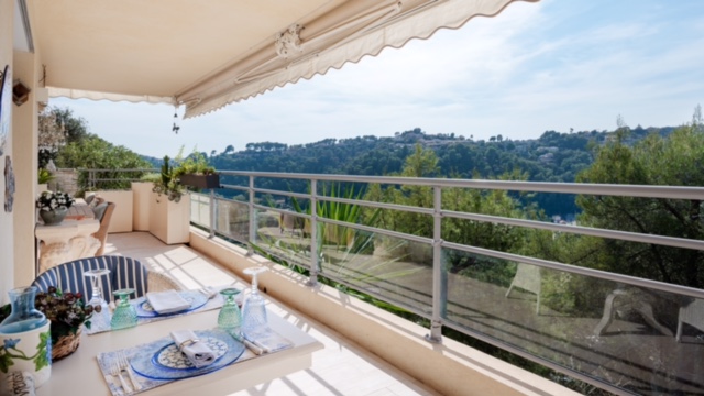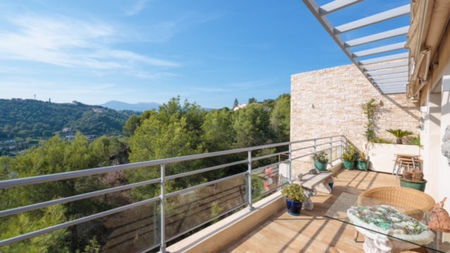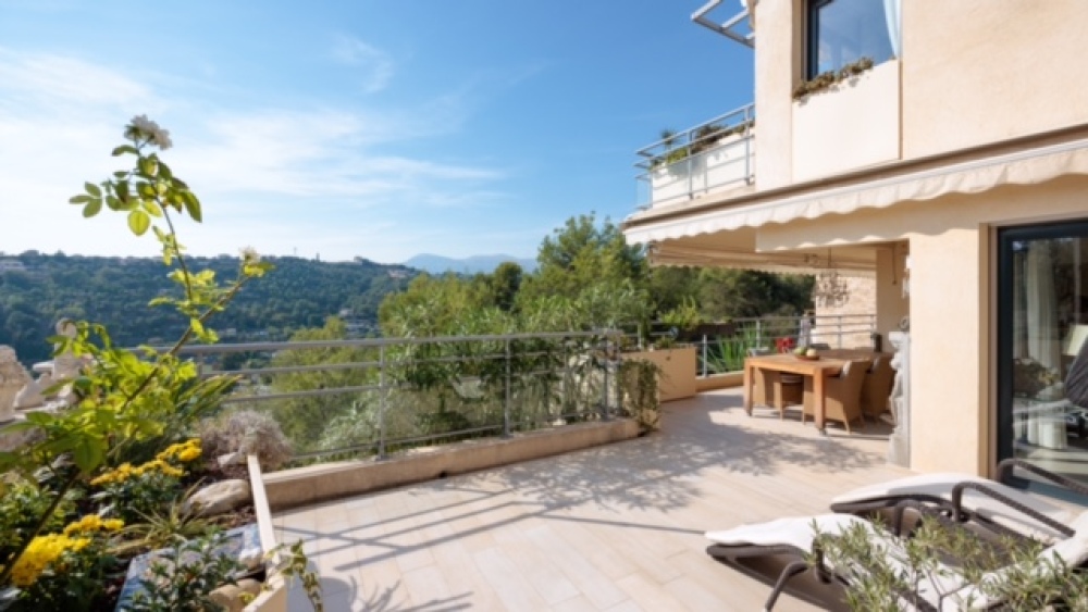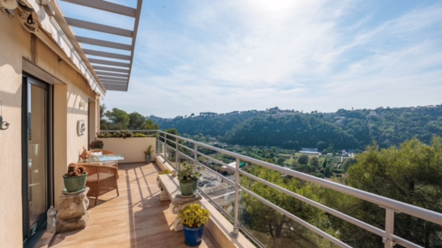 Luxurious and beautifully located flat (108 m2) with two large terraces overlooking the ''old Cagnes''. Private lift, three private parking spaces, storage room and garden. Lovely to live here!