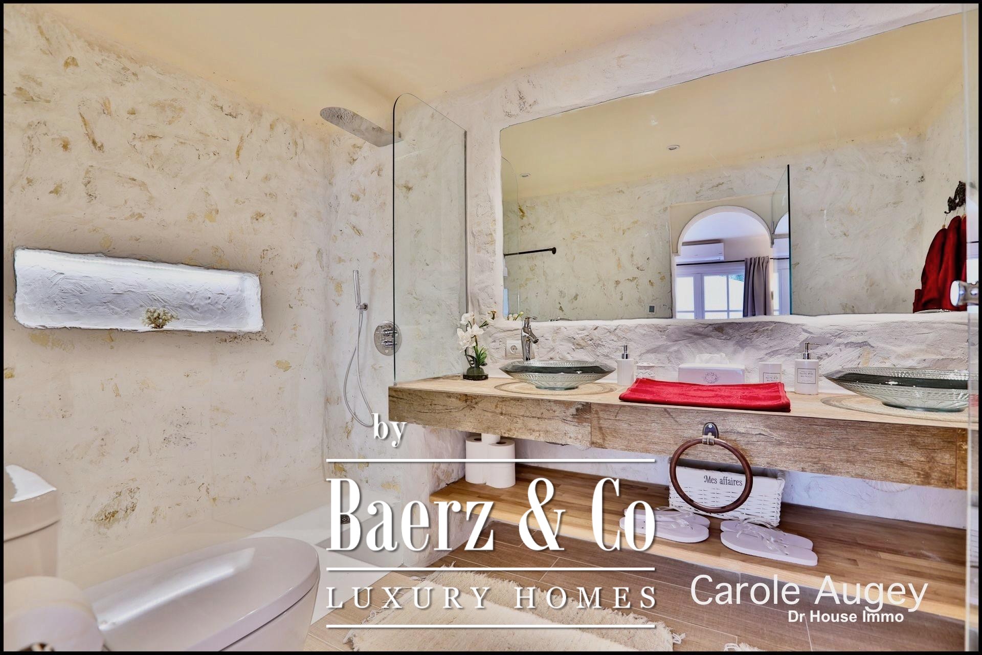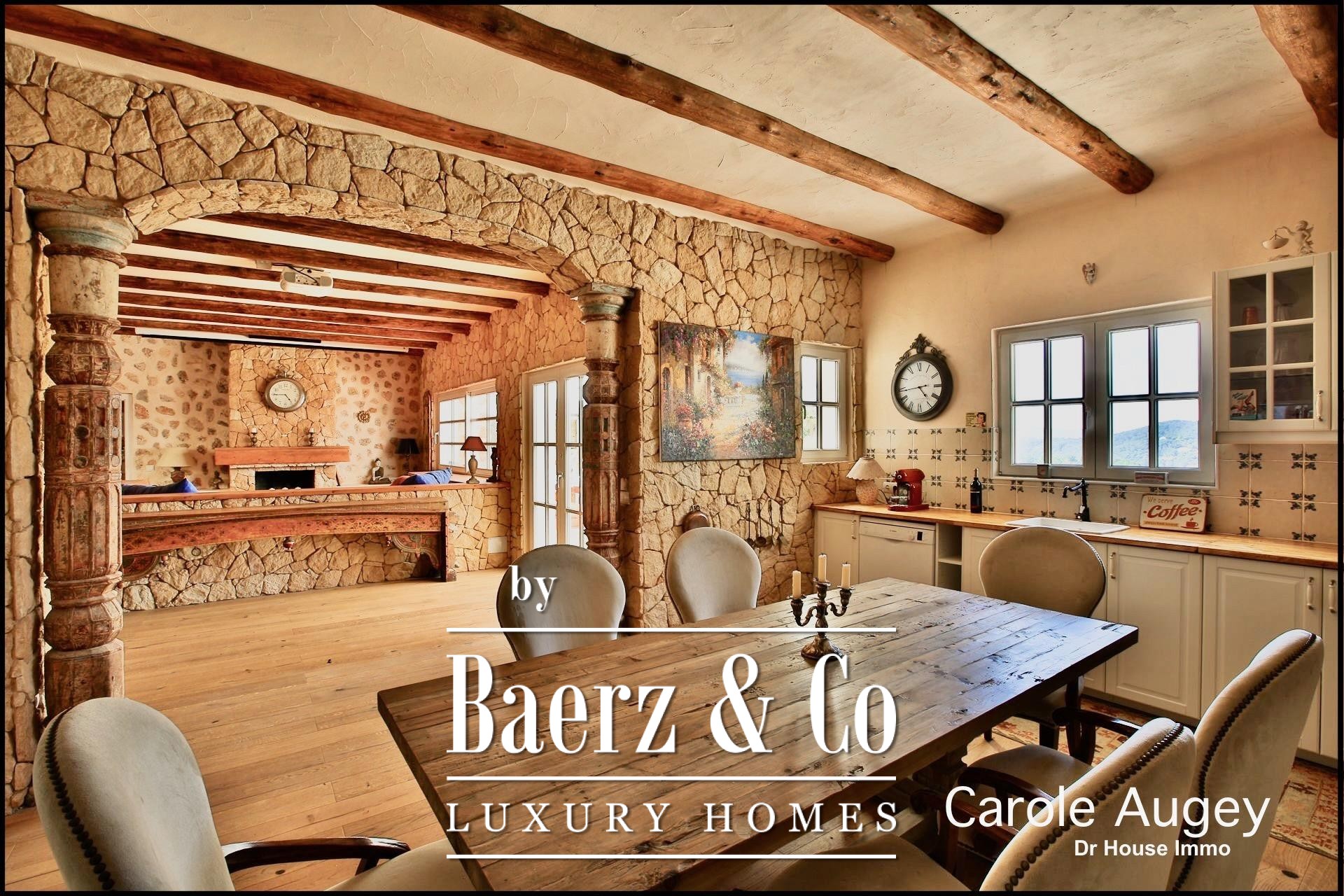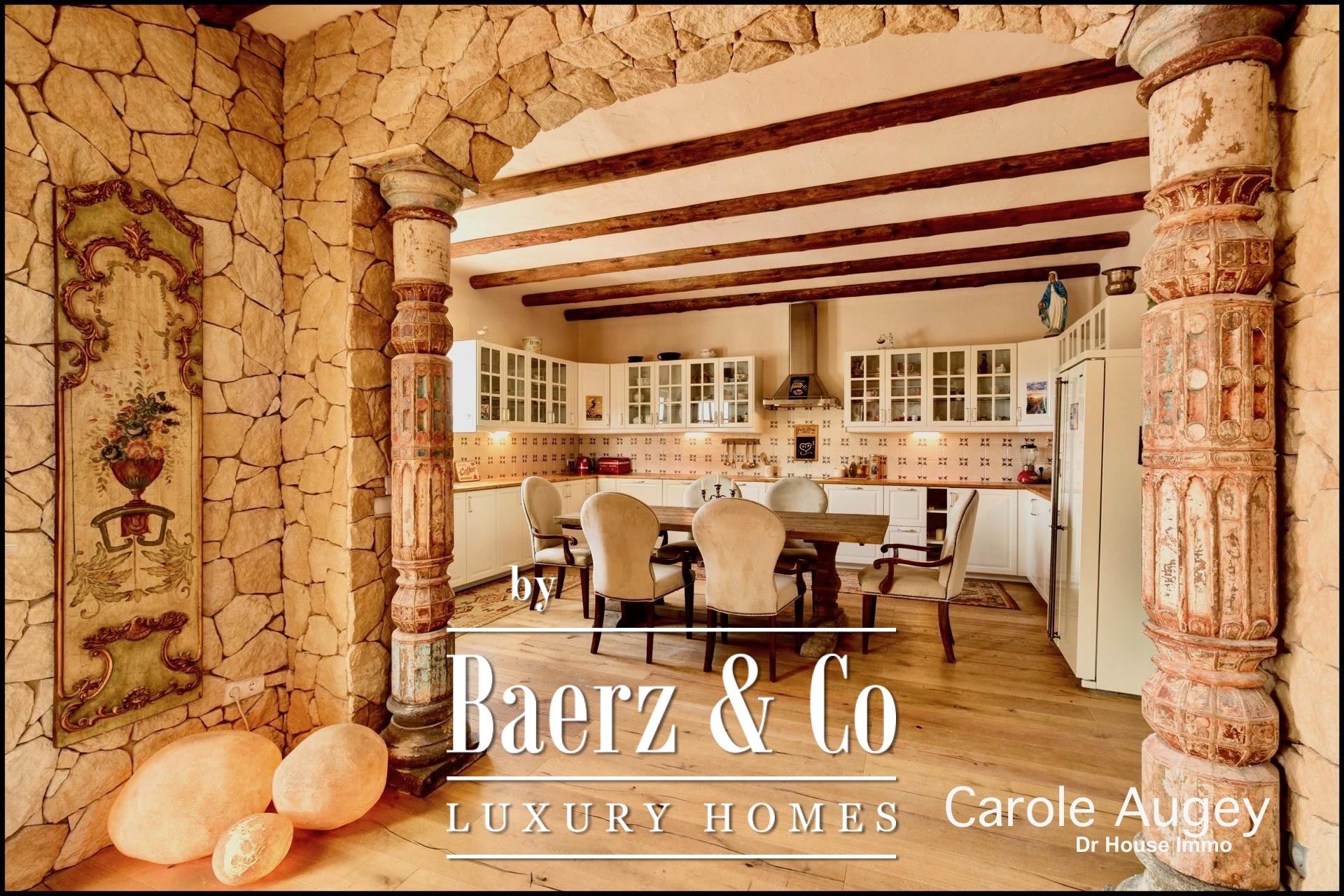 The villa’s main gathering areas invite restoration and conviviality. A state-of-the-art home cinema, a striking fireplace, and a chef’s kitchen anchor the expansive interiors, while outside, shaded pergolas and a heated infinity pool bring the landscape close. The terrace’s shaded dining area and casual lounges are poised for long evenings overlooking the hills.