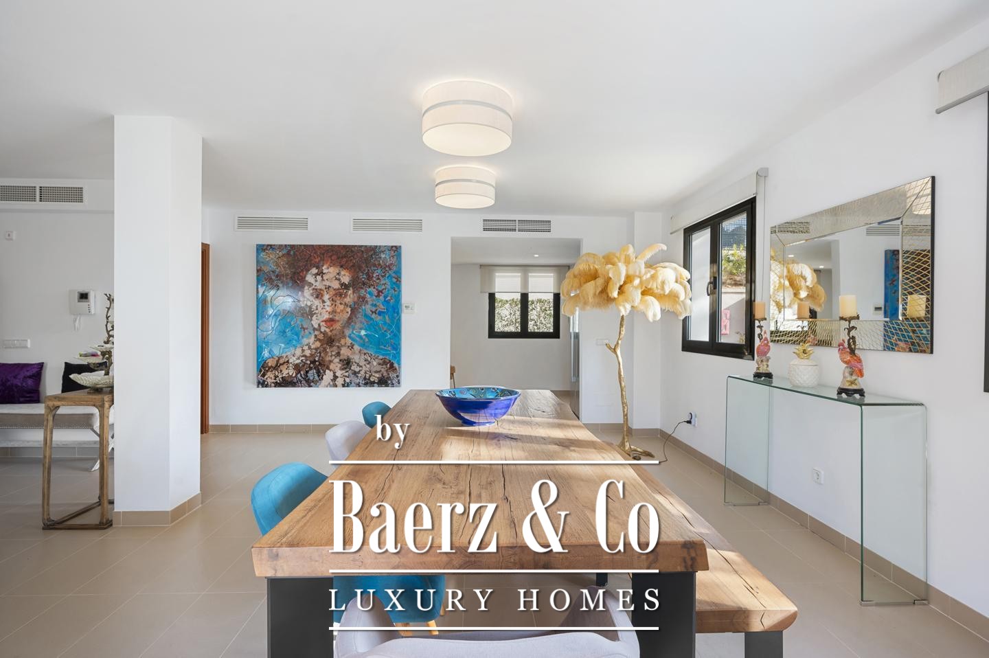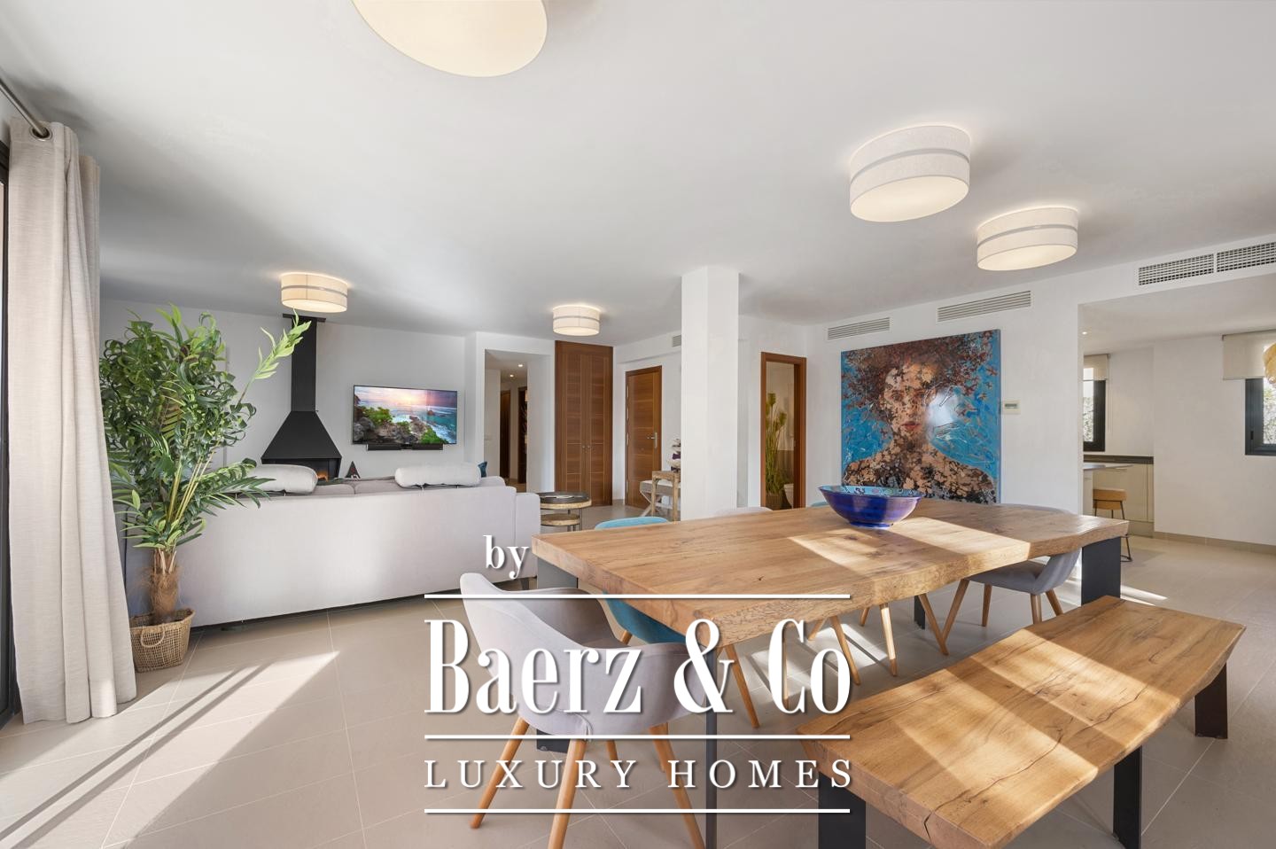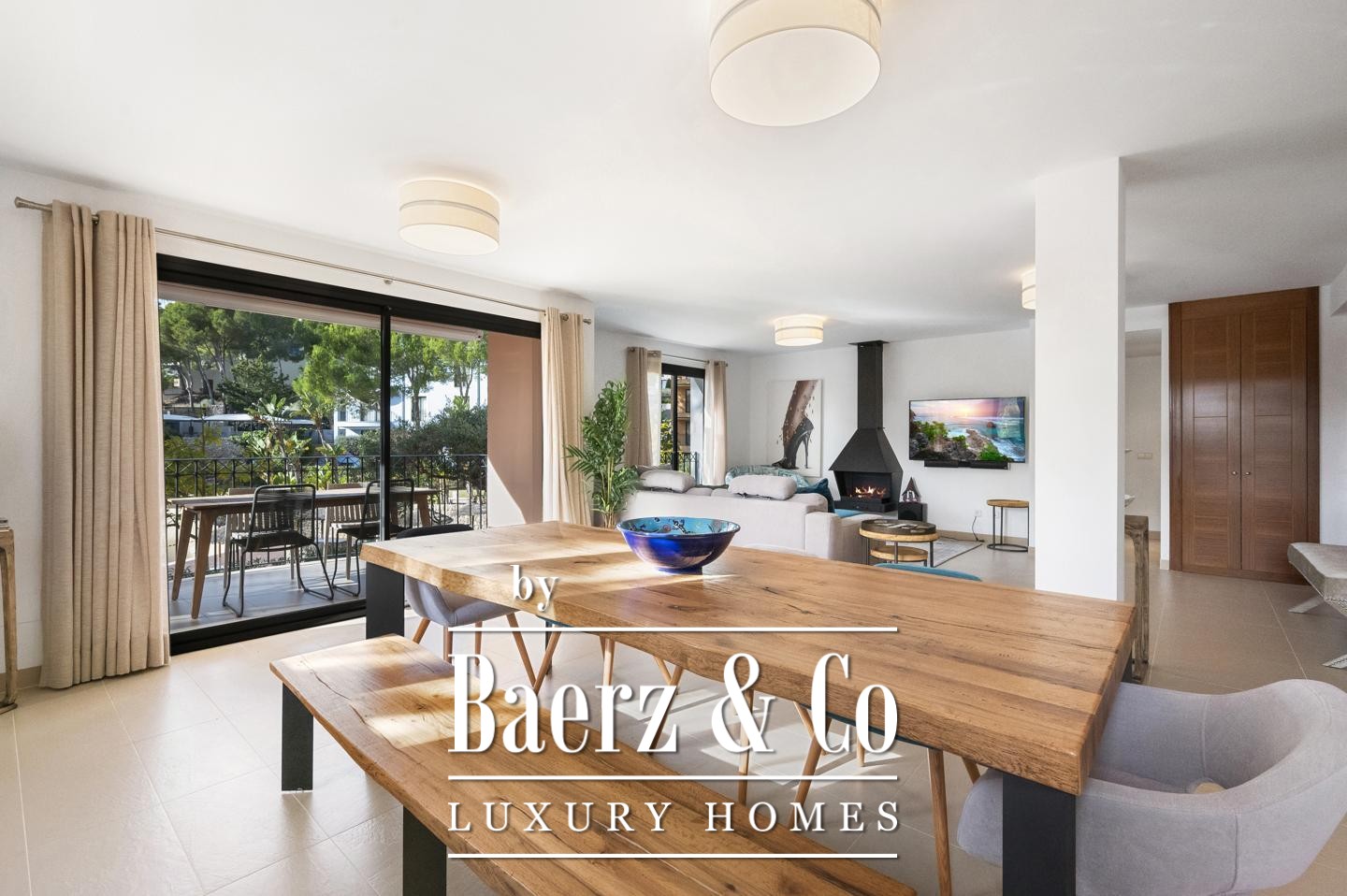 The living and dining areas are illuminated by natural light, opening directly to a spacious terrace that balances indoor serenity with outdoor connection. An open-plan kitchen, curated with modern appliances and direct access to a private garden space, underscores the spatial harmony throughout. High quality designer furniture shapes the interior, while tile and stone flooring contribute an understated, enduring elegance.