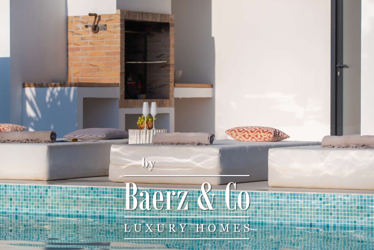Each of the 5 spacious bedrooms includes an en suite bathroom, with marble finishes, gold fixtures, and walk-in showers. The master suite offers a freestanding bath and serene countryside views. Open living spaces are complemented by a modern fireplace, a sleek marble kitchen bar, underfloor heating, and air conditioning for year-round comfort.