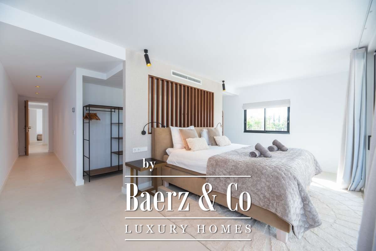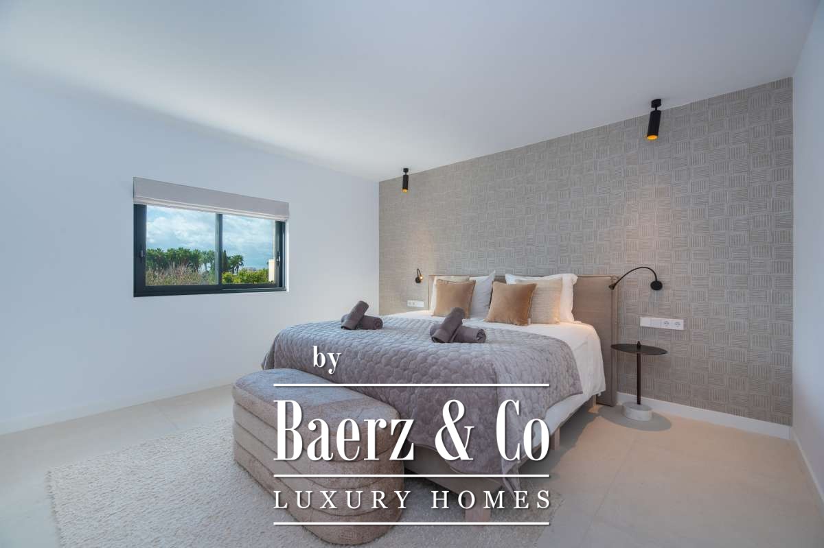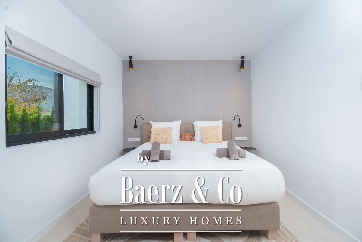 Outdoor living is celebrated with a private swimming pool, a covered patio for al fresco dining, a built-in barbecue, and multiple terraces. Landscaped gardens, a rooftop terrace, sun beds, and secure, fully fenced grounds ensure privacy and tranquility. Additional features include garage and outdoor parking, alarm system, and amenities such as internet, double glazing, and smart security. This villa in Can Ramón encapsulates refined Mediterranean living with convenient access to Ibiza’s beaches, marinas, and city life.
