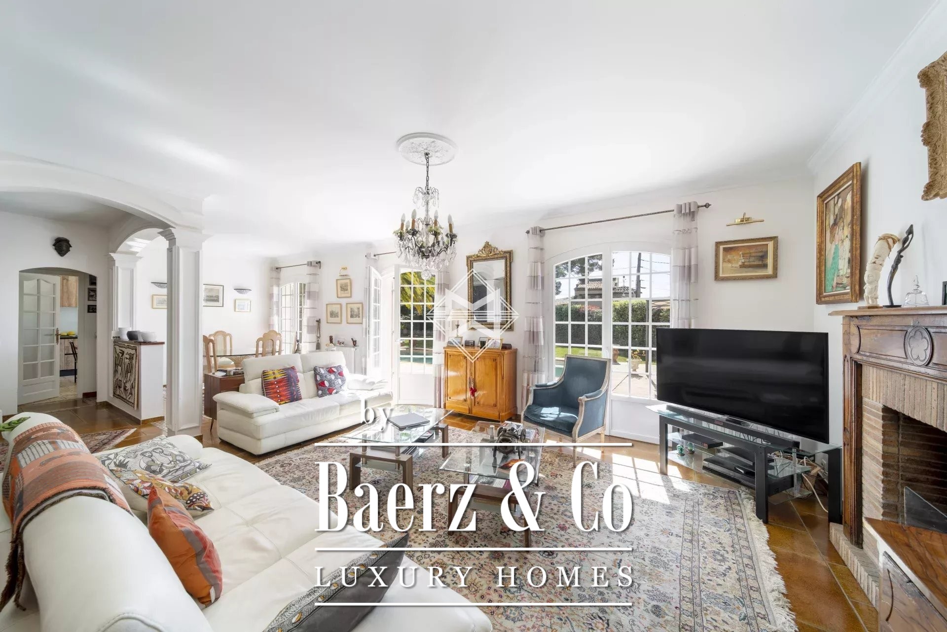 The villa includes a 70 m² basement garage for three cars and motorcycles, supplemented by four exterior parking spaces. A swimming pool, fireplace, double glazing, and convector heating amplify both comfort and refined simplicity. For those seeking a luxury villa for sale in Le Cannet, this property offers a poised retreat within the French Riviera’s most discerning community.