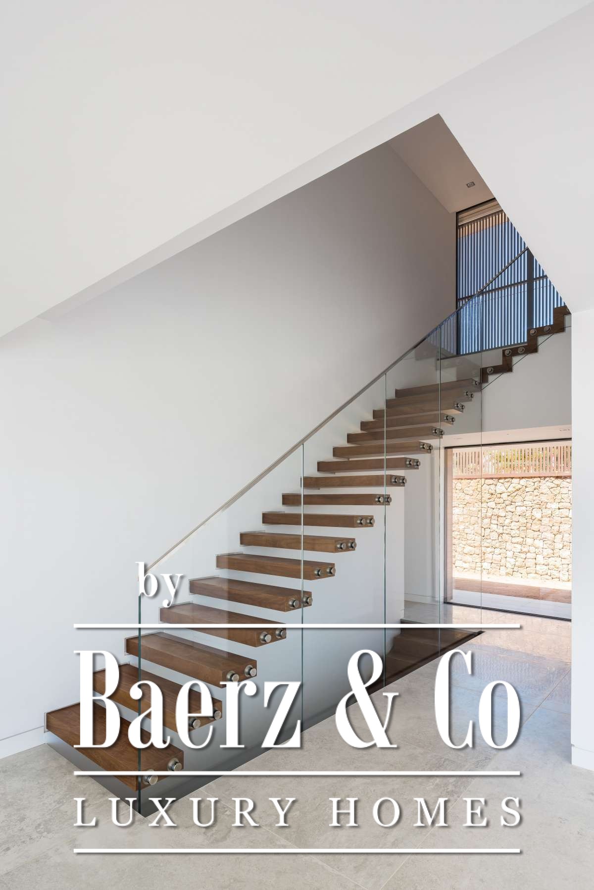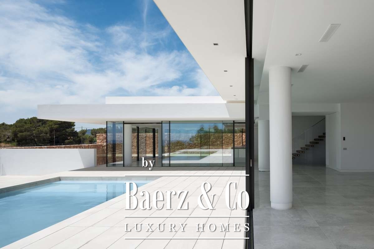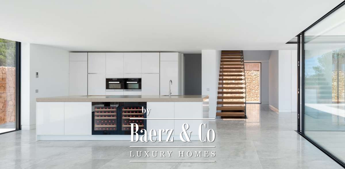 The open-plan kitchen features marble floors, a generous island, wine cooler, and integrated high-end appliances. Outdoor spaces flow into lush gardens, a spacious heated pool, covered terraces, and a private garage on a plot of 1,000 m². Talamanca Beach is a short walk away, while Dalt Villa and Marina Botafoch are easily reached within minutes, situating this villa in the heart of Ibiza’s vibrant yet private lifestyle. Luxury villa for sale in Cap Martinet blends serenity and contemporary sophistication.