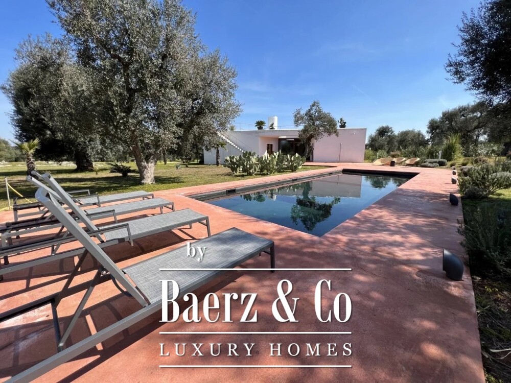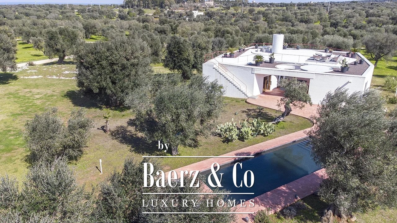 Outdoors, a 12 by 4 meter swimming pool is positioned within mature olive trees. Additional amenities include internet wi-fi, air conditioning, security service, electric gate, videophone, and covered parking. For those seeking a property that elevates design in a gentle natural setting, this villa in Carovigno offers a striking balance.