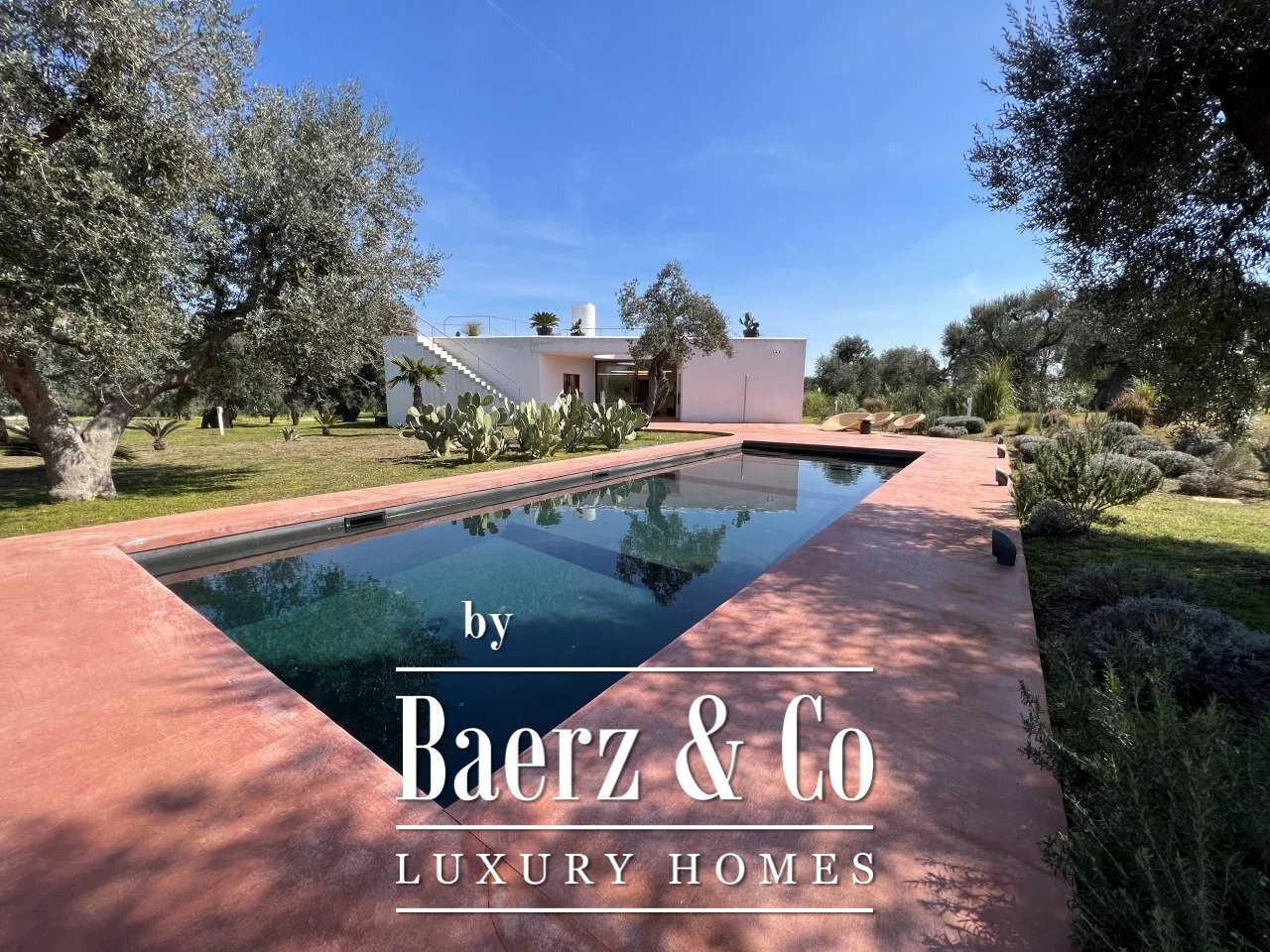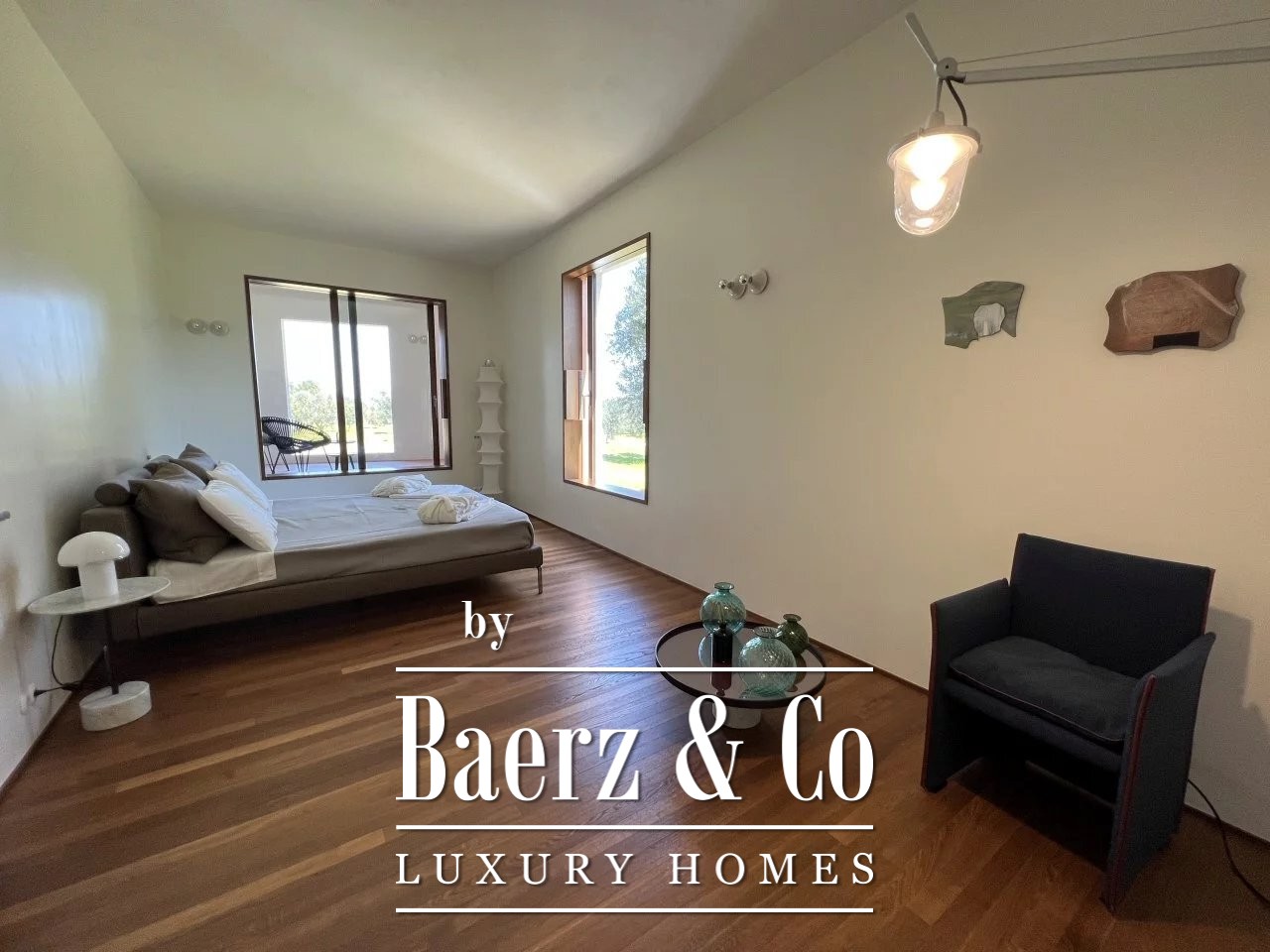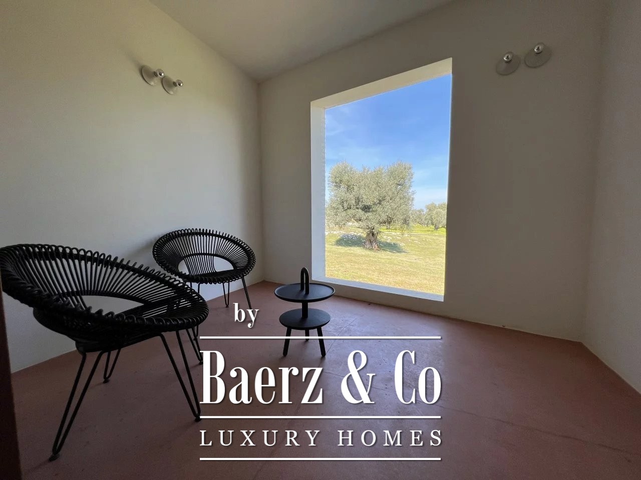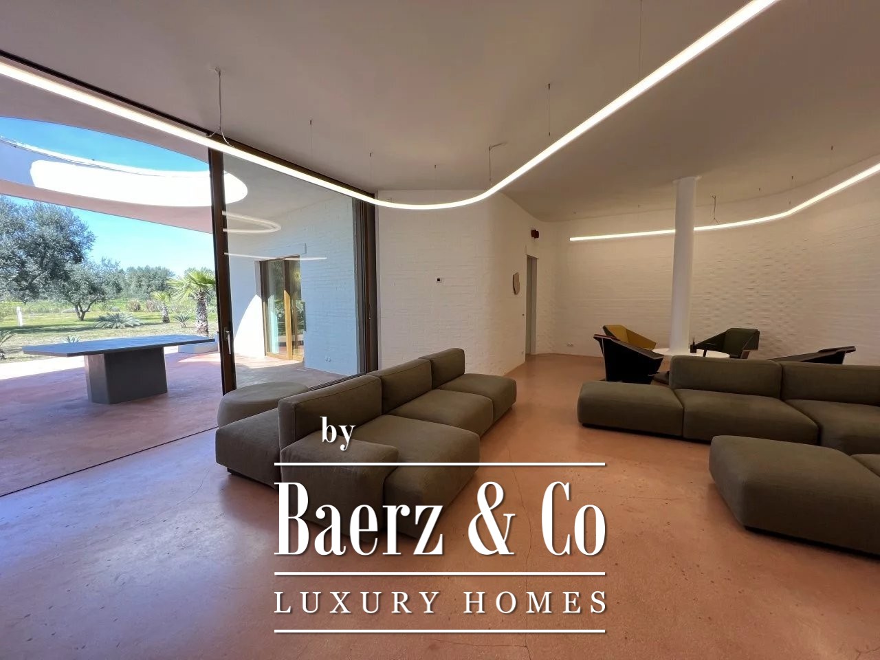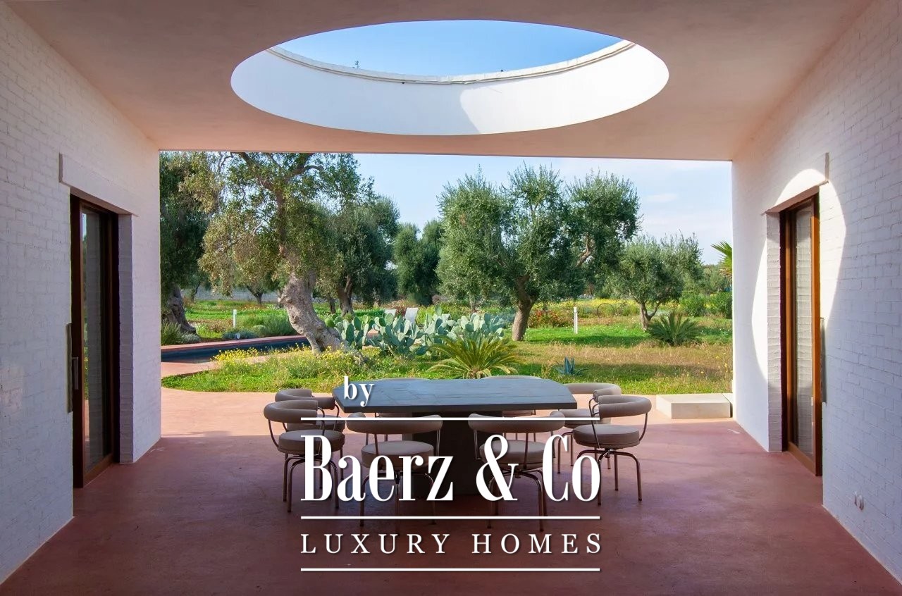 Villa Carovigno stands immersed in a 2.5 hectare olive grove, capturing a refined sense of rural privacy only minutes from the beach and local amenities. This villa Carovigno is newly built, crafted with a focus on clean modernity and sculptural presence. The living spaces find rhythm in an open plan centered by a luminous gathering room, where curved walls and a fireplace create calm. Four distinct bedrooms include two master suites and two junior suites, each with its own bathroom, ensuring both comfort and seclusion.